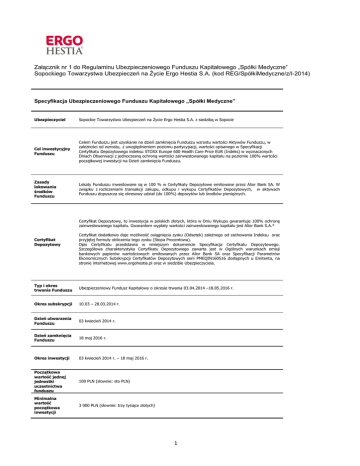 Załącznik nr 1 do Regulaminu Ubezpieczeniowego Funduszu Kapitałowego „Spółki Medyczne” Sopockiego Towarzystwa Ubezpieczeń na Życie Ergo Hestia S.A. (kod REG/SpółkiMedyczne/z/I-2014) Specyfikacja Ubezpieczeniowego Funduszu Kapitałowego „Spółki Medyczne” Ubezpieczyciel Sopockie Towarzystwo Ubezpieczeń na Życie Ergo Hestia S.A. z siedzibą w Sopocie Cel inwestycyjny Funduszu Celem Funduszu jest uzyskanie na dzień zamknięcia Funduszu wzrostu wartości Aktywów Funduszu, w zależności od wzrostu, z uwzględnieniem poziomu partycypacji, wartości opisanego w Specyfikacji Certyfikatu Depozytowego indeksu STOXX Europe 600 Health Care Price EUR (Indeks) w wyznaczonych Dniach Obserwacji z jednoczesną ochroną wartości zainwestowanego kapitału na poziomie 100% wartości początkowej inwestycji na Dzień zamknięcia Funduszu. Zasady lokowania środków Funduszu Lokaty Funduszu inwestowane są w 100 % w Certyfikaty Depozytowe emitowane przez Alior Bank SA. W związku z rozliczeniami transakcji zakupu, odkupu i wykupu Certyfikatów Depozytowych, w aktywach Funduszu dopuszcza się okresowy udział (do 100%) depozytów lub środków pieniężnych. Certyfikat Depozytowy, to inwestycja w polskich złotych, która w Dniu Wykupu gwarantuje 100% ochronę zainwestowanego kapitału. Gwarantem wypłaty wartości zainwestowanego kapitału jest Alior Bank S.A.* Certyfikat Depozytowy Certyfikat dodatkowo daje możliwość osiągnięcia zysku (Odsetek) zależnego od zachowania Indeksu oraz przyjętej formuły obliczenia tego zysku (Stopa Procentowa). Opis Certyfikatu przedstawia w niniejszym dokumencie Specyfikacja Certyfikatu Depozytowego. Szczegółowa charakterystyka Certyfikatu Depozytowego zawarta jest w Ogólnych warunkach emisji bankowych papierów wartościowych emitowanych przez Alior Bank SA oraz Specyfikacji Parametrów Ekonomicznych Subskrypcji Certyfikatów Depozytowych serii PMEQIN160516 dostępnych u Emitenta, na stronie internetowej www.ergohestia.pl oraz w siedzibie Ubezpieczyciela. Typ i okres trwania Funduszu Ubezpieczeniowy Fundusz Kapitałowy o okresie trwania 03.04.2014 –18.05.2016 r. Okres subskrypcji 10.03 – 28.03.2014 r. Dzień utworzenia Funduszu 03 kwiecień 2014 r. Dzień zamknięcia Funduszu 18 maj 2016 r. Okres inwestycji 03 kwiecień 2014 r. – 18 maj 2016 r. Początkowa wartość jednej jednostki uczestnictwa funduszu 100 PLN (słownie: sto PLN) Minimalna wartość początkowa inwestycji 3 000 PLN (słownie: trzy tysiące złotych) 1 Minimalna ilość umarzanych jednostek uczestnictwa 30 jednostek uczestnictwa Zarządzający Funduszem Podmiot uprawniony na podstawie powszechnie obowiązujących przepisów prawa do zarządzania aktywami na zlecenie Ryzyka związane z inwestycją w Fundusz Inwestowanie w Fundusz wiąże się między innymi z następującymi ryzykami: • Ryzyko Inwestycyjne - poziom ryzyka inwestycyjnego Funduszu jest tożsamy z ryzykiem inwestycyjnym Certyfikatów Depozytowych, w które lokowane są Aktywa Funduszu. Ze względu na ryzyko płynności oraz ryzyko kredytowe Emitenta Certyfikatów Depozytowych, Ubezpieczyciel nie gwarantuje ochrony kapitału zarówno w Okresie inwestycji jak i na jej koniec, określonej na poziomie 100% wartości początkowej inwestycji. • Ryzyko zmiany cen - z uwagi na charakter kształtowania się cen Certyfikatów Depozytowych, cena jednostki uczestnictwa Funduszu może ulegać istotnym zmianom w Okresie inwestycji. • Ryzyko nie osiągnięcia zysku z inwestycji, gdyż końcowe oprocentowanie Certyfikatów Depozytowych, a co za tym idzie możliwy wynik inwestycyjny Funduszu, nie jest z góry ustalony. Należy wziąć pod uwagę fakt, że zysk z inwestycji może być niższy niż oczekiwany lub nie wystąpić wcale • Ryzyko osiągnięcia stopy zwrotu niższej niż ewentualny wzrost wartości Indeksu – z uwagi na przyjętą formułę (Stopa Procentowa), stopa zwrotu z Funduszu nie będzie odzwierciedlała zachowania Indeksu. Należy wziąć pod uwagę fakt, że wartość wypłaty (ostateczna stopa zwrotu z Funduszu) zależy od ceny odkupu/wartości wykupu Certyfikatu Depozytowego otrzymanej od Emitenta. • Ryzyko utraty części zainwestowanego kapitału Emitent Certyfikatów Depozytowych zapewnia 100% ochronę kapitału tylko w Dniu Wykupu Certyfikatu. Ochrona kapitału dotyczy tylko Wartości początkowej inwestycji (nie obejmuje zapłaconej opłaty początkowej). W przypadku wycofania środków przed końcem okresu inwestycji istnieje ryzyko utraty części zainwestowanych środków. • Ryzyko kredytowe Emitenta - całość zobowiązania płatniczego z tytułu Certyfikatów Depozytowych w okresie do Dnia Wykupu (włącznie) ciąży na Alior Bank Spółka Akcyjna, dlatego Klient powinien przed podjęciem decyzji o rozpoczęciu inwestycji ocenić wiarygodność kredytową Emitenta. • Ryzyko kredytowe Ubezpieczyciela – zobowiązania z tytułu umowy ubezpieczenia ciążą na STUnŻ Ergo Hestia SA, dlatego Klient powinien przed podjęciem decyzji o przystąpieniu do umowy ubezpieczenia ocenić wiarygodność kredytową Ubezpieczyciela. • Ryzyko wypłaty świadczenia ubezpieczeniowego w kwocie niższej niż wartość początkowa inwestycji • Ryzyko płynności – w zakresie obrotu wtórnego Certyfikatami Depozytowymi i ich wykupu, istnieje ryzyko opóźnienia lub braku realizacji transakcji odkupu/wykupu Certyfikatów Depozytowych przez Emitenta • Ryzyko ograniczonej płynności związane z tygodniowym, a od 9 kwietnia 2014 miesięcznym cyklem umorzeń jednostek uczestnictwa Funduszu. • Ryzyko braku uzyskania Ceny odkupu Certyfikatu Depozytowego od Emitenta w uzgodnionym terminie, co może powodować opóźnienia w przyjętych do realizacji wnioskach uprawnionych o wypłatę świadczenia lub wnioskach Ubezpieczających o wykup jednostek uczestnictwa Funduszu. • Ryzyko likwidacji lub zmiany Indeksu - jeżeli nastąpi stałe zaprzestanie publikowania wartości Indeksu (a Emitent nie zas