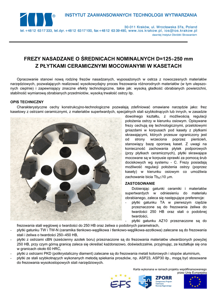 FREZY NASADZANE O ŚREDNICACH NOMINALNYCH D=125÷250 mm Z PŁYTKAMI CERAMICZNYMI MOCOWANYMI W KASETACH Opracowanie stanowi nową rodzinę frezów nasadzanych, wyposażonych w ostrza z nowoczesnych materiałów narzędziowych, pozwalających realizować wysokowydajny proces frezowania różnorodnych materiałów (w tym ulepszonych cieplnie) i zapewniający znaczne efekty technologiczne, takie jak: wysoką gładkość obrabianych powierzchni, stabilność wymiarową obrabianych przedmiotów, wysoką trwałość ostrzy itp. OPIS TECHNICZNY Charakterystyczne cechy konstrukcyjno-technologiczne pozwalają zdefiniować omawiane narzędzie jako: frez kasetowy z ostrzami ceramicznymi, z materiałów supertwardych, specjalnych stali szybkotnących lub innych, w zasadzie dowolnego kształtu, z możliwością regulacji położenia ostrzy w kierunku osiowym. Opisywane frezy cechują się technologicznymi, przelotowymi gniazdami w korpusach pod kasety z płytkami skrawającymi, których przesuw ograniczony jest od strony wrzeciona poprzez pierścień, stanowiący bazę oporową kaset. Z uwagi na konieczność zachowania płytek podporowych (przy płytkach ceramicznych), płytki skrawające mocowane są w korpusie oprawki za pomocą śrub dociskowych wg systemu - C. Frezy posiadają możliwość regulacji położenia ostrzy (poprzez kasety) w kierunku osiowym co umożliwia zachowanie bicia Tbo≤10 µm. - - ZASTOSOWANIE Dobierając gatunki ceramiki i materiałów supertwardych w odniesieniu do materiału obrabianego, zaleca się następujące preferencje: - płytki gatunku TA w pierwszym rzędzie przeznaczone są do frezowania żeliwa do twardości 250 HB oraz stali o podobnej twardości, - płytki gatunku AZ10 przeznaczone są do frezowania stali węglowej o twardości do 250 HB oraz żeliwa o podobnych parametrach, płytki gatunku TW i TW-N (ceramika tlenkowo-węglikowa i tlenkowo-węglikowa-azotkowa) zalecane są do frezowania stali i żeliwa o twardości 250÷450 HB, płytki z ostrzami cBN (sześcienny azotek boru) przeznaczone są do frezowania materiałów utwardzonych powyżej 250 HB, przy czym górną granicę zaleca się określać każdorazowo, doświadczalnie, przyjmując, ze kształtuje się ona w granicach około 60 HRC, płytki z ostrzami PKD (polikrystaliczny diament) zalecane są do frezowania metali kolorowych i stopów aluminium, płytki ze stali szybkotnących wykonanych metodą spiekania proszków, np. ASP23, ASP30 itp., mogą być stosowane do frezowania wysokostopowych stali narzędziowych. Karta wykonana w ramach projektu współfinansowanego przez Unię Europejską ZALETY I EFEKTY STOSOWANIA FREZÓW KASETOWYCH Możliwość realizacji bardzo wydajnej obróbki gładkościowej - Ra=0,5÷1,2 µm, w tym również materiałów utwardzonych, Wydajna obróbka z maksymalnym posuwem ft=1500÷2000 mm/min, z zachowaniem dużej trwałości oraz stabilności wymiarowej obrabianych elementów, Duża uniwersalność frezów polegająca na stosowaniu na jednym korpusie różnych kaset, umożliwiających wykorzystanie płytek różnego kształtu (trójkąt, kwadrat, okrąg) i z różnych materiałów narzędziowych (zarówno ceramiki i materiałów supertwardych, jak również węglików spiekanych, zwłaszcza z naniesionymi warstwami twardymi typu TiN). Uniwersalność narzędzia zwiększa zakres jego zastosowania do różnych operacji technologicznych, System regulacji położenia ostrzy kaset ułatwia realizację obróbki gładkościowej. Możliwa jest wymiana kompletów kaset oraz korekta położenia ostrzy płytek o mniejszej dokładności, Wyważenie dynamiczne frezów kasetowych podnosi stabilność ich pracy w zakresie dużych prędkości skrawania, wpływając korzystnie na efekty realizowanego procesu obróbki. ASORTYMENT Asortyment zalecanych frezów kasetowych obejmuje narzędzia w zakresie wymiarowym D=125÷250 mm o przykładowych wymiarach przedstawionych w poniższej tablicy, Wymienne komplety kaset mogą być wyposażone w płytki o przekroju trójkątnym – TNGN 1604rr, kwadratowe – SNGN 1204rr, kołowym – RNGN 120400, W pierwszej kolejności preferowane są płytki ceramiczne gatunku: TA, AZ10, TW i TW-N. D d1 d2 d3 d4 l z 125 40 56 90 - 73 6 160 40 56 90 14 73 8 200 60 65 130 18 73 12 250 60 65 130 18 73 16 Karta wykonana w ramach projektu współfinansowanego przez Unię Europejską