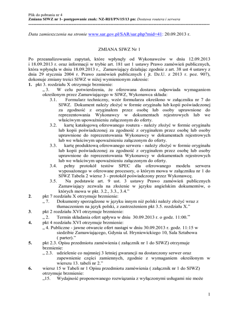 Plik do pobrania nr 4 Zmiana SIWZ nr 1- postępowanie znak: NZ-RI/I/PN/15/13 pn: Dostawa routera i serwera ----------------------------------------------------------------------------------------------------------------Data zamieszczenia na stronie www.sar.gov.pl/SAR/sar.php?mid=41: 20.09.2013 r. ZMIANA SIWZ Nr 1 Po przeanalizowaniu zapytań, które wpłynęły od Wykonawców w dniu 12.09.2013 i 18.09.2013 r. oraz informacji w trybie art. 181 ust 1 ustawy Prawo zamówień publicznych, która wpłynęła w dniu 18.09.2013 r., Zamawiający działając zgodnie z art. 38 ust 4 ustawy z dnia 29 stycznia 2004 r. Prawo zamówień publicznych ( jt. Dz.U. z 2013 r. poz. 907), dokonuje zmiany treści SIWZ w niżej wymienionym zakresie: 1. pkt 3. rozdziału X otrzymuje brzmienie: „ 3. W celu potwierdzenia, że oferowana dostawa odpowiada wymaganiom określonym przez Zamawiającego w SIWZ, Wykonawca składa: 3.1. Formularz techniczny, wzór formularza określono w załączniku nr 7 do SIWZ. Dokument należy złożyć w formie oryginału lub kopii poświadczonej za zgodność z oryginałem przez osobę lub osoby uprawnione do reprezentowania Wykonawcy w dokumentach rejestrowych lub we właściwym upoważnieniu załączonym do oferty. 3.2. kartę katalogową oferowanego routera - należy złożyć w formie oryginału lub kopii poświadczonej za zgodność z oryginałem przez osobę lub osoby uprawnione do reprezentowania Wykonawcy w dokumentach rejestrowych lub we właściwym upoważnieniu załączonym do oferty. 3.3. kartę produktową oferowanego serwera - należy złożyć w formie oryginału lub kopii poświadczonej za zgodność z oryginałem przez osobę lub osoby uprawnione do reprezentowania Wykonawcy w dokumentach rejestrowych lub we właściwym upoważnieniu załączonym do oferty. 3.4. pełny protokół testów SPEC dla oferowanego modelu serwera wyposażonego w oferowane procesory, o którym mowa w załączniku nr 1 do SIWZ Tabela 2 wiersz 3 - protokół poświadczony przez Wykonawcę. 3.5. Na podstawie art. 9 ust. 3 ustawy Prawo zamówień publicznych Zamawiający zezwala na złożenie w języku angielskim dokumentów, o których mowa w pkt. 3.2., 3.3., 3.4.” 2. pkt 7 rozdziału X otrzymuje brzmienie: „ 7. Dokumenty sporządzone w języku innym niż polski należy złożyć wraz z tłumaczeniem na język polski, z zastrzeżeniem pkt 3.5. rozdziału X.” 3. pkt 2 rozdziału XVI otrzymuje brzmienie: „ 2. Termin składania ofert upływa w dniu 30.09.2013 r. o godz. 11:00.” 4. pkt 4 rozdziału XVI otrzymuje brzmienie: „ 4. Publiczne - jawne otwarcie ofert nastąpi w dniu 30.09.2013 r. godz. 11:15 w siedzibie Zamawiającego, Gdynia ul. Hryniewickiego 10, Sala Sztabowa ( parter).” 5. pkt 2.3. Opisu przedmiotu zamówienia ( załącznik nr 1 do SIWZ) otrzymuje brzmienie: „ 2.3. udzielenie co najmniej 3 letniej gwarancji na dostarczony serwer oraz zapewnienie części zamiennych, zgodnie z wymaganiem określonym w wierszu 13. tabeli nr 2.” 6. wiersz 15 w Tabeli nr 1 Opisu przedmiotu zamówienia ( załącznik nr 1 do SIWZ) otrzymuje brzmienie: „15. Wydajność proponowanego rozwiązania z wyłączonymi usługami nie może 1 Plik do pobrania nr 4 Zmiana SIWZ nr 1- postępowanie znak: NZ-RI/I/PN/15/13 pn: Dostawa routera i serwera ----------------------------------------------------------------------------------------------------------------być mniejsza niż 800 000 PPS” 7. wiersz 58. w Tabeli nr 1 Opisu przedmiotu zamówienia ( załącznik nr 1 do SIWZ) otrzymuje brzmienie: „ 58. Router i wszystkie elementy, z których jest on zbudowany muszą być objęte co najmniej 3 letnią gwarancją- wymagane oświadczenie wykonawcy” 8. wiersz 59. w Tabeli nr 1 Opisu przedmiotu zamówienia ( załącznik nr 1 do SIWZ) otrzymuje brzmienie: „ 59. Router musi być fabrycznie nowy, pochodzić z oficjalnego kanału dystrybucyjnego w Polsce lub pochodzić z kanału sprzedaży producenta w Unii Europejskiej i musi być objęty gwarancją w zakresie zgodnym z wymaganiami Zamawiającego.” 9. 10. 11. 12. 13. wiersz 2 Tabeli nr 2 pkt. 2 Opisu przedmiotu zamówienia ( załącznik nr 1 do SIWZ) otrzymuje brzmienie: ” 2. Minimum 7 złącz PCI Express generacji 3 w tym minimum 1 złącze o prędkości x16 i 5 złącz o prędkości x8” wiersz 3 Tabeli nr 2 Opisu przedmiotu zamówienia ( załącznik nr 1 do SIWZ) otrzymuje brzmienie: „1. Zainstalowany jeden procesor 6-rdzeniowy w architekturze x86 osiągający w oferowanym serwerze w testach wydajności SPECint_rate2006 min. 201 pkt; zamawiający dopuszcza wynik testu dla serwera wyposażonego w 2 oferowane procesory. Zamawiający dopuszcza wynik testu SPECint_rate2006 dla serwera wyposażonego w 2 oferowane procesory o wartości nie niższej niż 392 pkt. 2. Wymagane dołączenie do oferty pełnego protokołu testów SPEC dla oferowanego modelu serwera wyposażonego w oferowane procesory, protokół poświadczony przez Wykonawcę; „ w Tabeli nr 2 Opisu przedmiotu zamówienia ( załącznik nr 1 do SIWZ) skreśla się wiersz 7 Inne napędy zintegrowane. Wskutek tego wiersze od 8-15 oznacza się odpowiednio cyframi 7, 8, 9, 10,11,12,13 i 14. pkt 2 w wierszu 9 Tabeli nr 2 Opisu przedmiotu zamówienia ( załącznik nr 1 do SIWZ) otrzymuje brzmienie: „2 5x USB 2.0, w tym minimum 2 na panelu przednim, minimum 1 wewnętrzny.” pkt 1 i 2 w wierszu 14 Tabeli nr 2 Opisu przedmiotu zamówienia ( załącznik nr 1 do SIWZ) otrzymuje brzmienie: „ 1. Serwer i wszystkie elementy, z których jest on zbudowany muszą być objęte co najmniej 3 letnią gwarancją- wymagane oświadczenie wykonawcy. 2. 14. 15. Serwer musi być fabrycznie nowy, pochodzić z oficjalnego kanału dystrybucyjnego w Polsce lub pochodzić z kanału sprzedaży producenta w Unii Europejskiej i musi być objęty gwarancją w zakresie zgodnym z wymaganiami Zamawiającego.” pkt 4 w wierszu 14 Tabeli nr 2 Opisu przedmiotu zamówienia ( załącznik nr 1 do SIWZ) otrzymuje brzmienie: