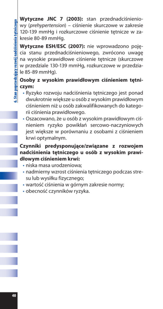 6. Stan poprzedzający rozwój nadciśnienia tętniczego 40 Wytyczne JNC 7 (2003): stan przednadciśnieniowy (prehypertension) – ciśnienie skurczowe w zakresie 120-139 mmHg i rozkurczowe ciśnienie tętnicze w zakresie 80-89 mmHg. Wytyczne ESH/ESC (2007): nie wprowadzono pojęcia stanu przednadciśnieniowego, zwrócono uwagę na wysokie prawidłowe ciśnienie tętnicze (skurczowe w przedziale 130-139 mmHg, rozkurczowe w przedziale 85-89 mmHg). Osoby z wysokim prawidłowym ciśnieniem tętniczym: • Ryzyko rozwoju nadciśnienia tętniczego jest ponad dwukrotnie większe u osób z wysokim prawidłowym ciśnieniem niż u osób zakwalifikowanych do kategorii ciśnienia prawidłowego. • Oszacowano, że u osób z wysokim prawidłowym ciśnieniem ryzyko powikłań sercowo-naczyniowych jest większe w porównaniu z osobami z ciśnieniem krwi optymalnym. Czynniki predysponujące/związane z rozwojem nadciśnienia tętniczego u osób z wysokim prawidłowym ciśnieniem krwi: • niska masa urodzeniowa; • nadmierny wzrost ciśnienia tętniczego podczas stresu lub wysiłku fizycznego; • wartość ciśnienia w górnym zakresie normy; • obecność czynników ryzyka. Tabela 6.1 Częstość rozwoju nadciśnienia tętniczego w badaniu Framingham. Optymalne ciśnienie tętnicze Prawidłowe ciśnienie tętnicze Wysokie prawidłowe ciśnienie tętnicze Odsetek osób, u których doszło do rozwoju nadciśnienia tętniczego w ciągu 4 lat Mężczyźni, Mężczyźni, Kobiety, Kobiety, wiek 35-64 wiek 65-74 wiek 35-64 wiek 65-94 lata lata lata lata 5 15 5 16 18 25 12 26 37 47 37 49 Diagnostyka Wysokość ciśnienia tętniczego (wyjściowa) Na podstawie: Vasan R.S., Larson M.G., Leip E.P. i wsp.: Assessment of frequency of progression to hypertension in non-hypertensive participants in the Framingham Heart Study: a cohort study. Lancet 2001a; 358: 1682-1686. Źródło: Kaplan N.M.: Kaplan’s clinical hypertension. LW&W, 2006, wyd. 9. Tabela 6.2 Czteroletnia częstość rozwoju nadciśnienia tętniczego u osób z wysokim prawidłowym, prawidłowym i optymalnym ciśnieniem tętniczym. Badanie Flemish Study on Environment, Genes and Health Outcomes. Opracowano na podstawie: Zhang H. i wsp., J Hypertens 2006. Optymalne ciśnienie Prawidłowe ciśnienie Wysokie prawidłowe ciśnienie <50 lat 7,4% 17,9% 24,5% ≥50 lat 16,4% 26,3% 54% 41 Wysokie prawidłowe 12 10 Prawidłowe Łączna częstość (%) 6. Stan poprzedzający rozwój nadciśnienia tętniczego Mężczyźni 14 8 6 Optymalne 4 2 0 0 2 4 6 8 10 12 14 Czas (lata) Liczba chorych Optymalne Prawidłowe Wysokie prawidłowe 1005 1059 903 995 1039 879 973 1012 857 962 982 819 934 952 795 892 892 726 454 520 441 Ryc. 6.1. Częstość występowania zdarzeń sercowo-naczyniowych wśród mężczyzn włączonych do badania Framingham Heart Study z wyjściowymi wartościami ciśnienia tętniczego klasyfikowanymi jako optymalne (poniżej 120/80 mmHg), prawidłowe (120-129/80-84 mmHg) lub wysokie prawidłowe (130-139/85-89 mmHg) w okresie 12 lat obserwacji. (Zmodyfikowano na podstawie: Vasan R.S., Larson M.G., Leip E.P. i wsp.: Impact of high-normal blood pressure no the risk of cardiovascular disease. N Eng J Med 2001b; 345: 1291-1297). Źródło: Kaplan N.M.: Kaplan’s clinical hypertension. LW&W, 2006, wyd. 9. Kobiety 10 Wysokie prawidłowe Częstość zdarzeń (%) 8 6 4 Prawidłowe 2 Optymalne 0 0 2 4 6 8 10 12 14 Czas (lata) Ryc. 6.2. Badanie Framingham. Częstość występowania zdarzeń sercowo-naczyniowych u kobiet z ciśnieniem optymalnym, prawidłowym i wysokim prawidłowym. Opracowano na podstawie: Vasan R.S. i wsp., N Engl J Med 2001. 42