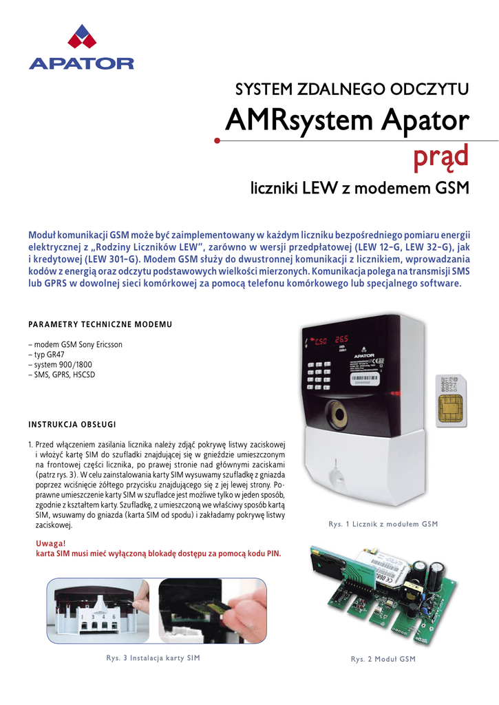SYSTEM ZDALNEGO ODCZYTU AMRsystem Apator prąd liczniki LEW z modemem GSM Moduł komunikacji GSM może być zaimplementowany w każdym liczniku bezpośredniego pomiaru energii elektrycznej z „Rodziny Liczników LEW”, zarówno w wersji przedpłatowej (LEW 12-G, LEW 32-G), jak i kredytowej (LEW 301-G). Modem GSM służy do dwustronnej komunikacji z licznikiem, wprowadzania kodów z energią oraz odczytu podstawowych wielkości mierzonych. Komunikacja polega na transmisji SMS lub GPRS w dowolnej sieci komórkowej za pomocą telefonu komórkowego lub specjalnego software. PARAMETRY TECHNICZNE MODEMU – modem GSM Sony Ericsson – typ GR47 – system 900/1800 – SMS, GPRS, HSCSD INSTRUKCJA OBSŁUGI 1. Przed włączeniem zasilania licznika należy zdjąć pokrywę listwy zaciskowej i włożyć kartę SIM do szufladki znajdującej się w gnieździe umieszczonym na frontowej części licznika, po prawej stronie nad głównymi zaciskami (patrz rys. 3). W celu zainstalowania karty SIM wysuwamy szufladkę z gniazda poprzez wciśnięcie żółtego przycisku znajdującego się z jej lewej strony. Poprawne umieszczenie karty SIM w szufladce jest możliwe tylko w jeden sposób, zgodnie z kształtem karty. Szufladkę, z umieszczoną we właściwy sposób kartą SIM, wsuwamy do gniazda (karta SIM od spodu) i zakładamy pokrywę listwy zaciskowej. Rys. 1 Licznik z modułem GSM Uwaga! karta SIM musi mieć wyłączoną blokadę dostępu za pomocą kodu PIN. Rys. 3 Instalacja karty SIM Rys. 2 Moduł GSM 2. Włączamy licznik do sieci. 3. Po podłączeniu licznika następuje aktywacja modemu i zalogowanie się do sieci GSM. 4. W pierwszej kolejności zapalają się dwie czerwone diody LED, umieszczone z prawej strony licznika (patrz rys. 1). Pierwsza z nich (dolna) sygnalizuje działanie modemu, a druga (górna) informuje, czy licznik jest zalogowany do sieci GSM. 5. Po upływie około 20 sekund od włączenia zasilania górna dioda LED powinna zacząć błyskać z częstotliwością około 1 błyśnięcia na sekundę. Jest to znak, że modem jest zalogowany i gotowy do pracy. W przypadku, gdy dioda LED świeci światłem ciągłym lub nie świeci – modem nie został zalogowany do sieci. Powodem takiej sytuacji może być aktualny brak dostępu do sieci GSM lub wadliwa karta SIM. 6. Po zalogowaniu modemu do sieci GSM, odczekać 30 sekund. 7. Odczyt licznika za pośrednictwem smsa: – próbę odczytu licznika wykonujemy przez wysłanie smsa o treści „X.READ” z dowolnego telefonu komórkowego. W pozycję „X” należy wpisać jedną z liter (E, P, G), które odpowiadają wersji językowej otrzymanego smsa z licznika. Litera P oznacza odpowiedź w języku polskim, G – niemieckim, E – angielskim, – około 5 sekund od wysłania smsa można zaobserwować zwiększenie częstotliwości migania górnej diody LED – jest to znak, że sms dotarł do licznika, – po wysłaniu zapytania, modem GSM powinien odpowiedzieć smsem (patrz rys. 4) zawierającym pełną datę oraz godzinę odczytu, wartości napięć w kolejnych fazach (jednostka „V” – volt), wartości prądów w kolejnych fazach (jednostka „A” – amper) oraz całkowitą energię (jednostka kWh – kilowatogodzina). Rys. 4 Format wiadomości tekstowej Uwaga! W smsie, który umożliwia wprowadzenie kodu do licznika, należy zwrócić baczną uwagę na występowanie spacji pomiędzy słowem CODE oraz pomiędzy sekwencjami czterech cyfr. 8. Wprowadzenie kodu za pośrednictwem smsa: – kod do licznika LEW wprowadzamy przez wysłanie smsa o treści „X.CODE xxxx xxxx xxxx xxxx xxxx”, gdzie znaki „x” oznaczają kolejne cyfry kodu, natomiast w pozycji „X” należy wpisać jedną z liter (E, P, G), które odpowiadają wersji językowej otrzymanego smsa z licznika, np. „P.CODE 1234 5678 9012 3456”. Litera P oznacza odpowiedź w języku polskim, G – niemieckim, E – angielskim. Podobnie jak w przypadku odczytu licznika, podczas wysyłania smsa górna dioda LED zaczyna błyskać z większą częstotliwością. Przesłanie kodu jest sygnalizowane wysłaniem zwrotnego smsa o treści: • „Dobry” – kod poprawny, przyjęty, • „Zły” – kod nie jest wygenerowany do danego numeru licznika lub był już wcześniej wprowadzony. Uwaga! Wszystkie polecenia wysyłane smsami muszą być pisane dużymi literami. Nie należy wyjmować karty SIM z licznika podczas załączonego zasilania. 87-100 Toruń, ul. Żółkiewskiego 21/29 Tel.: (056) 61 91 265, 61 91 156, Fax: (056) 61 91 295 e-mail: [email protected] http://www.apator.com.pl