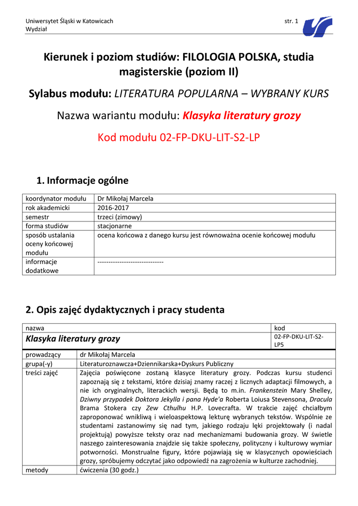 Uniwersytet Śląski w Katowicach Wydział str. 1 Kierunek i poziom studiów: FILOLOGIA POLSKA, studia magisterskie (poziom II) Sylabus modułu: LITERATURA POPULARNA – WYBRANY KURS Nazwa wariantu modułu: Klasyka literatury grozy Kod modułu 02-FP-DKU-LIT-S2-LP 1. Informacje ogólne koordynator modułu rok akademicki semestr forma studiów sposób ustalania oceny końcowej modułu informacje dodatkowe Dr Mikołaj Marcela 2016-2017 trzeci (zimowy) stacjonarne ocena końcowa z danego kursu jest równoważna ocenie końcowej modułu ------------------------------ 2. Opis zajęć dydaktycznych i pracy studenta nazwa kod Klasyka literatury grozy 02-FP-DKU-LIT-S2LP5 prowadzący grupa(-y) treści zajęć metody dr Mikołaj Marcela Literaturoznawcza+Dziennikarska+Dyskurs Publiczny Zajęcia poświęcone zostaną klasyce literatury grozy. Podczas kursu studenci zapoznają się z tekstami, które dzisiaj znamy raczej z licznych adaptacji filmowych, a nie ich oryginalnych, literackich wersji. Będą to m.in. Frankenstein Mary Shelley, Dziwny przypadek Doktora Jekylla i pana Hyde'a Roberta Loiusa Stevensona, Dracula Brama Stokera czy Zew Cthulhu H.P. Lovecrafta. W trakcie zajęć chciałbym zaproponować wnikliwą i wieloaspektową lekturę wybranych tekstów. Wspólnie ze studentami zastanowimy się nad tym, jakiego rodzaju lęki projektowały (i nadal projektują) powyższe teksty oraz nad mechanizmami budowania grozy. W świetle naszego zainteresowania znajdzie się także społeczny, polityczny i kulturowy wymiar potworności. Monstrualne figury, które pojawiają się w klasycznych opowieściach grozy, spróbujemy odczytać jako odpowiedź na zagrożenia w kulturze zachodniej. ćwiczenia (30 godz.) Uniwersytet Śląski w Katowicach Wydział prowadzenia zajęć liczba godzin dydaktycznych (kontaktowych) liczba godzin pracy własnej studenta opis pracy własnej studenta organizacja zajęć literatura obowiązkowa literatura uzupełniająca str. 2 30 60 Przygotowanie do zajęć, obejmujące zalecone lektury literackie i krytycznoliterackie. Przygotowanie pisemnej pracy zaliczeniowej w postaci krótkiego opowiadania grozy. 1. E.T.A. Hoffmann, Piaskun 2. Mary Shelley, Frankenstein 3. William Polidori, Wampir 4. Robert L. Stevenson, Doktor Jekyll i pan Hyde 5. Sheridan Le Fanu, Carmilla 6. Bram Stoker, Dakula 7. M.R. James, Zagwiżdż, a przyjdę do Ciebie, mój chłopcze 8. H.P. Lovecraft, Zew Cthulhu 1. Maria Janion, Wampir. Biografia symboliczna 2. Noël Carroll, Filozofia horroru 3. Anna Gemra, Od gotycyzmu do horroru. Wilkołak, wampir i Monstrum Frankensteina w wybranych utworach 4. Mikołaj Marcela, Monstruarium nowoczesne adres strony www zajęć informacje dodatkowe 3. Opis sposobów weryfikacji efektów kształcenia modułu nazwa kod Klasyka literatury grozy 02-FP-DKU-LIT-S2-LP5 kod zajęć osoba przeprowadzająca weryfikację grupa wymagania merytoryczne kryteria oceny przebieg procesu weryfikacji informacje dodatkowe --------------------dr Mikołaj Marcela Literaturoznawcza+Dziennikarska+Dyskurs Publiczny Znajomość treści zadanych lektur. Aktywność podczas zajęć, znajomość lektur, pisemna praca zaliczeniowa Ocena na podstawie aktywności i przygotowania do zajęć uzupełniona o ocenę z pisemnej pracy zaliczeniowej; pracę oddajemy najpóźniej na przedostatnich zajęcia w semestrze Uniwersytet Śląski w Katowicach Wydział str. 3