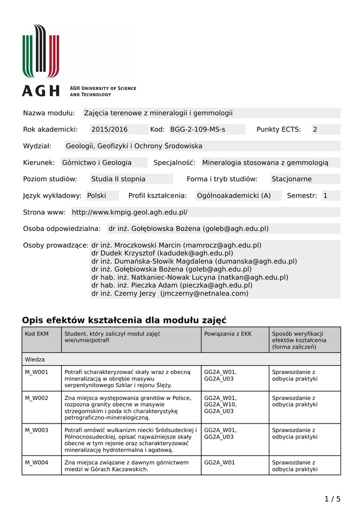 Nazwa modułu: Rok akademicki: Wydział: Kierunek: Zajęcia terenowe z mineralogii i gemmologii 2015/2016 Kod: BGG-2-109-MS-s Punkty ECTS: 2 Geologii, Geofizyki i Ochrony Środowiska Górnictwo i Geologia Poziom studiów: Specjalność: Studia II stopnia Język wykładowy: Polski Mineralogia stosowana z gemmologią Forma i tryb studiów: Profil kształcenia: Ogólnoakademicki (A) Stacjonarne Semestr: 1 Strona www: http://www.kmpig.geol.agh.edu.pl/ Osoba odpowiedzialna: Osoby prowadzące: dr dr dr dr dr dr dr dr inż. Gołębiowska Bożena ([email protected]) inż. Mroczkowski Marcin ([email protected]) Dudek Krzysztof ([email protected]) inż. Dumańska-Słowik Magdalena ([email protected]) inż. Gołębiowska Bożena ([email protected]) hab. inż. Natkaniec-Nowak Lucyna ([email protected]) hab. inż. Pieczka Adam ([email protected]) inż. Czerny Jerzy ([email protected]) Opis efektów kształcenia dla modułu zajęć Kod EKM Student, który zaliczył moduł zajęć wie/umie/potrafi Powiązania z EKK Sposób weryfikacji efektów kształcenia (forma zaliczeń) M_W001 Potrafi scharakteryzować skały wraz z obecną mineralizacją w obrębie masywu serpentynitowego Szklar i rejonu Ślęży. GG2A_W01, GG2A_U03 Sprawozdanie z odbycia praktyki M_W002 Zna miejsca występowania granitów w Polsce, rozpozna granity obecne w masywie strzegomskim i poda ich charakterystykę petrograficzno-mineralogiczną. GG2A_W01, GG2A_W10, GG2A_U03 Sprawozdanie z odbycia praktyki M_W003 Potrafi omówić wulkanizm niecki Śródsudeckiej i Północnosudeckiej, opisać najważniejsze skały obecne w tym rejonie oraz scharakteryzować mineralizację hydrotermalna i agatową. GG2A_W01, GG2A_U03 Sprawozdanie z odbycia praktyki M_W004 Zna miejsca związane z dawnym górnictwem miedzi w Górach Kaczawskich. GG2A_W01 Sprawozdanie z odbycia praktyki Wiedza 1/5 Karta modułu - Zajęcia terenowe z mineralogii i gemmologii M_W005 Potrafi rozpoznać i scharakteryzować mineralizację kruszcową we wschodnim obrzeżeniu metamorficznym granitu karkonoskiego. Zna miejsca związane z dawnym kopalnictwem rud polimineralnych w tym rejonie. GG2A_W01 Sprawozdanie z odbycia praktyki M_W006 Umie rozpoznać granit karkonoski, zna jego charakterystykę wraz z mineralizacją w nim występującą GG2A_W01 Sprawozdanie z odbycia praktyki M_W007 Zna i rozumie najważniejsze pojęcia z zakresu gemmologii, mineralogii, petrografii. GG2A_W01, GG2A_W02 Sprawozdanie M_W008 Ma wiedzę dotyczącą elementów metaloznawstwa i technik zdobniczych stosowanych w jubilerstwie GG2A_W07, GG2A_U01 Sprawozdanie M_W009 Zna podstawowe cechy fizyczne kamieni szlachetnych oraz parametry techniczne skał ozdobnych stosowanych w jubilerstwie GG2A_W01, GG2A_U01 Sprawozdanie M_W010 Zna podstawowe techniki przeróbki plastycznej i obróbki cieplnej metali i ich stopów GG2A_W05, GG2A_W11 Sprawozdanie M_U001 Potrafi zaprojektować wyrób jubilerski korzystając ze specjalistycznego oprogramowania komputerowego GG2A_U03, GG2A_U04, GG2A_K01 Sprawozdanie M_U002 Potrafi wykonać wyrób jubilerski ze stopów metali szlachetnych i oprawić w niego kamień szlachetny lub ozdobny GG2A_U09, GG2A_U15 Sprawozdanie GG2A_K01 Sprawozdanie z odbycia praktyki Umiejętności Kompetencje społeczne M_K001 Potrafi myśleć i działać w sposób kreatywny i przedsiębiorczy Matryca efektów kształcenia w odniesieniu do form zajęć Konwersatori um Zajęcia seminaryjne Zajęcia praktyczne Zajęcia terenowe Zajęcia warsztatowe - - - - - - + - E-learning Ćwiczenia projektowe - Inne Ćwiczenia laboratoryjne Forma zajęć Ćwiczenia audytoryjne Student, który zaliczył moduł zajęć wie/umie/potrafi Wykład Kod EKM Wiedza M_W001 Potrafi scharakteryzować skały wraz z obecną mineralizacją w obrębie masywu serpentynitowego Szklar i rejonu Ślęży. - - 2/5 Karta modułu - Zajęcia terenowe z mineralogii i gemmologii M_W002 Zna miejsca występowania granitów w Polsce, rozpozna granity obecne w masywie strzegomskim i poda ich charakterystykę petrograficznomineralogiczną. - - - - - - - + - - - M_W003 Potrafi omówić wulkanizm niecki Śródsudeckiej i Północnosudeckiej, opisać najważniejsze skały obecne w tym rejonie oraz scharakteryzować mineralizację hydrotermalna i agatową. - - - - - - - + - - - M_W004 Zna miejsca związane z dawnym górnictwem miedzi w Górach Kaczawskich. - - - - - - - + - - - M_W005 Potrafi rozpoznać i scharakteryzować mineralizację kruszcową we wschodnim obrzeżeniu metamorficznym granitu karkonoskiego. Zna miejsca związane z dawnym kopalnictwem rud polimineralnych w tym rejonie. - - - - - - - + - - - M_W006 Umie rozpoznać granit karkonoski, zna jego charakterystykę wraz z mineralizacją w nim występującą - - - - - - - + - - - M_W007 Zna i rozumie najważniejsze pojęcia z zakresu gemmologii, mineralogii, petrografii. - - - - - - - + - - - M_W008 Ma wiedzę dotyczącą elementów metaloznawstwa i technik zdobniczych stosowanych w jubilerstwie - - - - - - - + - - - M_W009 Zna podstawowe cechy fizyczne kamieni szlachetnych oraz parametry techniczne skał ozdobnych stosowanych w jubilerstwie - - - - - - - - - - - M_W010 Zna podstawowe techniki przeróbki plastycznej i obróbki cieplnej metali i ich stopów - - - - - - - - - - - Potrafi zaprojektować wyrób jubilerski korzystając ze specjalistycznego oprogramowania komputerowego - - - - - - - - - - - Umiejętności M_U001 3/5 Karta modułu - Zajęcia terenowe z mineralogii i gemmologii M_U002 Potrafi wykonać wyrób jubilerski ze stopów metali szlachetnych i oprawić w niego kamień szlachetny lub ozdobny - - - - - - - - - - - - - - - - - - - - - - Kompetencje społeczne M_K001 Potrafi myśleć i działać w sposób kreatywny i przedsiębiorczy Treść modułu zajęć (program wykładów i pozostałych zajęć) Zajęcia terenowe - Sposób obliczania oceny końcowej Ocena końcowa = ocena ze sprawozdania z zajęć terenowych Wymagania wstępne i dodatkowe Znajomość podstaw mineralogii, petrogra