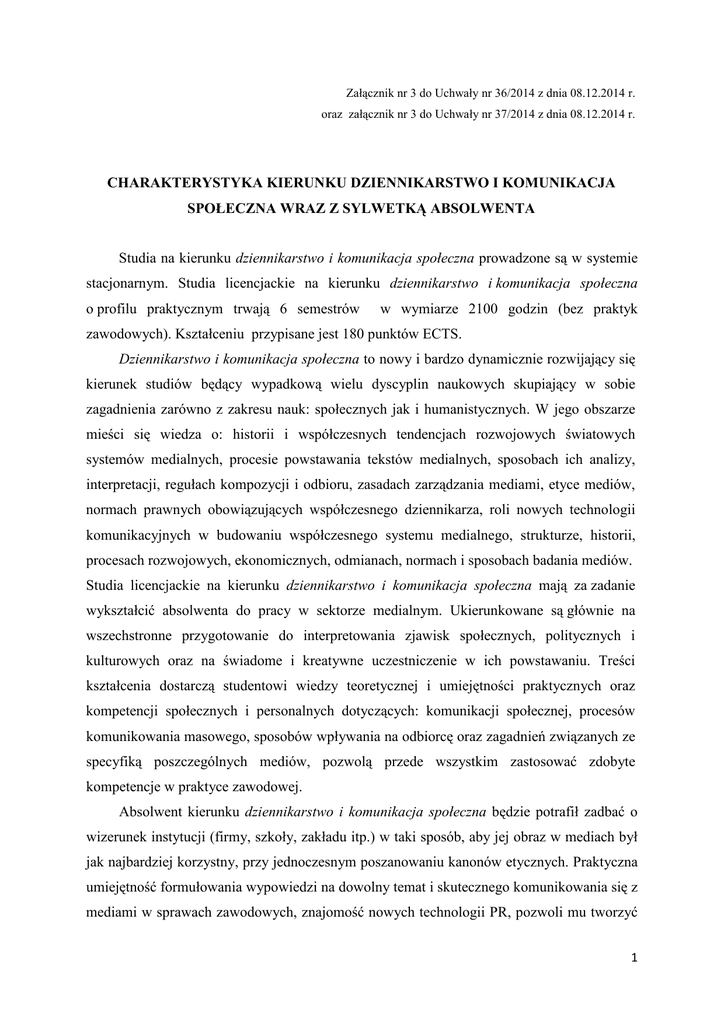 Załącznik nr 3 do Uchwały nr 36/2014 z dnia 08.12.2014 r. oraz załącznik nr 3 do Uchwały nr 37/2014 z dnia 08.12.2014 r. CHARAKTERYSTYKA KIERUNKU DZIENNIKARSTWO I KOMUNIKACJA SPOŁECZNA WRAZ Z SYLWETKĄ ABSOLWENTA Studia na kierunku dziennikarstwo i komunikacja społeczna prowadzone są w systemie stacjonarnym. Studia licencjackie na kierunku dziennikarstwo i komunikacja społeczna o profilu praktycznym trwają 6 semestrów w wymiarze 2100 godzin (bez praktyk zawodowych). Kształceniu przypisane jest 180 punktów ECTS. Dziennikarstwo i komunikacja społeczna to nowy i bardzo dynamicznie rozwijający się kierunek studiów będący wypadkową wielu dyscyplin naukowych skupiający w sobie zagadnienia zarówno z zakresu nauk: społecznych jak i humanistycznych. W jego obszarze mieści się wiedza o: historii i współczesnych tendencjach rozwojowych światowych systemów medialnych, procesie powstawania tekstów medialnych, sposobach ich analizy, interpretacji, regułach kompozycji i odbioru, zasadach zarządzania mediami, etyce mediów, normach prawnych obowiązujących współczesnego dziennikarza, roli nowych technologii komunikacyjnych w budowaniu współczesnego systemu medialnego, strukturze, historii, procesach rozwojowych, ekonomicznych, odmianach, normach i sposobach badania mediów. Studia licencjackie na kierunku dziennikarstwo i komunikacja społeczna mają za zadanie wykształcić absolwenta do pracy w sektorze medialnym. Ukierunkowane są głównie na wszechstronne przygotowanie do interpretowania zjawisk społecznych, politycznych i kulturowych oraz na świadome i kreatywne uczestniczenie w ich powstawaniu. Treści kształcenia dostarczą studentowi wiedzy teoretycznej i umiejętności praktycznych oraz kompetencji społecznych i personalnych dotyczących: komunikacji społecznej, procesów komunikowania masowego, sposobów wpływania na odbiorcę oraz zagadnień związanych ze specyfiką poszczególnych mediów, pozwolą przede wszystkim zastosować zdobyte kompetencje w praktyce zawodowej. Absolwent kierunku dziennikarstwo i komunikacja społeczna będzie potrafił zadbać o wizerunek instytucji (firmy, szkoły, zakładu itp.) w taki sposób, aby jej obraz w mediach był jak najbardziej korzystny, przy jednoczesnym poszanowaniu kanonów etycznych. Praktyczna umiejętność formułowania wypowiedzi na dowolny temat i skutecznego komunikowania się z mediami w sprawach zawodowych, znajomość nowych technologii PR, pozwoli mu tworzyć 1 transparentne przekazy informujące i kształtujące opinię publiczną. Zdobyta teoria, wzmocniona praktykami zawodowymi, pozwoli nie tylko doskonalić kwalifikacje w toku studiów, ale uświadomi potrzebę nieustannego poszerzania własnych kompetencji, takŜe po ich zakończeniu. Da moŜliwość poszerzenia sprawności w zakresie nawiązywania kontaktów ułatwiając absolwentowi zaistnienie na rynku pracy. Kształcenie na kierunku odbywa się w oparciu o najnowsze badania naukowe i współpracę ze środowiskiem lokalnym. Student będzie miał moŜliwość skorzystania z nowoczesnej oferty edukacyjnej oraz dobrze wyposaŜonej bazy dydaktycznej (m.in. zinformatyzowanych sal, studia radiowego, sprzętu telewizyjnego oraz bogatego księgozbioru Biblioteki i Centrum Informacji Naukowej). Osoby niepełnosprawne (z trudnościami narządów ruchu, wzroku i słuchu) mogą wykorzystać niezbędne im narzędzia ułatwiające proces dydaktyczny (pętle indukcyjne, klawiatury itp.). Student zrozumie wagę współpracy z otoczeniem społecznym i gospodarczym, do czego przyczynią się m.in. obowiązkowe trzymiesięczne praktyki zawodowe w instytucjach medialnych i związanych z mediami. Poszerzy i wzmocni kontakty z krajowymi i zagranicznymi ośrodkami naukowymi poprzez realizowany na uczelni Program ERASMUS. Będzie uczestniczył i przygotowywał imprezy, na które zapraszani będą przedstawiciele mediów regionalnych i ogólnopolskich. MoŜe realizować się takŜe w kołach naukowych i zainteresowań. Posiądzie znajomość języka obcego na poziomie biegłości B2 Europejskiego Systemu Opisu Kształcenia Językowego Rady Europy. Ponadto wykaŜe się umiejętnością posługiwania językiem specjalistycznym właściwym dla zakresu kształcenia oraz znajomością nowoczesnych technologii informatycznych. Ponadto absolwent poszerzy kompetencje zawodowe w ramach jednej z dwóch proponowanych specjalności: kreowanie wizerunku lub rzecznictwo prasowe. Celem specjalności kreowanie wizerunku i reklama jest dostarczenie studentom wiedzy i praktycznych umiejętności komunikacyjnych i z zakresu multimedialnych w wykorzystania przestrzeni nowoczesnych wirtualnej, narzędzi niezbędnych w funkcjonowaniu na współczesnym rynku. Oprócz wiedzy i umiejętności w zakresie strategii i narzędzi komunikacji oraz zasad strategicznego wykorzystania elektronicznych narzędzi komunikacji, pozna specyfikę promocji za pośrednictwem socjal mediów, zasady tworzenie treści reklamowych oraz mobilnego marketingu, reguły pomiaru efektywności narzędzi promocji i kreowania wizerunku. Zapozna się z podstawami projektowania kreacji 2 graficznych, metodami badań diagnostycznych, zasadami tworzenia projektów i kampanii oraz tworzenia tzw. „zawartości” internetowej w celach marketingowych i wizerunkowych. Celem specjalności rzecznictwo prasowe jest wykształcenie absolwenta posiadającego rozszerzone umiejętności efektywnej komunikacji w formie zarówno pisemnej jak i ustnej oraz nauczenie współpracy z mediami, a takŜe wykształcenie umiejętności prezentowania treści kształtujących wizerunek przy wykorzystaniu zarówno mediów wewnętrznych, jak i tzw. „własnych”. Absolwent będzie posiadał wiedzę i umiejętności z zakresu zasad efektywnej współpracy z mediami, reguł przygotowania informacji na uŜytek mediów, zasad etyki biznesu oraz miejsca komunikacji wizerunkowej jako elementu zarządzania przedsiębiorstwem, organizacją i instytuc
