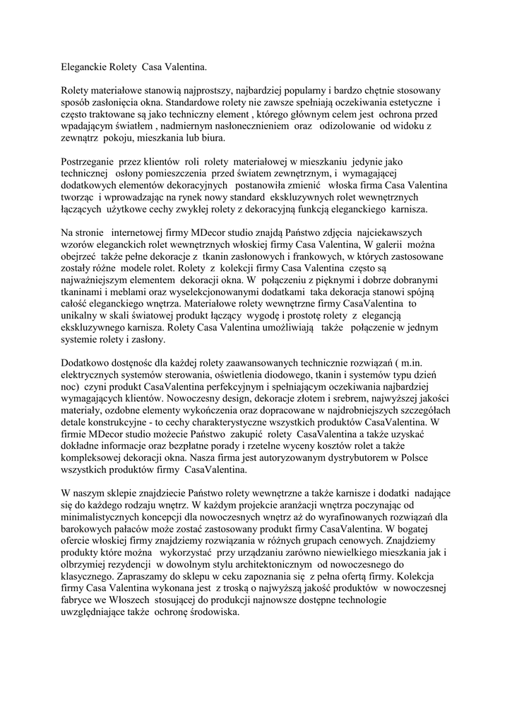 Eleganckie Rolety Casa Valentina. Rolety materiałowe stanowią najprostszy, najbardziej popularny i bardzo chętnie stosowany sposób zasłonięcia okna. Standardowe rolety nie zawsze spełniają oczekiwania estetyczne i często traktowane są jako techniczny element , którego głównym celem jest ochrona przed wpadającym światłem , nadmiernym nasłonecznieniem oraz odizolowanie od widoku z zewnątrz pokoju, mieszkania lub biura. Postrzeganie przez klientów roli rolety materiałowej w mieszkaniu jedynie jako technicznej osłony pomieszczenia przed światem zewnętrznym, i wymagającej dodatkowych elementów dekoracyjnych postanowiła zmienić włoska firma Casa Valentina tworząc i wprowadzając na rynek nowy standard ekskluzywnych rolet wewnętrznych łączących użytkowe cechy zwykłej rolety z dekoracyjną funkcją eleganckiego karnisza. Na stronie internetowej firmy MDecor studio znajdą Państwo zdjęcia najciekawszych wzorów eleganckich rolet wewnętrznych włoskiej firmy Casa Valentina, W galerii można obejrzeć także pełne dekoracje z tkanin zasłonowych i frankowych, w których zastosowane zostały różne modele rolet. Rolety z kolekcji firmy Casa Valentina często są najważniejszym elementem dekoracji okna. W połączeniu z pięknymi i dobrze dobranymi tkaninami i meblami oraz wyselekcjonowanymi dodatkami taka dekoracja stanowi spójną całość eleganckiego wnętrza. Materiałowe rolety wewnętrzne firmy CasaValentina to unikalny w skali światowej produkt łączący wygodę i prostotę rolety z elegancją ekskluzywnego karnisza. Rolety Casa Valentina umożliwiają także połączenie w jednym systemie rolety i zasłony. Dodatkowo dostęnośc dla każdej rolety zaawansowanych technicznie rozwiązań ( m.in. elektrycznych systemów sterowania, oświetlenia diodowego, tkanin i systemów typu dzień noc) czyni produkt CasaValentina perfekcyjnym i spełniającym oczekiwania najbardziej wymagających klientów. Nowoczesny design, dekoracje złotem i srebrem, najwyższej jakości materiały, ozdobne elementy wykończenia oraz dopracowane w najdrobniejszych szczegółach detale konstrukcyjne - to cechy charakterystyczne wszystkich produktów CasaValentina. W firmie MDecor studio możecie Państwo zakupić rolety CasaValentina a także uzyskać dokładne informacje oraz bezpłatne porady i rzetelne wyceny kosztów rolet a także kompleksowej dekoracji okna. Nasza firma jest autoryzowanym dystrybutorem w Polsce wszystkich produktów firmy CasaValentina. W naszym sklepie znajdziecie Państwo rolety wewnętrzne a także karnisze i dodatki nadające się do każdego rodzaju wnętrz. W każdym projekcie aranżacji wnętrza poczynając od minimalistycznych koncepcji dla nowoczesnych wnętrz aż do wyrafinowanych rozwiązań dla barokowych pałaców może zostać zastosowany produkt firmy CasaValentina. W bogatej ofercie włoskiej firmy znajdziemy rozwiązania w różnych grupach cenowych. Znajdziemy produkty które można wykorzystać przy urządzaniu zarówno niewielkiego mieszkania jak i olbrzymiej rezydencji w dowolnym stylu architektonicznym od nowoczesnego do klasycznego. Zapraszamy do sklepu w ceku zapoznania się z pełna ofertą firmy. Kolekcja firmy Casa Valentina wykonana jest z troską o najwyższą jakość produktów w nowoczesnej fabryce we Włoszech stosującej do produkcji najnowsze dostępne technologie uwzględniające także ochronę środowiska.