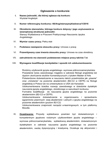 Ogłoszenie o konkursie I. Nazwa jednostki, dla której ogłasza się konkurs: Wydział Anglistyki II. Numer referencyjny konkursu: 66/Ang/starszywykladowca/1/2016 III. Określenie stanowiska, którego konkurs dotyczy i jego usytuowanie w wewnętrznej strukturze jednostki: Starszy Wykładowca w Pracowni Praktycznego Nauczania Języka Angielskiego IV. Wymiar czasu pracy; Pełny etat V. Podstawa nawiązania stosunku pracy: Umowa o pracę VI. Przewidywany czas trwania stosunku pracy: Umowa na czas określony VII. zatrudnienie ma stanowić podstawowe miejsce pracy tak/nie:Tak VIII. Wymagane kwalifikacje kandydatów i sposób ich udokumentowania: Rodzimy użytkownik języka angielskiego -wymowa północnoamerykańska Posiadanie tytułu zawodowego magistra w zakresie filologii angielskiej lub dyplom ukończenia studiów humanistycznych z tytułem Master of Arts Potwierdzone doświadczenie w nauczaniu takich przedmiotów jak „pisanie” oraz „mówienie” na poziomie akademickim (B2-C2 w CEFR) na filologii angielskiej w Polsce lub na uniwersytecie w USA lub Kanadzie Udokumentowana ścieżka rozwoju zawodowego w dziedzinie dydaktyki nauczania języka angielskiego, określonego w warunkach konkursu Formalne kwalifikacje do nauczania języka angielskiego na poziomie akademickim (B2-C2 w CEFR) Udokumentowane doświadczenie w organizowaniu i sprawdzaniu egzaminów pisemnych -esej akademicki i ustnych z języka angielskiego na poziomie akademickim (poziom B2-C2) Udokumentowana znajomość narzędzi e-learningowych, w tym platformy Moodle. IX. Oczekiwania: Przyszły wykładowca powinien być doświadczonym i kompetentnym językowo rodzimym użytkownikiem języka angielskiego – wymowa północnoamerykańska, wykładowcą akademickim, doświadczonym dydaktykiem w zakresie nauczania języka angielskiego na poziomie akademickim, osobą dyspozycyjną i kreatywną. Oczekuje się aktywności i pełnego zaangażowania w działalność dydaktyczną Wydziału w zakresie prowadzenia zajęć ze studentami na wysokim poziomie merytorycznym oraz językowym. Dodatkowo, starszy wykładowca będzie regularnie i czynnie uczestniczył w przygotowaniu oraz przeprowadzaniu egzaminów językowych w czasie sesji egzaminacyjnych. Będzie również członkiem zespołów układających testy językowe na poziomie akademickim dla studentów wszystkich lat studiów licencjackich i magisterskich, a także członkiem zespołu poprawiającego eseje egzaminacyjne. Oczekuje się również czynnego uczestnictwa w: - działalności Wydziału w zakresie promowania języka i kultury krajów angielskiego obszaru językowego na Uniwersytecie Adama Mickiewicza oraz w organizacji współpracy Wydziału z jednostkami z otoczenia społecznego; - zebraniach nauczycieli akademickich oraz warsztatach szkolenia kadry dydaktycznej w WA. Trzy słowa kluczowe: dydaktyka, rodzimy użytkownik języka angielskiego, pisanie i mówienie akademickie, X. Lista dodatkowych dokumentów, które mają być przedstawione: • • • • • • • • podanie kandydata kierowane do Prorektora ds. kadry i rozwoju uczelni (na podaniu należy dopisać: wyrażam zgodę na przetwarzanie moich danych osobowych zawartych w mojej ofercie dla potrzeb niezbędnych do realizacji procesu rekrutacji zgodnie z ustawą z dn. 29 sierpnia 1997 r. o ochronie danych osobowych, Dz. U. nr 133 poz. 883 z późniejszymi zmianami). list motywacyjny z opisem planów rozwoju kompetencji dydaktycznych kandydata i oczekiwań związanych z zatrudnieniem na Wydziale Anglistyki kwestionariusz osobowy fotografia odpis dyplomu ukończenia studiów drugiego stopnia z tytułem magistra filologii angielskiej lub dyplom ukończenia studiów humanistycznych z tytułem Master of Arts. CV uwzględniające dokonania dydaktyczne oraz udział w konferencjach dydaktycznych z podaniem tematów prezentacji wygłoszonych w okresie ostatnich trzech lat zaświadczenia o nagrodach za osiągnięcia dydaktyczne, stypendiach, odbytych stażach międzynarodowych i popularyzacji nauki oraz współpracy międzynarodowej w zakresie popularyzacji nauki świadectwa pracy z poprzednich zakładów pracy uwzględniające funkcje administracyjne pełnione przez kandydata • • kopię sylabusa przeprowadzanych zajęć z academic speaking oraz z academic writing oświadczenie, że Uniwersytet im. Adama Mickiewicza w Poznaniu będzie podstawowym miejscem pracy XI. Termin, miejsce i sposób złożenia dokumentów: 30 maja 2016 Dziekanat Wydziału Anglistyki Dokumenty należy przesłać na adres Dziekanat Wydziału Anglistyki al. Niepodległości 4 61-874 Poznań lub złożyć osobiście w Dziekanacie XII. Sposób weryfikacji kwalifikacji kandydatów Analiza dokumentacji złożonej przez wnioskodawców w wyznaczonym terminie. Komisja może również przewidzieć inne formy weryfikacji kwalifikacji, takie jak: rozmowa kwalifikacyjna, prezentacja multimedialna, przeprowadzenie zajęć ze studentami XIII. Przewidywany termin rozstrzygnięcia konkursu: 3.06.2016 Notice of a competition I. II. Name of the unit where the competition is announced: Faculty of English Competition reference number: 68Ang/starszywykladowca/1/2016 III. Position and its place within the unit: Senior Lecturer in the Centre for English Language Teaching IV. Type of employment: Full time V. Base for the employment relation: Employment contract VI. Expected duration of employment: Contract for a definite time VII. Should this be the principal employment yes/no:Yes VIII. Requisite qualifications and manner of documenting them: A native speaker of English – North American English pronunciation Master of Arts degree in English Studies or in the humanities Documented experience of having taught subjects such as Academic Speaking and Academic Writing at the university level (B2-C2 in CEFR) Documented professional career in the field of teaching English, as determined in the competition criteria Formal qualifications to teach English at the university leve
