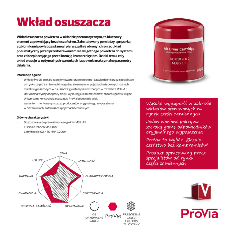 Wkład osuszacza Wkład osuszacza powietrza w układzie pneumatycznym, to kluczowy element zapewniający bezpieczeństwo. Zainstalowany pomiędzy sprężarką a zbiornikami powietrza stanowi pierwszą linię obrony, chroniąc układ pneumatyczny przed przedostawaniem się wilgotnego powietrza do systemu oraz zabezpieczając go przed korozją i zamarznięciem. Dzięki temu, cały układ pracuje w optymalnych warunkach i zapewnia maksymalne parametry działania. Informacje ogólne • Wkłady ProVia zostały zaprojektowane, przetestowane i zatwierdzone przez specjalistów od rynku częśći zamiennych i mogą być stosowane w pojazdach użytkowych różnych marek wyposażonych w osuszacz z gwintem prawostronnym w rozmiarze M39×1.5. • • Optymalna wydajność pracy dzięki wysokiej jakości materiałowi absorbującemu wilgoć. Uniwersalna konstrukcja osuszacza ProVia odpowiada wielu Wysoka wydajność w zakresie wkładów oferowanych na rynek części zamiennych wariantom montowanym przez producentów oryginalnego wyposażenia w ciężarówkach, autobusach i pojazdach terenowych. Główne charakterystyki • Dostosowany do prawostronnego gwintu M39×1.5 • Ciśnienie robocze do 13 bar • Certyfikacja ISO / TS 16949.2009 Jeden wariant pokrywa szeroką gamę odpowiedników oryginalnego wyposażenia ProVia to Wybór „Bezpieczeństwo bez kompromisów” Produkt opracowany przez specjalistów od rynku części zamiennych CENA USŁUGI WYDAJNOŚĆ CHARAKTERYSTYKA NAPRAWA GWARANCJA POLITYKA ZAMÓWIEŃ CERTYFIKACJA OPAKOWANIE OE ORYGINALNE CZĘŚCI ProVia PRZECIĘTNE CZĘŚCI SEKTORA WTÓRNEGO Numer części ProVia Marka Numer części OE AMMAN Numer części ProVia Marka Numer części OE 4-5358060018 J.C. BAMFORD 15/920105 ASTRA (IVECO GROUP) 107163 JOHN DEERE AL204884 BELL EQUIPMENT (SA) 220949 KALI&SALZ M4283244 BENDIX 272897 KINGLONG 35G42-11501 BMC (BMH) 9P917828 I 85127/004 CVS 430001-01 272897 1504900R II 40100F KNORR-BREMSE 699387 K 001185 1527756 II 17793/044 699387 II 34979 DAF E.R.F. 136873-1 BBU8146 LEYLAND PRO 010 200 2 EVOBUS/SETRA 8,285,141,196 FAUN 9970 7305720 BBU9424 PRO 010 200 2 571352308 LIEBHERR FOMOCO 2C462B915AA FORD 4C452A131AA 571 3523-08 AL12 MAHLE GRAU BREMSE/ HALDEX 031 041 09 78793135 HALDEX 950 310 099 81.52102-008 HEULIEZ 2992261 81.52102-0010 80 10002 016 81.52102-0015 IRISBUS 50 060163 42 81.52102-0019 MAN IVECO 819 0948 81.52102-6001 5031 35256 81.52102-0013 299 2261 81.52102-0009 190 7612 82.52102-0013 812 3564 MANN FILTER TB1374X Numer części ProVia Marka Numer części OE Numer części ProVia Marka A 000 429 08 97 50 00 295 421 A 000 429 10 97 RENAULT TRUCKS 5430018121 A 000 429 35 95 137 5997 SCANIA A 000 429 37 95 377640 1932688 A 000 430 06 69 SCHWARZMÜLLER 30283 A 000 430 09 69 SEDDON-ATKINSON 17 4767 000 429 12 97 SOLARIS BUS 1102751110 000 429 35 95 792.00.36.1087 PRO 010 200 2 STEYR-DAIMLER-PUCH 000 429 36 95 PRO 010 200 2 50 01 004 902 A 000 429 12 97 A 000 429 36 95 MERCEDES-BENZ (DAIMLER AG) Numer części OE 792.00.36.1090 000 430 09 69 TATRA 9907004690 000 429 08 97 TEREX 761 176 73 000 42933 95 3090236 000 429 10 97 3090268 VOLVO 000 429 37 95 3090288 000 430 06 69 3091200 1101 745 50 VW GROUP (AUDI/SEAT/SKODA/VW) 2TA 607 413 1102 736 00 VDL BUS 20511527 ORENSTEIN + KOPPEL (O&K) 848 0087 YUTONG 3529-00033 PACCAR 1504900 NEOPLAN 50 21 170 070 50 21 170 076 RENAULT TRUCKS 50 21 132 574 50 01 830 112 Informacje dotyczące ProVia ProVia to marka części zamiennych do pojazdów użytkowych, które zapewniają niezawodność ich działania, w wersji podstawowej i bez kompromisów w zakresie jakości i bezpieczeństwa, przeznaczonych do ciężarówek, autobusów i naczep. ProVia jest dostępna dla dystrybutorów, warsztatów i firm obsługujących parki pojazdów, pokrywając swoim asortymentem światowy przemysł pojazdów użytkowych. Więcej informacji znajduje się na stronie internetowej pod adresem www.provia-auto.com ZASTRZEŻENIA Dane oraz informacje zawarte w tym dokumencie są przeznaczone wyłącznie dla autoryzowanych dystrybutorów ProVia i nie powinny być przekazywane osobom trzecim. Dokument jest dostarczany wyłącznie w celach informacyjnych i nie należy interpretować jego postanowień jako gwarancji lub poręczenia dokładności, adekwatności, kompletności, terminowości lub przydatności danych lub informacji, lub charakterystyk produktu. WABCO nie ponosi odpowiedzialności za błędy lub pominięcia w danych lub w informacjach, lub za jakiekolwiek szkody, włącznie - bez ograniczenia - z utraconymi korzyściami lub szkodami wynikowymi związanymi w jakikolwiek sposób z wykorzystaniem danych i informacji, z wyjątkiem sytuacji, gdy dana szkoda powstała w wyniku umyślnego zamiaru lub poważnego zaniedbania. © 2016 WABCO Wszelkie prawa zastrzeżone PRO 090 013 3 / 03.2016