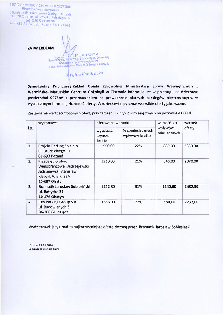 SAMODZIELNY PUBLICZNY ZAKŁAD OPIEKI ZDROWOTNEJ Ministerstwo Spraw Wewnętrznych z Warmińsko-Mazurskim Centrum Onkologii w Olsztynie 1 0 - 2 2 8 O l s z t y n , al. W o j s k a P o l s k i e g o 3 7 . M_ tel. ( 8 9 ) 5 3 9 8 0 00 NIP 7 3 9 - 2 9 - 5 4 - 8 9 5 , R e g o n 5 1 0 0 2 2 3 6 6 ZATWIERDZAM U , R E K T O R A S a m o d z W ^ * ™ * 0 Zakładu Opiek. Zdrowotne) MłJsWśtwa Spraw Wewnętyrznych , WarmiństSpmCentrum Onkologii w Olsztyn, B ygida Samodzielny Publiczny Zakład Kondracka Opieki Zdrowotnej Ministerstwa Spraw Wewnętrznych z Warmińsko- Mazurskim Centrum Onkologii w Olsztynie informuje, że w przetargu na dzierżawę powierzchni 9975m 2 z przeznaczeniem na prowadzenie płatnych parkingów niestrzeżonych, w wyznaczonym terminie, złożono 4 oferty. Wydzierżawiający uznał wszystkie oferty jako ważne. Zestawienie wartości złożonych ofert, przy założeniu wpływów miesięcznych na poziomie 4 000 zł. Wykonawca l.p. 1. 2. 3. 4. Projekt Parking Sp.z o.o. ul. Drużbickiego 11 61-693 Poznań Przedsiębiorstwo Wielobranżowe „Jędrzejewski" Jędrzejewski Stanisław Klebark Wielki 35A 10-687 Olsztyn Bramatik Jarosław Sobiesiński ul. Bałtycka 34 10-176 Olsztyn City Parking Group S.A. ul. Budowlanych 3 86-300 Grudziądz oferowane warunki wartość z % wpływów miesięcznych wartość oferty 22% 880,00 2380,00 1230,00 21% 840,00 2070,00 1242,30 31% 1240,00 2482,30 1353,00 22% 880,00 2233,00 wysokość czynszu brutto 1500,00 % comiesięcznych wpływów brutto Wydzierżawiający uznał za najkorzystniejszą ofertę złożoną przez Bramatik Jarosław Sobiesiński. Olsztyn 24.H.2014r. Sporządziła :Renata Kaim