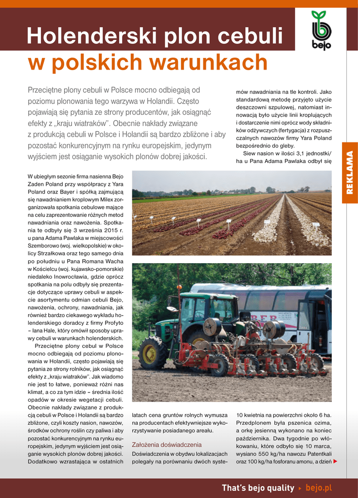 Przeciętne plony cebuli w Polsce mocno odbiegają od poziomu plonowania tego warzywa w Holandii. Często pojawiają się pytania ze strony producentów, jak osiągnąć efekty z „kraju wiatraków”. Obecnie nakłady związane z produkcją cebuli w Polsce i Holandii są bardzo zbliżone i aby pozostać konkurencyjnym na rynku europejskim, jedynym wyjściem jest osiąganie wysokich plonów dobrej jakości. W ubiegłym sezonie firma nasienna Bejo Zaden Poland przy współpracy z Yara Poland oraz Bayer i spółką zajmującą się nawadnianiem kroplowym Milex zorganizowała spotkania cebulowe mające na celu zaprezentowanie różnych metod nawadniania oraz nawożenia. Spotkania te odbyły się 3 września 2015 r. u pana Adama Pawlaka w miejscowości Szemborowo (woj. wielkopolskie) w okolicy Strzałkowa oraz tego samego dnia po południu u Pana Romana Wacha w Kościelcu (woj. kujawsko-pomorskie) niedaleko Inowrocławia, gdzie oprócz spotkania na polu odbyły się prezentacje dotyczące uprawy cebuli w aspekcie asortymentu odmian cebuli Bejo, nawożenia, ochrony, nawadniania, jak również bardzo ciekawego wykładu holenderskiego doradcy z firmy Profyto – Iana Hale, który omówił sposoby uprawy cebuli w warunkach holenderskich. Przeciętne plony cebul w Polsce mocno odbiegają od poziomu plonowania w Holandii, często pojawiają się pytania ze strony rolników, jak osiągnąć efekty z „kraju wiatraków”. Jak wiadomo nie jest to łatwe, ponieważ różni nas klimat, a co za tym idzie – średnia ilość opadów w okresie wegetacji cebuli. Obecnie nakłady związane z produkcją cebuli w Polsce i Holandii są bardzo zbliżone, czyli koszty nasion, nawozów, środków ochrony roślin czy paliwa i aby pozostać konkurencyjnym na rynku europejskim, jedynym wyjściem jest osiąganie wysokich plonów dobrej jakości. Dodatkowo wzrastająca w ostatnich latach cena gruntów rolnych wymusza na producentach efektywniejsze wykorzystywanie posiadanego areału. Założenia doświadczenia Doświadczenia w obydwu lokalizacjach polegały na porównaniu dwóch syste- mów nawadniania na tle kontroli. Jako standardową metodę przyjęto użycie deszczowni szpulowej, natomiast innowacją było użycie linii kroplujących i dostarczenie nimi oprócz wody składników odżywczych (fertygacja) z rozpuszczalnych nawozów firmy Yara Poland bezpośrednio do gleby. Siew nasion w ilości 3,1 jednostki/ ha u Pana Adama Pawlaka odbył się 10 kwietnia na powierzchni około 6 ha. Przedplonem była pszenica ozima, a orkę jesienną wykonano na koniec października. Dwa tygodnie po włókowaniu, które odbyło się 10 marca, wysiano 550 kg/ha nawozu Patentkali oraz 100 kg/ha fosforanu amonu, a dzień REKLAMA Holenderski plon cebuli w polskich warunkach przed siewem 200 kg/ha saletrzaku, po czym przygotowano glebę do siewu agregatem biernym, tzw. kompaktorem. Rozłożenie linii kroplujących na części pola nastąpiło na etapie wytworzenia przez cebulę trzech liści właściwych. Cebulę uprawiano na zagonach o szerokości 1,8 m na których rozłożono trzy linie kroplujące. Rozkładanie taśm odbyło się ręcznie w trakcie wzrostu cebuli, ale istnieje również możliwość rozwijania taśm w takcie siewu poprzez montaż szpul na siewniku pneumatycznym. Pogłównie 1 czerwca zastosowano 170 kg/ha Unika Calcium na całej plan- tacji, a 30 czerwca tylko na części pola bez fertygacji rozsiano po raz kolejny 170 kg/ha Unika Calcium. Nawadnianie przy użyciu deszczowni szpulowej rozpoczęto w momencie, gdy cebula zaczęła tworzyć zgrubienia. Na części pola, gdzie nawadniano rośliny systemem tradycyjnym wykonano pięć zabiegów, każdorazowo dostarczając cebuli po 30 mm wody. Fertygacja rozpoczęła się, gdy rośliny w pełni wykształciły 4. liść właściwy, a zakończyła – ok. 2 tygodnie przed początkiem załamywania się szczypioru. Tak w założeniach prawidłowo powinno podejść się do Tab. 1. Terminy oraz ilości nawozów wykorzystywanych do fertygacji plantacji w Szemborowie Aplikacja Termin stosowania 1 25 czerwca 2 30 czerwca 3 3 lipca Superba czerwona (7–9-25+Mikro) Superba brązowa (14–9-25+Mikro) YaraLiva Calcinit (15,5+26,6 CaO) kg kg kg 4 5 lipca 9 lipca 6 11 lipca 50 25 7 15 lipca 8 20 lipca 9 27 lipca 25 25 25 25 25 5 Suma (kg) 25 50 50 25 25 50 25 25 25 50 50 10 3 sierpnia 50 50 11 10 sierpnia 50 50 Suma (kg) 175 125 100 400 Tab. 2. Średni plon cebuli wszystkich porównywanych w doświadczeniu w Kościelcu odmian firmy Bejo dla poszczególnych systemów nawadniania System nawadniania Średni plon (t/ha) Przyrost względem kontroli (t/ha) Przyrost względem kontroli (%) Kontrola 53,1 Nawadnianie deszczowniane 73,1 20 37,7 Nawadnianie kroplowe 94,7 41,6 78,3 fertygacji. Jednak należy pamiętać, że mając już rozłożoną całą instalację kroplującą, można podawać roślinom też samą wodę. Ten sposób nawadniania ma koleją zaletę – pozwala na efektywniejsze wykorzystywanie wody, ponieważ w porównaniu z tzw. działkiem w mniejszym stopniu ma miejsce odparowywanie wody do atmosfery. Dodatkowym atutem jest możliwość podlewania o każdej porze dnia i nocy bez względu na temperaturę powietrza. Nie występuje tu tzw. efekt szoku termicznego dla rośliny, a warto również zauważyć, że podlewanie z góry zmywa ochronny wosk ze szczypioru i naraża go w większym stopniu na atak sprawców chorób grzybowych. Producent w Szemborowie ścinał szczypior i wykopywał cebulę 22 września. Na plantacji wykonano siedem zabiegów fungicydowych, co skutecznie zabezpieczyło szczypior przed chorobami. Podkreslić należy, że program nawożenia w Szemborowie oraz Kościelcu firma Yara Poland przygotowała w oparciu o analizę gleby i wody. W tabeli 1. przedstawiono terminy oraz ilości nawozów wykorzystywanych do fertygacji plantacji w Szemborowie. Czy warto? Ocena plonu z 1 m bieżącego jest mało miarodajna, jeżeli mówi się o produkcji polowej. Dlatego w tr