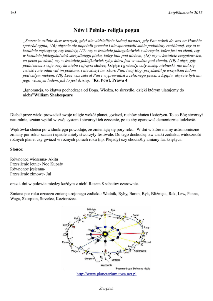 1z5 AntyEkumenia 2015 Nów i Pełnia- religia pogan „Strzeżcie usilnie dusz waszych, gdyż nie widzieliście żadnej postaci, gdy Pan mówił do was na Horebie spośród ognia, (16) abyście nie popełnili grzechu i nie sporządzili sobie podobizny rzeźbionej, czy to w kształcie mężczyzny, czy kobiety, (17) czy w kształcie jakiegokolwiek zwierzęcia, które jest na ziemi, czy w kształcie jakiegokolwiek skrzydlatego ptaka, który lata pod niebem, (18) czy w kształcie czegokolwiek, co pełza po ziemi, czy w kształcie jakiejkolwiek ryby, która jest w wodzie pod ziemią, (19) i abyś, gdy podniesiesz swoje oczy ku niebu i ujrzysz słońce, księżyc i gwiazdy, cały zastęp niebieski, nie dał się zwieść i nie oddawał im pokłonu, i nie służył im, skoro Pan, twój Bóg, przydzielił je wszystkim ludom pod całym niebem. (20) Lecz was zabrał Pan i wyprowadził z żelaznego pieca, z Egiptu, abyście byli mu jego własnym ludem, jak to jest dzisiaj. ”Ks. Powt. Prawa 4 „Ignorancja, to klątwa pochodząca od Boga. Wiedza, to skrzydło, dzięki którym ulatujemy do nieba”William Shakespeare Diabeł przez wieki prowadził swoje religie wokół planet, gwiazd, ruchów słońca i księżyca. To co Bóg stworzył naturalnie, szatan wplótł w swój system i stworzył ich czczenie, po to aby opanować demonicznie ludzkość. Wędrówka słońca po widnokręgu powoduje, ze zmieniają się pory roku. W dni w które mamy astronomiczne zmiany por roku- szatan i upadłe anioły stworzyły festiwale. Do tego dochodzą tzw znaki zodiaku, widoczność rożnych planet czy gwiazd w rożnych porach roku (np. Plejady) czy chociażby zmiany faz księżyca. Słonce: Równonoc wiosenna- Akitu Przesilenie letnie- Noc Kupały Równonoc jesiennaPrzesilenie zimowe- Jul oraz 4 dni w połowie między każdym z nich! Razem 8 sabatów czarownic. Zmiana por roku oznacza zmianę urojonego zodiaku: Wodnik, Ryby, Baran, Byk, Bliźnięta, Rak, Lew, Panna, Waga, Skorpion, Strzelec, Koziorożec. http://www.planetarium.toya.net.pl Sierpień 2z5 AntyEkumenia 2015 Księżyc: http://36.media.tumblr.com New Moon- Nów Fist Quarter- Pierwsza Kwadra, prawa strona księżyca jasna Waxing Crescent- Przybywający Półksiężyc Waning Crescent- Ubywający Półksiężyc Third Quarter- Trzecia Kwadra, oświetlona lewa strona księżyca Waning Gibbous- oznacza, ze widoczny księżyc jest większy od półokręgu. Ubywający i wypukły księżyc. Waxing Gibbous- Przybywający i wypukły księżyc Full Moon- Pełnia W światku okultyzmu fazy księżyca są używane do rzucania konkretnych czarów. W religii Wicca i pogaństwa, w każdą pełnię jest tzw esbat. W 2015 roku mamy 13 pełni księżyca, które są również nazwane rożnymi nazwami. Sierpień 3z5 AntyEkumenia 2015 http://www.space.com/16830-full-moon-calendar.html http://www.space.com/30414-full-moon-tonight-previews-lunar-eclipse.html Data: Nazwa pełni księżyca: 4 Styczeń Wilka 3 Luty Śniegowy 5 Marzec Robaka 4 Kwiecień Różowy 3 Maja Kwiatowy 2 Czerwca Truskawkowy 1 Lipca Kozła 31 Lipca Niebieski 29 Sierpień Jesiotra 27 Wrzesień Żniw 27 Październik Łowcy 25 Listopad Borsuka 11 Grudzień Zimna Fazy księżyca i rodzaj magii, zaklęć: Przybywający Pełnia Pieniądze, praca, miłość, Leczenie, rozwój napływ materialnych dóbr magicznych 'zdolności' Ubywający Eliminowanie negatywnych ludzi bądź związków, redukowanie. Nów Oczyszczanie, wyznaczanie 'świętej przestrzeni', harmonia, pokój. Oznacza to, ze czarownice i poganie robią rożne zabiegi magiczne i jest to istotna wiedza jeśli chodzi o walkę duchowa. Czas ich rytuałów może oznaczać zwykle czas, gdy większość ludzi śpi, co może spowodować koszmary bądź inne senne interwencje. Jedna ze stron promująca satanizm opisuje, ze podczas nowiu oraz pełni księżyca jest więcej 'magicznej energii' niż podczas innych faz. Aleister Crowley napisał nowele pt: Moonchild (Dziecko księżyca), a Jack Parsons próbował spłodzić takie dziecko używając magicznych rytuałów. Istnieje jeszcze tzw 'niebieski księżyc'(blue moon) oraz ciemny księżyc (dark moon). W tym roku mieliśmy 'niebieski księżyc' 31 Lipca. W 2016 r. 30 Października będzie tzw Ciemny Księżyc. Strona Wiccan podaje, ze jest to czas na magie destrukcji. Dodatkowo na zachodzie sprzedaje się mnóstwo książek na temat magii podczas faz księżyca lub nocy. Satanizm używa symboli, w których jest półksiężyc: Sierpień 4z5 AntyEkumenia 2015 wskaźnik miejsca wykonywania czarnej mszy symbol przelewu/ rytuałów krwi Islam również używa symbolu półksiężyca oraz gwiazdy. U Sumerów, symbol półksiężyca związany był z demonem Nanna(Sin, ), gwiazda z Innana (Isztar, Wenus) a słonce z Utu (Šamaš). 1 Oczywiście tego rodzaju nauki są wymysłem demonów, po to aby prowadzić pogan do uprawiania demonolatrii, astrolatrii i rzucania czarów/ robienia rytuałów! Jezus Chrystus dal nam autorytet nad czarami, demonami, inwokacjami czy ewokacjami. Protestanci w Duchu muszą być świadomi walki duchowej, która toczy się mimo ich wiedzy/ niewiedzy! Proponowane wersety do modlitwy: • • • • • • • • • „Gdyż zaklęcie nie ma mocy nad Jakubem Ani czary nad Izraelem ”Ks. Liczb 23 „Pomoc moja jest od Pana, Który uczynił niebo i ziemię. (3) Niechaj nie da się potknąć twej nodze, Niech nie drzemie stróż twój. (4) Oto nie drzemie Ani nie zasypia stróż Izraela. (5) Pan stróżem twoim, Pan cieniem twoim po prawicy twojej. (6) Słońce nie będzie cię razić za dnia Ani księżyc w nocy. (7) Pan strzec cię będzie od wszelkiego zła, Strzec będzie duszy twojej. (8) Pan strzec będzie wyjścia i wejścia twego, Teraz i na wieki.”Ks. Psalmów 121 „Oto dałem wam moc, abyście deptali po wężach i skorpionach i po wszelkiej potędze nieprzyjacielskiej, a nic wam nie zaszkodzi. ”Ew. Łukasza 10 „W końcu, bracia moi, umacniajcie się w Panu i w potężnej moc