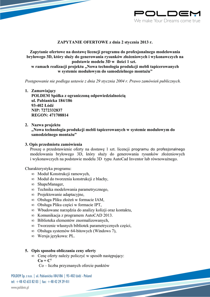 ZAPYTANIE OFERTOWE z dnia 2 stycznia 2013 r. Zapytanie ofertowe na dostawę licencji programu do profesjonalnego modelowania bryłowego 3D, który służy do generowania rysunków złożeniowych i wykonawczych na podstawie modelu 3D w ilości 1 szt. w ramach realizacji projektu „Nowa technologia produkcji mebli tapicerowanych w systemie modułowym do samodzielnego montażu” Postępowanie nie podlega ustawie z dnia 29 stycznia 2004 r. Prawo zamówień publicznych. 1. Zamawiający POLDEM Spółka z ograniczoną odpowiedzialnością ul. Pabianicka 184/186 93-402 Łódź NIP: 7272332837 REGON: 471708814 2. Nazwa projektu „Nowa technologia produkcji mebli tapicerowanych w systemie modułowym do samodzielnego montażu” 3. Opis przedmiotu zamówienia Proszę o przedstawienie oferty na dostawę 1 szt. licencji programu do profesjonalnego modelowania bryłowego 3D, który służy do generowania rysunków złożeniowych i wykonawczych na podstawie modelu 3D typu AutoCad Inventor lub równoważnego. Charakterystyka programu: • Moduł Konstrukcji ramowych, • Moduł do tworzenia konstrukcji z blachy, • ShapeManager, • Technika modelowania parametrycznego, • Projektowanie adaptacyjne, • Obsługa Pliku złożeń w formacie IAM, • Obsługa Pliku części w formacie IPT, • Wbudowane narzędzia do analizy kolizji oraz kontaktu, • Komunikacja z programem AutoCAD 2013. • Biblioteka elementów znormalizowanych, • Tworzenie własnych bibliotek parametrycznych części, • Obsługa systemów 64-bitowych (Windows 7), • Wersja językowa: PL. 5. Opis sposobu obliczania ceny oferty • Cenę oferty należy policzyć w sposób następujący: Co = C1 Co – liczba przyznanych ofercie punktów C1 – cena - Oferta musi zawierać ostateczną, sumaryczną cenę obejmującą wszystkie koszty (także koszty dostawy i inne) z uwzględnieniem wszystkich opłat i podatków (także podatku od towarów i usług) oraz ewentualnych upustów i rabatów. - Cena musi być podana w złotych polskich. - Jeżeli w ofercie zostanie podana cena w innej walucie niż PLN, to zostanie ona przeliczona po średnim kursie NBP danej waluty na dzień wpłynięcia oferty. - Jeżeli złożono ofertę, której wybór prowadziłby do powstania obowiązku podatkowego zamawiającego zgodnie z przepisami o podatku od towarów i usług w zakresie dotyczącym wewnątrzwspólnotowego nabycia towarów, zamawiający w celu oceny takiej oferty dolicza do przedstawionej w niej ceny podatek od towarów i usług, który miałby obowiązek wpłacić zgodnie z obowiązującymi przepisami. 6. Opis kryteriów, którymi zamawiający będzie kierował się przy wyborze najkorzystniejszej oferty wraz z podaniem znaczenia tych kryteriów i sposobu oceny ofert Opis kryteriów wraz z podaniem znaczenia Zamawiający wyznaczył następujące kryteria i ich znaczenie: a. w przypadku kryterium cena oferty 100% Sposób oceny ofert Kryterium: cena ofertowa brutto (określona do dwóch miejsc po przecinku) zostanie ocenione przy zastosowaniu następującego wzoru: najniższa cena C1 = ---------------------------- x 100% oferowana cena 7. Termin wykonania zamówienia Zamówienie ma zostać zrealizowane do dnia 31 stycznia 2013r. 8. Miejsce i termin składania ofert Ofertę należy przesłać do firmy POLDEM Spółka z ograniczoną odpowiedzialnością, ul. Pabianicka 184/186, 93-402 Łódź w terminie do dnia: 12 stycznia 2013 r.