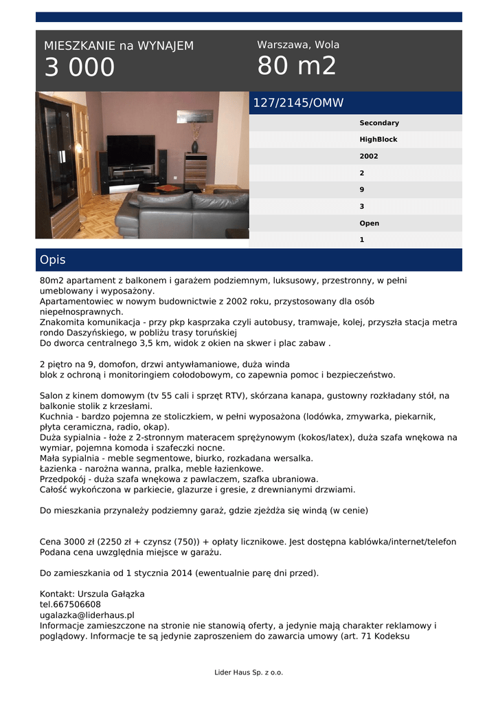 MIESZKANIE na WYNAJEM 3 000 Warszawa, Wola 80 m2 127/2145/OMW Secondary HighBlock 2002 2 9 3 Open 1 Opis 80m2 apartament z balkonem i garażem podziemnym, luksusowy, przestronny, w pełni umeblowany i wyposażony. Apartamentowiec w nowym budownictwie z 2002 roku, przystosowany dla osób niepełnosprawnych. Znakomita komunikacja - przy pkp kasprzaka czyli autobusy, tramwaje, kolej, przyszła stacja metra rondo Daszyńskiego, w pobliżu trasy toruńskiej Do dworca centralnego 3,5 km, widok z okien na skwer i plac zabaw . 2 piętro na 9, domofon, drzwi antywłamaniowe, duża winda blok z ochroną i monitoringiem cołodobowym, co zapewnia pomoc i bezpieczeństwo. Salon z kinem domowym (tv 55 cali i sprzęt RTV), skórzana kanapa, gustowny rozkładany stół, na balkonie stolik z krzesłami. Kuchnia - bardzo pojemna ze stoliczkiem, w pełni wyposażona (lodówka, zmywarka, piekarnik, płyta ceramiczna, radio, okap). Duża sypialnia - łoże z 2-stronnym materacem sprężynowym (kokos/latex), duża szafa wnękowa na wymiar, pojemna komoda i szafeczki nocne. Mała sypialnia - meble segmentowe, biurko, rozkadana wersalka. Łazienka - narożna wanna, pralka, meble łazienkowe. Przedpokój - duża szafa wnękowa z pawlaczem, szafka ubraniowa. Całość wykończona w parkiecie, glazurze i gresie, z drewnianymi drzwiami. Do mieszkania przynależy podziemny garaż, gdzie zjeżdża się windą (w cenie) Cena 3000 zł (2250 zł + czynsz (750)) + opłaty licznikowe. Jest dostępna kablówka/internet/telefon Podana cena uwzględnia miejsce w garażu. Do zamieszkania od 1 stycznia 2014 (ewentualnie parę dni przed). Kontakt: Urszula Gałązka tel.667506608 [email protected] Informacje zamieszczone na stronie nie stanowią oferty, a jedynie mają charakter reklamowy i poglądowy. Informacje te są jedynie zaproszeniem do zawarcia umowy (art. 71 Kodeksu Lider Haus Sp. z o.o. cywilnego). Jeśli chcesz się dokładnie zapoznać z warunkami transakcji to zadzwoń 725 333 233 lub odwiedź nasze biuro www.liderhaus.pl URSZULA GAŁĄZKA tel. 667 506 608 tel. 226200366 email: [email protected] Lider Haus Sp. z o.o. Powered by TCPDF (www.tcpdf.org)