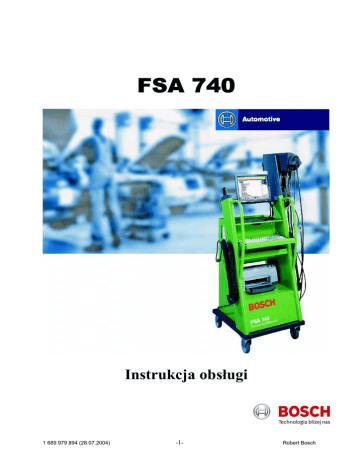 FSA 740 Instrukcja obsługi 1 689 979 894 (28.07.2004) -1- Robert Bosch Wstęp Przed uruchomieniem i przystąpieniem do obsługi przyrządu jest konieczne dokładne zapoznanie się z osobną instrukcją obsługi „Wichtige Hinweise und Sicherheitshinweise zu Bosch-Testgeräten“ (1 689 979 922) („Zasady zachowania bezpieczeństwa podczas posługiwania się przyrządami diagnostycznymi Bosch”). Wszystkie czynności i zabiegi, jak równieŜ podłączanie przyrządów diagnostycznych w obszarze silnika i do układu zapłonowego mogą być wykonywane tylko przy zatrzymanym silniku i wyłączonym zapłonie. PoniŜsze symbole, umieszczone na Państwa przyrządzie diagnostycznym, powinny stale przypominać o podanych wskazówkach. Stosować się do wskazówek zawartych w niniejszej instrukcji Przyrząd diagnostyczny podłączyć do masy silnika lub do zacisku (B-) akumulatora jeszcze przed włączeniem zapłonu. Przed odłączeniem przyrządu diagnostycznego od masy silnika lub akumulatora (B-) wyłączyć zapłon. 1 689 979 894 (28.07.2004) -2- Robert Bosch Spis treści 1. Zasady bezpiecznego uŜytkowania......................................................................................................... 4 2. Przeznaczenie przyrządu ........................................................................................................................ 4 3. WyposaŜenie standardowe...................................................................................................................... 5 4. Opis przyrządu........................................................................................................................................ 6 4.1 Widok przyrządu od przodu ............................................................................................................... 6 Widok przyrządu od tyłu............................................................................................................................. 6 Listwa z gniazdami ..................................................................................................................................... 7 5. Pierwsze uruchomienie........................................................................................................................... 7 5.1 Przygotowanie przyrządu ................................................................................................................... 7 5.2 Przed pierwszym uruchomieniem ...................................................................................................... 7 5.3 Ustawienie języka .............................................................................................................................. 8 5.4 Konfigurowanie drukarki ................................................................................................................... 8 6. Obsługa przyrządu .................................................................................................................................. 8 6.1 Włączanie/wyłączanie FSA 740......................................................................................................... 8 6.2 Diagnostics Softwareanwahl DSA ..................................................................................................... 8 Okno startowe programu dla FSA .............................................................................................................. 9 6.4 Ustawienie języka .............................................................................................................................. 9 Struktura okna............................................................................................................................................. 9 6.6 Obsługa programu .............................................................................................................................. 9 6.7 Symbole prędkości obrotowej .......................................................................................................... 10 6.8 Program ESI[tronic] ......................................................................................................................... 10 6.9 Instalowanie programu ..................................................................................................................... 11 7. WyposaŜenie dodatkowe ...................................................................................................................... 11 8. 9. Części zapasowe ................................................................................................................................... 11 Dane techniczne.................................................................................................................................... 12 9.1 Funkcje pomiarowe .......................................................................................................................... 12 1.1.1 Test silnika............................................................................................................................... 12 9.1.2 9.1.3 Multimetr ................................................................................................................................. 14 Oscyloskop .............................................................................................................................. 14 9.1.4 Funkcje pomiarowe oscyloskopu ............................................................................................ 15 9.1.5 Funkcje i specyfikacje oscyloskopu ........................................................................................ 15 9.2 Generator sygnałów.......................................................................................................................... 16 9.3 Zasilacz............................................................................................................................................. 16 9.4 Kompatybilność