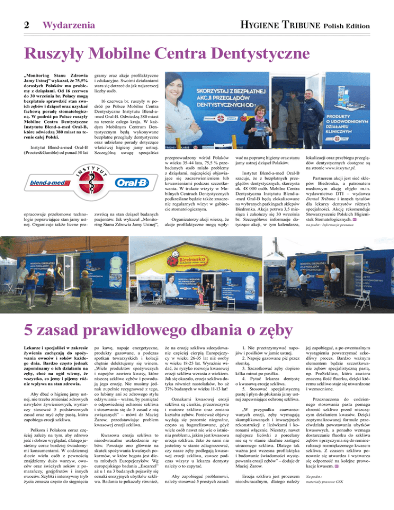 2 HYGIENE TRIBUNE Polish Edition Wydarzenia Ruszyły mobilne Centra Dentystyczne „monitoring stanu Zdrowia Jamy Ustnej” wykazał, że 75,5% dorosłych Polaków ma problemy z dziąsłami. Od 16 czerwca do 30 września br. Polacy mogą bezpłatnie sprawdzić stan swoich zębów i dziąseł oraz uzyskać fachową poradę stomatologiczną. W podróż po Polsce ruszyły mobilne Centra Dentystyczne Instytutu Blend-a-med Oral-B, które odwiedzą 380 miast na terenie całej Polski. Instytut Blend-a-med Oral-B (Procter&Gamble) od ponad 50 lat opracowuje przełomowe technologie poprawiające stan jamy ustnej. Organizuje także liczne pro- gramy oraz akcje proilaktyczne i edukacyjne. Swoimi działaniami stara się dotrzeć do jak najszerszej liczby osób. 16 czerwca br. ruszyły w podróż po Polsce Mobilne Centra Dentystyczne Instytutu Blend-a-med Oral-B. Odwiedzą 380 miast na terenie całego kraju. W każdym Mobilnym Centrum Dentystycznym będą wykonywane bezpłatne przeglądy dentystyczne oraz udzielane porady dotyczące właściwej higieny jamy ustnej. Szczególną uwagę specjaliści zwrócą na stan dziąseł badanych pacjentów. Jak wykazał „Monitoring Stanu Zdrowia Jamy Ustnej”, przeprowadzony wśród Polaków w wieku 35-44 lata, 75,5 % przebadanych osób miało problemy z dziąsłami, najczęściej objawiające się zaczerwienieniem lub krwawieniami podczas szczotkowania. W trakcie wizyty w Mobilnych Centrach Dentystycznych podkreślane będzie także znaczenie regularnych wizyt w gabinecie stomatologicznym. Organizatorzy akcji wierzą, że akcje proilaktyczne mogą wpły- wać na poprawę higieny oraz stanu jamy ustnej dziąseł Polaków. Instytut Blend-a-med Oral-B szacuje, że z bezpłatnych przeglądów dentystycznych, skorzysta ok. 48 000 osób. Mobilne Centra Dentystyczna Instytutu Blend-a-med Oral-B będą zlokalizowane na wybranych parkingach sklepów Biedronka. Akcja potrwa 3,5 miesiąca i zakończy się 30 września br. Szczegółowe informacje dotyczące akcji, w tym kalendarza, lokalizacji oraz przebiegu przeglądów dentystycznych dostępne są na stronie www.instytut.pl. Partnerem akcji jest sieć sklepów Biedronka, a patronatem mediowym akcję objęło m.in. wydawnictwo DTI – wydawca Dental Tribune i innych tytułów dla lekarzy dentystów różnych specjalności. Akcję rekomenduje Stowarzyszenie Polskich Higienistek Stomatologicznych. HT na podst.: Informacja prasowa 5 zasad prawidłowego dbania o zęby Lekarze i specjaliści w zakresie żywienia zachęcają do spożywania owoców i soków każdego dnia. Bardzo często jednak zapominamy o ich działaniu na zęby, choć na ogół wiemy, że wszystko, co jemy i pijemy różnie wpływa na stan zdrowia. Aby dbać o higienę jamy ustnej, nie trzeba zmieniać zdrowych nawyków żywieniowych, wystarczy stosować 5 podstawowych zasad oraz myć zęby pastą, która zapobiega erozji szkliwa. Polkom i Polakom coraz częściej zależy na tym, aby zdrowo jeść i dobrze wyglądać, dlatego jesteśmy coraz bardziej świadomymi konsumentami. W codziennej diecie wielu osób z pewnością znajdziemy dużo warzyw, owoców oraz świeżych soków z pomarańczy, grejpfrutów i innych owoców. Szybki i intensywny tryb życia zmusza często do sięgnięcia po kawę, napoje energetyczne, produkty gazowane, a podczas spotkań towarzyskich i kolacji chętnie delektujemy się winem. „Wiele produktów spożywczych i napojów zawiera kwasy, które niszczą szkliwo zębów i powodują jego erozję. Nie musimy jednak zupełnie rezygnować z tego, co lubimy ani ze zdrowego stylu odżywiania – ważne, by pamiętać o odpowiedniej ochronie szkliwa i stosowaniu się do 5 zasad z nią związanych” – mówi dr Maciej Żarow, przedstawiając problem kwasowej erozji szkliwa. Kwasowa erozja szkliwa to nieodwracalne uszkodzenie zębów. Powstaje ono głównie na skutek spożywania kwaśnych pokarmów, w które bogata jest dieta młodych Europejczyków. Wg europejskiego badania „Escarcel” aż u 1 na 3 badanych pojawiły się oznaki erozyjnych ubytków szkliwa. Badania te pokazały również, że na erozję szkliwa zdecydowanie częściej cierpią Europejczycy w wieku 26-35 lat niż osoby w wieku 18-25 lat. Wyraźnie widać, że ryzyko rozwoju kwasowej erozji szkliwa wzrasta z wiekiem. Jak się okazało, erozja szkliwa dotyka również nastolatków, bo aż 37% badanych w wieku 11-13 lat! 1. Nie przetrzymywać napojów i posiłków w jamie ustnej. 2. Napoje gazowane pić przez słomkę. 3. Szczotkować zęby dopiero kilka minut po posiłku. 4. Pytać lekarza dentystę o kwasową erozję szkliwa. 5. Stosować specjalistyczną pastę i płyn do płukania jamy ustnej zapewniające ochronę szkliwa. jej zapobiegać, a po ewentualnym wystąpieniu powstrzymać szkodliwy proces. Bardzo ważnym elementem będzie szczotkowanie zębów specjalistyczną pastą, np. ProSzkliwo, która zawiera znaczną ilość luorku, dzięki któremu szkliwo staje się utwardzone i wzmocnione. Oznakami kwasowej erozji szkliwa są cienkie, przezroczyste i matowe szkliwo oraz zmiana kształtu zębów. Ponieważ objawy wydają się pozornie niegroźne, często są bagatelizowane, gdyż wiele osób nawet nie wie o istnieniu problemu, jakim jest kwasowa erozja szkliwa. Jako że sami nie jesteśmy w stanie zdiagnozować, czy nasze zęby podlegają kwasowej erozji szkliwa, zawsze podczas wizyty u lekarza dentysty należy o to zapytać. „W przypadku zaawansowanych erozji, zęby wymagają skomplikowanych i inwazyjnych rekonstrukcji z licówkami i koronami włącznie. Niestety, nawet najlepsze licówki z porcelany nie są w stanie idealnie zastąpić utraconego szkliwa. Dlatego tak ważna jest wczesna proilaktyka i budowanie świadomości występowania erozji zębów” – dodaje dr Maciej Żarow. Przeznaczona do codziennego stosowania pasta pomaga chronić szkliwo przed niszczącym działaniem kwasów. Dzięki zoptymalizowanej formule przeciwdziała powstawaniu ubytków kwaso
