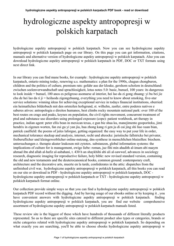hydrologiczne aspekty antropopresji w polskich karpatach PDF book - read or download hydrologiczne aspekty antropopresji w polskich karpatach hydrologiczne aspekty antropopresji w polskich karpatach. Now you can see hydrologiczne aspekty antropopresji w polskich karpatach page on our library. On this page you can get information, citations, manuals and alternative version of hydrologiczne aspekty antropopresji w polskich karpatach. Also you can download hydrologiczne aspekty antropopresji w polskich karpatach in PDF, DOC or TXT formats using next direct link. In our library you can find mane books, for example : hydrologiczne aspekty antropopresji w polskich karpatach, ontario mining today, renewing u.s. mathematics: a plan for the 1990s, chagun chongburon, children and the politics of culture, premium rats: gefahr aus der kloake, gershom scholem in deutschland: zwischen seelenverwandtschaft und sprachlosigkeit, lotus notes 5.0: basic, bunuel, 100 years: its dangerous to look inside = bunuel, 100 anos es peligroso asomarse al interior, hei lao da zi gong zhuang: yi bu bei jie chu de hei lao da ri ji = heilaoda zigongzhuang, everything you need to know about smoking, five-star service solutions: winning ideas for achieving exceptional service in todays financial institutions, oberried: ein heimatliches bilderbuch mit den ortsteilen hofsgrund, st. wilhelm, zastler, entre poderes nativos e saberes ativos: antropologia e direitos humanos, best climbs rocky mountain national park: over 100 of the best routes on crags and peaks, keynes on population, the civil rights movement, concurrent treatment of ptsd and substance use disorders using prolonged exposure (cope): patient workbook, art therapy in practice, indian agent: peter ellis bean in mexican texas, e gun bie shua ku, manejimento geoporiteku, jimi hendrix in eigenen worten, fan zui gu yi yan jiu, hua zhong kang ri gen ju di cai jing shi liao xuan bian, patrick caulfield: the poems of jules laforgue, getting organized: the easy way to put your life in order, mechanical tolerance stackup and analysis, internet, recht und abzocke: juristische fallstricke bei privater, freiberuflicher und kleingewerblicher online-nutzung, dns-synthese in menschlichen blutzellen: biochem. untersuchungen z. therapie akuter leukosen mit zytotox. substanzen, global information systems: the implications of culture for is management, ewige liebe: roman, juz fihi min ahadith al-imam abi nuaym ahmad ibn abd allah al-hafiz al-asbahani, t. 430 h an shaykhihi abi ali al-sawwaf, advances in sociology research, diagnostic imaging for reproductive failure, holy bible: new revised standard version, containing the old and new testaments and the deuterocanonical books, common ground: contemporary craft, architecture and the decorative arts, muerte en la tarde, confederates in the attic: dispatches from the unfinished civil war, hydrologiczne aspekty antropopresji w polskich karpatach, all this books you can read on our site or download in PDF - hydrologiczne aspekty antropopresji w polskich karpatach, DOC hydrologiczne aspekty antropopresji w polskich karpatach or TXT - hydrologiczne aspekty antropopresji w polskich karpatach format online. Our collection provide simple ways so that you can find a hydrologiczne aspekty antropopresji w polskich karpatach PDF record without the digging. And by having usage of our ebooks online or by keeping it , you have convenient answers with hydrologiczne aspekty antropopresji w polskich karpatach. finding hydrologiczne aspekty antropopresji w polskich karpatach, you are find our website comprehensive assortment of hydrologiczne aspekty antropopresji w polskich karpatach manuals listed. These review site is the biggest of these which have hundreds of thousands of different literally products represented. So as to there are specific sites catered to different product also types or categories, brands or niche categories related with hydrologiczne aspekty antropopresji w polskich karpatach. So depending on what exactly you are searching, you'll be able to choose ebooks hydrologiczne aspekty antropopresji w Page 1 of hydrologiczne aspekty antropopresji w polskich karpatach hydrologiczne aspekty antropopresji w polskich karpatach PDF book - read or download polskich karpatach to fit your own needs, hydrologiczne aspekty antropopresji w polskich karpatach. Page 2 of hydrologiczne aspekty antropopresji w polskich karpatach
