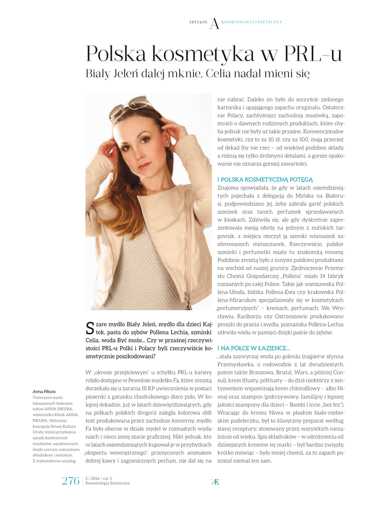 art ykuł A Kosmetologia Estet yczna Polska kosmetyka w PRL-u Biały Jeleń dalej mknie, Celia nadal mieni się nie nabrać. Daleko im było do soczyście zielonego kartonika i upajającego zapachu oryginału. Ostatecznie Polacy, zachłyśnięci zachodnią masówką, zapomnieli o dawnych rodzimych produktach, które chyba jednak nie były aż takie przaśne. Konwencjonalne kosmetyki, czy to za 10 zł, czy za 100, mają przecież od dekad (by nie rzec – od wieków) podobne składy, a różnią się tylko drobnymi detalami, a gorsze opakowanie nie oznacza gorszej zawartości. || Polska kosmetyczną potęgą S Znajoma opowiadała, że gdy w latach osiemdziesiątych pojechała z delegacją do Mińska na Białorusi, podpowiedziano jej, żeby zabrała garść polskich szminek oraz tanich perfumek sprzedawanych w kioskach. Zdziwiła się, ale gdy dyskretnie zaprezentowała swoją ofertę na jednym z mińskich targowisk, z miejsca otoczył ją szeroki wianuszek zaaferowanych mińszczanek. Rzeczywiście, polskie szminki i perfumetki miały tu znakomitą renomę. Podobnie zresztą było z innymi polskimi produktami na wschód od naszej granicy. Zjednoczenie Przemysłu Chemii Gospodarczej „Pollena” miało 14 fabryk rozsianych po całej Polsce. Takie jak warszawska Pollena-Uroda, łódzka Pollena-Ewa czy krakowska Pollena-Miraculum specjalizowały się w kosmetykach „perfumeryjnych” – kremach, perfumach. We Wrocławiu, Raciborzu czy Ostrzeszowie produkowano zare mydło Biały Jeleń, mydło dla dzieci Kaj- proszki do prania i mydła, poznańska Pollena-Lechia tek, pasta do zębów Pollena Lechia, szminki utkwiła wielu w pamięci dzięki paście do zębów. Celia, woda Być może... Czy w przaśnej rzeczywistości PRL-u Polki i Polacy byli rzeczywiście ko- || Na półce w łazience... ...stała zazwyczaj woda po goleniu (najpierw słynna smetycznie poszkodowani? Anna Pikura Twórczyni marki luksusowych biokosmetyków ANNA PIKURA, właścicielka Klinik ANNA PIKURA. Wdrożyła koncepcję Nowej Kultury Urody, której przyświeca zasada konkretnych rezultatów, uzyskiwanych dzięki cennym naturalnym składnikom i metodom. Z wykształcenia socjolog. 276 W „okresie przejściowym” u schyłku PRL-u karierę robiło dostępne w Peweksie mydełko Fa, które zresztą doczekało się u zarania III RP uwiecznienia w postaci piosenki z gatunku chodnikowego disco polo. W kolejnej dekadzie, już w latach dziewięćdziesiątych, gdy na półkach polskich drogerii zaległa kolorowa obfitość produkowana przez zachodnie koncerny, mydło Fa było obecne w dziale mydeł w rozmaitych wydaniach i nieco innej szacie graficznej. Nikt jednak, kto w latach osiemdziesiątych kupował je w przybytkach „eksportu wewnętrznego”, przesyconych aromatem dobrej kawy i zagranicznych perfum, nie dał się na 3 / 2016 / vol. 5 Kosmetologia Estetyczna Przemysławka, o rodowodzie z lat dwudziestych, potem także Brzozowa, Brutal, Wars, a później Consul), krem (tłusty, półtłusty – do dziś niektórzy z sentymentem wspominają krem chlorofilowy – albo Nivea) oraz szampon (pokrzywowy, familijny i lepszej jakości szampony dla dzieci – Bambi i inne „bez łez”). Wracając do kremu Nivea w płaskim biało-niebieskim pudełeczku, był to klasyczny preparat według starej receptury, stosowany przez wszystkich niezależnie od wieku. Spis składników – w odróżnieniu od dzisiejszych kremów tej marki – był bardzo zwięzły, krótko mówiąc – było mniej chemii, za to zapach pozostał niemal ten sam. art ykuł A Z dezodorantami bywało różnie, choć w kiosku Ruchu można było dostać rozmaite cuda, jednak nie odcisnęły się one w ludzkiej pamięci. Znajoma opowiadała, że po raz pierwszy użyła dezodorantu jako 12-latka pod przymusem, gdy młoda wychowawczyni na koloniach z racji awarii wodociągu w ośrodku kolonijnym poleciła wszystkim dziewczynkom zaopatrzyć się w tenże. W kiosku było kilka do wyboru! Znajoma wybrała „Fantazyjny” w liliowym pojemniku z jakąś secesyjną nimfą. Pachniał... no, tak jakoś fantazyjnie. Przez długi czas dostępny był siermiężny dezodorant Basia – zielony płyn w szklanej buteleczce i o zapachu, którego może lepiej nie pamiętać. Wśród mydeł nie było szaleństw. Niektórzy zapamiętali markę Tukan, inni niosącą marzenia o wielkim świecie For You, lecz wątpię, czy ktoś potrafiłby dziś opisać, czym się od siebie różniły. Lubiano łagodniejsze mydła dla dzieci – Kajtek, Jacek i Agatka, Bambino. Dziś w internecie można znaleźć fotografie mydeł z dawnych lat – były wśród nich m.in. Lawendowe oraz Oliwkowe z alantoiną. Opakowania szarobure, bez kapitalistycznego blichtru, ale zawartość przyzwoita. Peerelowskie dzieci pamiętają dość smaczną pomarańczową pastę do zębów w tubce drukowanej w kolorowe zwierzątka albo późniejszą – Biały Ząbek. Dorośli mogli wybierać między pastami Lechia, Nivea, Colodent (marka przejęta później przez Colgate), a także świeżą bułgarską Pomorin. Czy były gorsze niż zachodnie? Chyba nie, ale na pewno mniej wydajne. Koleżanka doznała kiedyś szoku, widząc na letnim obozie Amerykankę z milimetrem kwadratowym pasty na szczoteczce – gdy tymczasem past peerelowskich trzeba było nakładać na całą jej długość. „Ależ dusigrosze z tych Amerykanów” – pomyślała. Zmieniła zdanie, gdy sama spróbowała – amerykańska pasta pieniła się 10 razy bardziej od polskiej. Kosmetologia Estet yczna Kogo było stać, ten w zapachy zaopatrywał się w Peweksie. Zazwyczaj były to wonie z niższej i średniej zachodniej półki, np. marki Coty (najpopularniejsze było Masumi) czy Yardley. Dla mężczyzn krakowska spółdzielnia Florina produkowała szykowną wodę kolońską Prastara, na bazie rzeczywiście prastarej receptury (z XVII wieku), ciekawie opakowaną w wiklinową plecionkę, niczym butelka czegoś mocniejszego albo obecnie wody Johna Varvatosa. 