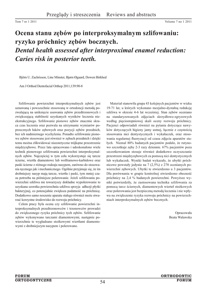 Przeglądy i streszczenia Reviews and abstracts Tom 7 nr 1 2011 Volume 7 no 1 2011 Ocena stanu zębów po interproksymalnym szlifowaniu: ryzyko próchnicy zębów bocznych. Dental health assessed after interproximal enamel reduction: Caries risk in posterior teeth. Björn U. Zachrisson, Line Minster, Bjørn Øgaard, Dowen Birkhed Am J Orthod Dentofacial Orthop 2011;139:90-8 Szlifowanie powierzchni interproksymalnych zębów jest uznawaną i powszechnie stosowaną w ortodoncji metodą pozwalającą na uniknięcie usuwania zębów przedtrzonowych i zwiększającą stabilność uzyskanych wyników leczenia nieekstrakcyjnego. Szlifowanie pionowe zębów znacznie skraca czas leczenia oraz pozwala na utrzymanie wymiarów poprzecznych łuków zębowych oraz pozycji zębów przednich, bez ich nadmiernego wychylenia. Ponadto szlifowanie pionowe zębów stosowane jest również w zębach przednich i dzięki temu można zlikwidować nieestetyczne trójkątne przestrzenie międzyzębowe. Przez lata opracowano i udoskonalono wiele technik pionowego szlifowania powierzchni interproksymalnych zębów. Najczęściej w tym celu wykorzystuje się tarcze ścierne, wiertła diamentowe lub wolframowo-karbidowe oraz paski ścierne z różnego rodzaju nasypem, zarówno do stosowania ręcznego jak i mechanicznego. Ogólnie przyjmuje się, że im drobniejszy nasyp mają tarcze, wiertła i paski, tym mniej czasu potrzeba na późniejsze polerowanie. Jeżeli szlifowaniu powierzchni szkliwa nie towarzyszy dokładne wypolerowanie to uzyskana szorstka powierzchnia szkliwa sprzyja adhezji płytki bakteryjnej, co potencjalnie zwiększa podatność na próchnicę. Dodatkowo samo noszenie aparatu stałego również może stwarzać korzystne środowisko do rozwoju próchnicy. Celem pracy była ocena czy szlifowanie powierzchni interproksymalnych przedtrzonowców i trzonowców prowadzi do zwiększonego ryzyka próchnicy tych zębów. Szlifowanie zębów wykonywano tarczami diamentowymi, następnie powierzchnie te wygładzano stożkowymi wiertłami diamentowymi z drobniejszym nasypem i polerowano. Materiał stanowiła grupa 43 kolejnych pacjentów w wieku 19-71 lat, u których wykonano mezjalno-dystalną redukcję szkliwa w okresie 4-6 lat wcześniej. Stan zębów oceniano na standaryzowanych zdjęciach skrzydłowo-zgryzowych według pięciostopniowej skali oceny rozwoju próchnicy. Pacjenci odpowiadali również na pytania dotyczące nawyków dotyczących higieny jamy ustnej, łącznie z częstością stosowania nici dentystycznych i wykałaczek, oraz stosowania regularnej fluoryzacji od czasu zdjęcia aparatów stałych. Niemal 80% badanych pacjentów podało, że rutynowo szczotkuje zęby 2-3 razy dziennie. 67% pacjentów poza szczotkowaniem stosuje również dodatkowo oczyszczanie przestrzeni międzyzębowych za pomocą nici dentystycznych lub wykałaczek. Wyniki badań wykazały, że ubytki próchnicowe powstały jedynie na 7 (2,5%) z 278 ocenianych powierzchni zębowych. Ubytki te stwierdzono u 3 pacjentów. Dla porównania w grupie kontrolnej stwierdzono obecność próchnicy na 2,4 % badanych powierzchni. Powyższe wyniki potwierdziły, że zastosowana technika szlifowania za pomocą tarcz ściernych, diamentowych wierteł stożkowych oraz polerowania jest bezpieczną metodą leczenia i nie wpływa na zwiększenie ryzyka rozwoju próchnicy na powierzchniach interproksymalnych zębów bocznych. Opracowała Beata Walawska ForumOrthodontic Ortodontyczneforum 54