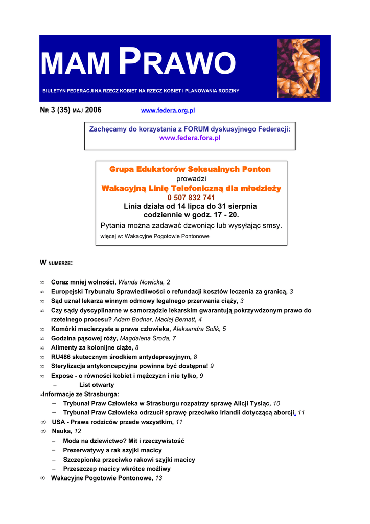MAM PRAWO BIULETYN FEDERACJI NA RZECZ KOBIET NA RZECZ KOBIET I PLANOWANIA RODZINY NR 3 (35) MAJ 2006 www.federa.org.pl Zachęcamy do korzystania z FORUM dyskusyjnego Federacji: www.federa.fora.pl Grupa Edukatorów Seksualnych Ponton prowadzi Wakacyjną Linię Telefoniczną dla młodzieży 0 507 832 741 Linia działa od 14 lipca do 31 sierpnia codziennie w godz. 17 - 20. Pytania można zadawać dzwoniąc lub wysyłając smsy. więcej w: Wakacyjne Pogotowie Pontonowe W NUMERZE: • • • • Coraz mniej wolności, Wanda Nowicka, 2 Europejski Trybunału Sprawiedliwości o refundacji kosztów leczenia za granicą, 3 Sąd uznał lekarza winnym odmowy legalnego przerwania ciąży, 3 Czy sądy dyscyplinarne w samorządzie lekarskim gwarantują pokrzywdzonym prawo do rzetelnego procesu? Adam Bodnar, Maciej Bernatt, 4 • Komórki macierzyste a prawa człowieka, Aleksandra Solik, 5 • Godzina pąsowej róży, Magdalena Środa, 7 • Alimenty za kolonijne ciąże, 8 • RU486 skutecznym środkiem antydepresyjnym, 8 • Sterylizacja antykoncepcyjna powinna być dostępna! 9 • Expose - o równości kobiet i mężczyzn i nie tylko, 9 − List otwarty •Informacje ze Strasburga: − Trybunał Praw Człowieka w Strasburgu rozpatrzy sprawę Alicji Tysiąc, 10 − Trybunał Praw Człowieka odrzucił sprawę przeciwko Irlandii dotyczącą aborcji, 11 • USA - Prawa rodziców przede wszystkim, 11 • Nauka, 12 • − Moda na dziewictwo? Mit i rzeczywistość − Prezerwatywy a rak szyjki macicy − Szczepionka przeciwko rakowi szyjki macicy − Przeszczep macicy wkrótce możliwy Wakacyjne Pogotowie Pontonowe, 13 CORAZ MNIEJ WOLNOŚCI Wanda Nowicka Liga chce ratować swoje notowania kosztem kobiet. Wiceprzewodniczący LPR Wojciech Wierzejski zapowiedział, że Liga ma zamiar zakazać aborcji z przyczyn medycznych. Wierzejski łatwo szafuje cudzym dobrem - zdrowiem kobiet - uważa, że mają rodzić, nawet gdyby to miało zrujnować ich zdrowie. Z kolei Ministerstwo Zdrowia zapowiada nowelizację ustawy o planowaniu rodziny (tzn. ustawy antyaborcyjnej) w celu zakazania prowadzenia badań naukowych z użyciem ludzkich zarodkowych komórek macierzystych. Wygląda więc na to, że nowelizacja, czytaj zaostrzenie przepisów aborcyjnych oraz innych dotyczących rozrodczości, jest tylko kwestią czasu. Sytuacja jest bardzo poważna, bo w rzeczywistości LPR chce całkowitego zakazu aborcji, a cechą charakterystyczną obecnej koalicji jest to, że zawsze przechodzą pomysły najbardziej skrajne. Oczami wyobraźni już widzę posła Rokitę, który za wszelką cenę będzie chciał pokazać, że PO jest za, tylko bardziej. Każdy dzień przynosi nowe coraz to bardziej absurdalne pomysły, które poważnie zagrażają swobodom demokratycznym w Polsce, czy to ze strony LPR czy Pis. Obie te partie ścigają się o to, kto kogo przebije ilością składanych projektów, a także stopniem ich rewolucyjności i drastyczności. PiS dąży do pełnego zawłaszczenia państwa, zaś coraz bardziej widoczna cenzura w mediach publicznych wspiera ten proces. Informacje, które docierają do społeczeństwa, mają być pisowskopoprawne czyli życzliwe dla panującej władzy, inaczej władza ukarze dziennikarzy lustrując ich lub chociażby pozbawiając akredytacji w Sejmie. Instytucje życia społecznego praktycznie już podlegają kontroli PiSu, a społeczeństwo ma się władzy karnie podporządkować. Z kolei LPR zmonopolizował kwestie światopoglądowe oraz edukację, no bo przecież trzeba ukształtować młodzież na wzór wszechpolski. Giertych dobrodziej chce uszczęśliwić młodzież, ogłaszając "amnestie" dla kolejnych roczników młodzieży, która nie zdała matury. Właściwie można poradzić szlachetnemu ministrowi, by w ogóle zniósł maturę. Bo przecież zawsze ktoś może nie zdać i trzeba będzie mu to jakoś wynagrodzić. Ciekawy jest zresztą podział ról w Lidze - Giertych minister gra dobrego wujka, który wszystkich chce uszczęśliwić, Wierzejski odgrywa rolę złego policjanta, który chce wprowadzić karę śmierci i zmuszać chore kobiety do rodzenia. Społeczeństwo popadło w stupor, czekając na kolejne pomysły i zapowiadane na jesień protesty studencko-uczniowskie. Tymczasem dla Warszawianek, które być może wzięły sobie do serca apele polityków i zdecydowały się na dzieci, zabrakło miejsca w warszawskich porodówkach. Aby urodzić, muszą wyjechać ze stolicy. Co by to było, gdyby Polki zaczęły rodzić tyle dzieci, ile w latach 80. Służba zdrowia nie podołałaby takiemu wyzwaniu. Kobiety musiałyby rodzić na ulicy. Nieświadomy tych zagrożeń warszawski Instytut Matki i Dziecka postanowił zachęcić kobiety do rodzenia, sugerując przy pomocy obraźliwej dla kobiet reklamy, że kobiety wolą rodzić odkurzacze niż dzieci. Zamiast brać się za propagandę, na której się nie zna, niech IMD sprawi, by każda warszawianka mogła urodzić dziecko w godnych warunkach i życzliwej atmosferze w Warszawie. Okres urlopowy w pełni, a o sezonie ogórkowym można tylko pomarzyć. LPR o zakazie aborcji, gdy zagrożone jest zdrowie i życie kobiety: Nie może być tak, jak jest teraz, że zagrożenie zdrowia kobiety jest używane jako precedens do zabijania istoty ludzkiej. Czasem istnieje możliwość, że w wyniku ciąży pogorszy się wzrok, i już kobiety chcą dokonywać aborcji. To jest niedopuszczalne. Trzeba to wyeliminować. (Wojciech Wierzejski, Rzeczpospolita, 2.08.2006) Życie płodu też jest ważne, nie można odmówić mu prawa do życia. Najlepiej jak rozsądzi o tym sama natura. (Krzysztof Bosak, Metro, 3.08.2006) 2 EUROPEJSKI TRYBUNAŁU SPRAWIEDLIWOŚCI O REFUNDACJI KOSZTÓW LECZENIA ZA GRANICĄ 16 maja Europejski Trybunał Sprawiedliwości wydał wyrok w sprawie Brytyjki Ivonne Watts, na mocy którego pacjenci mają prawo do zwrotu kosztów leczenia za granicą, w innym państwie Unii Europejskiej, jeśli okres oczekiwania na zabieg we własnym kraju