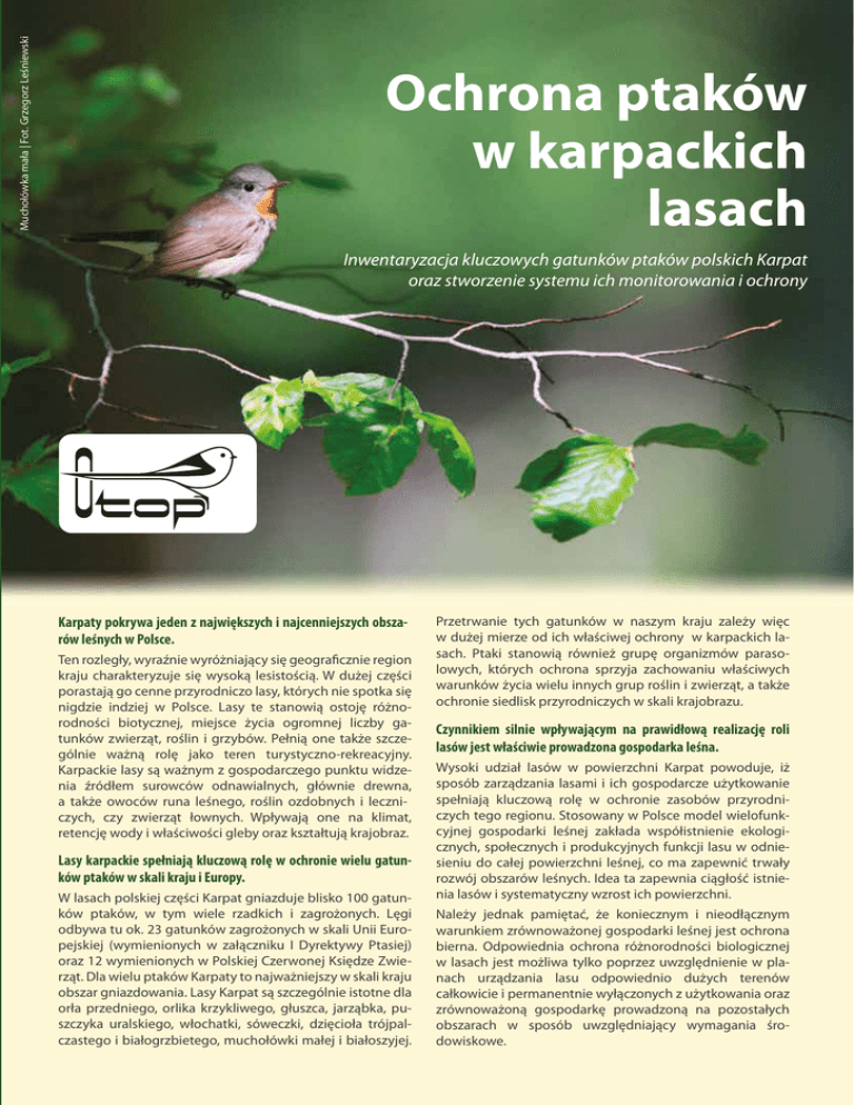 Muchołówka mała | Fot. Grzegorz Leśniewski Ochrona ptaków w karpackich lasach Inwentaryzacja kluczowych gatunków ptaków polskich Karpat oraz stworzenie systemu ich monitorowania i ochrony Karpaty pokrywa jeden z największych i najcenniejszych obszarów leśnych w Polsce. Ten rozległy, wyraźnie wyróżniający się geograficznie region kraju charakteryzuje się wysoką lesistością. W dużej części porastają go cenne przyrodniczo lasy, których nie spotka się nigdzie indziej w Polsce. Lasy te stanowią ostoję różnorodności biotycznej, miejsce życia ogromnej liczby gatunków zwierząt, roślin i grzybów. Pełnią one także szczególnie ważną rolę jako teren turystyczno-rekreacyjny. Karpackie lasy są ważnym z gospodarczego punktu widzenia źródłem surowców odnawialnych, głównie drewna, a także owoców runa leśnego, roślin ozdobnych i leczniczych, czy zwierząt łownych. Wpływają one na klimat, retencję wody i właściwości gleby oraz kształtują krajobraz. Lasy karpackie spełniają kluczową rolę w ochronie wielu gatunków ptaków w skali kraju i Europy. W lasach polskiej części Karpat gniazduje blisko 100 gatunków ptaków, w tym wiele rzadkich i zagrożonych. Lęgi odbywa tu ok. 23 gatunków zagrożonych w skali Unii Europejskiej (wymienionych w załączniku I Dyrektywy Ptasiej) oraz 12 wymienionych w Polskiej Czerwonej Księdze Zwierząt. Dla wielu ptaków Karpaty to najważniejszy w skali kraju obszar gniazdowania. Lasy Karpat są szczególnie istotne dla orła przedniego, orlika krzykliwego, głuszca, jarząbka, puszczyka uralskiego, włochatki, sóweczki, dzięcioła trójpalczastego i białogrzbietego, muchołówki małej i białoszyjej. Przetrwanie tych gatunków w naszym kraju zależy więc w dużej mierze od ich właściwej ochrony w karpackich lasach. Ptaki stanowią również grupę organizmów parasolowych, których ochrona sprzyja zachowaniu właściwych warunków życia wielu innych grup roślin i zwierząt, a także ochronie siedlisk przyrodniczych w skali krajobrazu. Czynnikiem silnie wpływającym na prawidłową realizację roli lasów jest właściwie prowadzona gospodarka leśna. Wysoki udział lasów w powierzchni Karpat powoduje, iż sposób zarządzania lasami i ich gospodarcze użytkowanie spełniają kluczową rolę w ochronie zasobów przyrodniczych tego regionu. Stosowany w Polsce model wielofunkcyjnej gospodarki leśnej zakłada współistnienie ekologicznych, społecznych i produkcyjnych funkcji lasu w odniesieniu do całej powierzchni leśnej, co ma zapewnić trwały rozwój obszarów leśnych. Idea ta zapewnia ciągłość istnienia lasów i systematyczny wzrost ich powierzchni. Należy jednak pamiętać, że koniecznym i nieodłącznym warunkiem zrównoważonej gospodarki leśnej jest ochrona bierna. Odpowiednia ochrona różnorodności biologicznej w lasach jest możliwa tylko poprzez uwzględnienie w planach urządzania lasu odpowiednio dużych terenów całkowicie i permanentnie wyłączonych z użytkowania oraz zrównoważoną gospodarkę prowadzoną na pozostałych obszarach w sposób uwzględniający wymagania środowiskowe. Ptaki Karpat Inwentaryzacja kluczowych gatunków ptaków polskich Karpat oraz stworzenie systemu ich monitorowania i ochrony Liczne gatunki niewyspecjalizowanych ptaków leśnych (generalistów) mają stabilne populacje, natomiast liczebność gatunków bardziej wymagających siedliskowo (specjalistów) zmniejsza się. Zapewnienie przetrwania gatunkom specjalistów i generalistów wymaga kompleksowych rozwiązań, proponowanych m.in. w ramach projektu „Inwentaryzacja kluczowych gatunków ptaków polskich Karpat oraz stworzenie systemu ich monitorowania i ochrony”. Gospodarka leśna wydaje się trwale zachowywać większość siedlisk przyrodniczych, stanowiących miejsce życia dla szerokiej grupy plastycznych gatunków. Niemniej jednak nie wystarcza to do zachowania całej różnorodności awifauny lasów. 1,4 Wskaźnik liczebności 1,2 1,0 0,8 0,6 0 2000 2002 2004 2006 2008 2010 Zmiany wartości (± błąd standardowy) wskaźnika liczebności 34 gatunków pospolitych ptaków leśnych w Polsce w latach 2000-2010. Monitoring ptaków lęgowych wskazuje, że populacje pospolitych gatunków leśnych w skali Europy systematycznie się zmniejszają. W Polsce (i w całej Europie Środkowo-Wschodniej) trend ten nie jest jeszcze tak silny, a liczebność gatunków leśnych jest stabilna lub nawet lekko wzrasta, przynajmniej w odniesieniu do gatunków pospolitych, których zakres tolerancji ekologicznej wobec niekorzystnych zmian w siedlisku jest dość duży. Natomiast sytuacja gatunków bardziej wyspecjalizowanych i tym samym zwykle mniej odpornych na negatywne oddziaływania również i w Polsce jest niekorzystna. Lasy, porastając znaczną powierzchnię obszaru Karpat, mają kluczowe znaczenie dla zachowania dziedzictwa przyrodniczego tego regionu. Fot. Tomasz Wilk Dzięcioł białogrzbiety Dendrocopos leucotos to przykład gatunku „specjalisty”, którego występowanie w lasach uzależnione jest od właściwej struktury siedliska, w tym odpowiednich zasobów zamierających drzew i martwego drewna. Fot. Mateusz Matysiak W wyniku użytkowania gospodarczego dochodzi często do zubożenia struktury ekosystemu o elementy ważne z punktu widzenia wyspecjalizowanych gatunków ptaków o wąskich wymaganiach siedliskowych. Do takich elementów należą przede wszystkim odpowiednio rozległe fragmenty starych lasów o zróżnicowanej strukturze pionowej, z dużym udziałem martwego drewna stojącego i leżącego, zróżnicowanego pod względem formy i gatunku. Analiza obecności martwego drewna w lasach gospodarczych wyraźnie wskazuje, że dzisiejszy model użytkowania często nie zapewnia zachowania tego podstawowego elementu struktury ekosystemu leśnego w stopniu wystarczającym dla gatunków od niego uzależnionych. Należą do nich np. rzadkie gatunki dzięciołów – trójpalczasty i bia