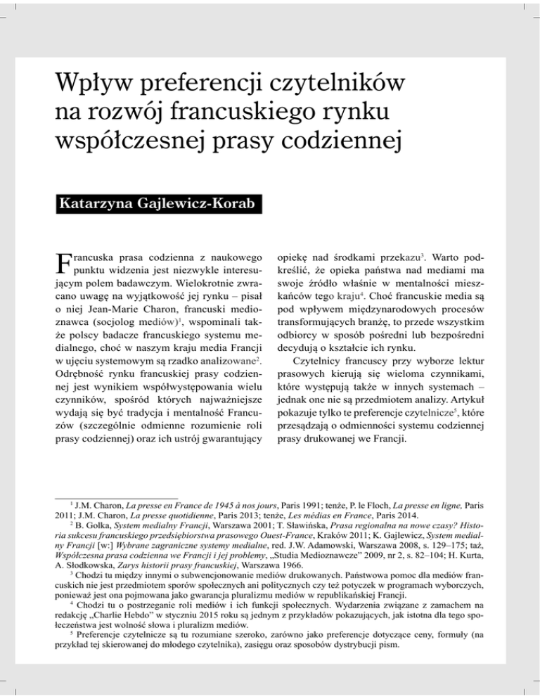 Wpïyw preferencji czytelników na rozwój francuskiego rynku wspóïczesnej prasy codziennej Katarzyna Gajlewicz-Korab F rancuska prasa codzienna z naukowego punktu widzenia jest niezwykle interesującym polem badawczym. Wielokrotnie zwracano uwagĊ na wyjątkowoĞü jej rynku – pisaá o niej Jean-Marie Charon, francuski medioznawca (socjolog mediów)1, wspominali takĪe polscy badacze francuskiego systemu medialnego, choü w naszym kraju media Francji w ujĊciu systemowym są rzadko analizowane2. OdrĊbnoĞü rynku francuskiej prasy codziennej jest wynikiem wspóáwystĊpowania wielu czynników, spoĞród których najwaĪniejsze wydają siĊ byü tradycja i mentalnoĞü Francuzów (szczególnie odmienne rozumienie roli prasy codziennej) oraz ich ustrój gwarantujący 1 opiekĊ nad Ğrodkami przekazu3. Warto podkreĞliü, Īe opieka paĔstwa nad mediami ma swoje Ĩródáo wáaĞnie w mentalnoĞci mieszkaĔców tego kraju4. Choü francuskie media są pod wpáywem miĊdzynarodowych procesów transformujących branĪĊ, to przede wszystkim odbiorcy w sposób poĞredni lub bezpoĞredni decydują o ksztaácie ich rynku. Czytelnicy francuscy przy wyborze lektur prasowych kierują siĊ wieloma czynnikami, które wystĊpują takĪe w innych systemach – jednak one nie są przedmiotem analizy. Artykuá pokazuje tylko te preferencje czytelnicze5, które przesądzają o odmiennoĞci systemu codziennej prasy drukowanej we Francji. J.M. Charon, La presse en France de 1945 à nos jours, Paris 1991; tenĪe, P. le Floch, La presse en ligne, Paris 2011; J.M. Charon, La presse quotidienne, Paris 2013; tenĪe, Les médias en France, Paris 2014. 2 B. Golka, System medialny Francji, Warszawa 2001; T. SáawiĔska, Prasa regionalna na nowe czasy? Historia sukcesu francuskiego przedsiĊbiorstwa prasowego Ouest-France, Kraków 2011; K. Gajlewicz, System medialny Francji [w:] Wybrane zagraniczne systemy medialne, red. J.W. Adamowski, Warszawa 2008, s. 129–175; taĪ, Wspóáczesna prasa codzienna we Francji i jej problemy, „Studia Medioznawcze” 2009, nr 2, s. 82–104; H. Kurta, A. Sáodkowska, Zarys historii prasy francuskiej, Warszawa 1966. 3 Chodzi tu miĊdzy innymi o subwencjonowanie mediów drukowanych. PaĔstwowa pomoc dla mediów francuskich nie jest przedmiotem sporów spoáecznych ani politycznych czy teĪ potyczek w programach wyborczych, poniewaĪ jest ona pojmowana jako gwarancja pluralizmu mediów w republikaĔskiej Francji. 4 Chodzi tu o postrzeganie roli mediów i ich funkcji spoáecznych. Wydarzenia związane z zamachem na redakcjĊ „Charlie Hebdo” w styczniu 2015 roku są jednym z przykáadów pokazujących, jak istotna dla tego spoáeczeĔstwa jest wolnoĞü sáowa i pluralizm mediów. 5 Preferencje czytelnicze są tu rozumiane szeroko, zarówno jako preferencje dotyczące ceny, formuáy (na przykáad tej skierowanej do máodego czytelnika), zasiĊgu oraz sposobów dystrybucji pism. Katarzyna Gajlewicz-Korab 62 Tradycje czytelnicze a wspóáczesny rynek prasy codziennej o zasiĊgu ogólnokrajowym Francuscy odbiorcy codziennej prasy ogólnokrajowej są przywiązani do swoich tradycyjnych tytuáów, które traktują jako rodzaj dobra narodowego. NaleĪą do nich dzienniki, które we francuskiej opinii publicznej są uznawane za wiarygodne Ĩródáo informacji, a ich renoma jest znana na caáym Ğwiecie. NaleĪą do nich „Le Figaro” i „Le Monde”. Innymi „dobrami narodowymi” są takie tytuáy, jak „Libération”, „La Croix”, „L’Equipe” i „Les Echos”, a takĪe „L’Humanité” i „Aujourd’hui en France”. Francuski rynek codziennej prasy drukowanej, podobnie jak w innych krajach, od lat jest pogrąĪony w kryzysie. Przyczyn tego stanu rzeczy jest wiele i wielokrotnie byáy one przedmiotem analiz naukowych6. Statystycznie kaĪdy Francuz od 15. roku Īycia czytaá w 2015 roku 1,3 gazety codziennej, a 41 proc. spoáeczeĔstwa francuskiego siĊgaáo przynajmniej po jeden dziennik. Czytelnikami gazet, a takĪe wszystkich tytuáów prasowych, byli przewaĪnie mieszkaĔcy miast. W domu czytaáo prasĊ 68 proc. odbiorców, a tylko 6,6 proc. wykorzystywaáo w tym celu czas wolny w Ğrodkach komunikacji miejskiej. Wart odnotowania jest fakt, Īe w 2015 roku czytelnictwo prasy codziennej na tabletach i smartfonach wzrosáo o prawie o 8,5 proc. w sektorze prasy ogólnokrajowej oraz o 3,7 proc. w sektorze dzienników regionalnych7. W podziale na páeü nie widaü duĪych róĪnic, bowiem podobne proporcje moĪna zauwaĪyü takĪe w innych krajach Europy (tabela 2). Spore znaczenie dla czytelnictwa w 2015 roku miaáa digitalizacja wydaĔ nie tylko ze wzglĊdu na áatwą i mobilną formĊ konsumpcji prasy, ale takĪe z uwagi na cenĊ8. Dla máodego pokolenia cena prasy jest za wysoka, podczas gdy wydania online są taĔsze od wydaĔ drukowanych (co moĪna stwierdziü po analizie cenników zamieszczonych na stronach in- Tabela 1. Nakáady francuskiej prasy ogólnokrajowej w roku 2015 Pozycja Tytuá Nakáad Wzrost i spadek (w proc.) 1. „Le Figaro” 311 326 -0,95 2. „Le Monde” 267 897 -1,91 3. „L’Equipe” Edition Générale 223 681 1,76 4. „Aujourd’hui en France” 138 999 -6,22 5. „Les Echos” 126 645 1,18 6. „La Croix” 92 280 -0,93 7. „Libération” 88 395 -5,74 8. „L’Humanité” 36 931 -3,31 9. „International New York Times” 16 220 -3,84 ħródáo: Classement presse quotidienne nationale 2015, http://www.acpm.fr/Chiffres/La-Presse/La-PressePayante/Presse-Quotidienne-Nationale# [dostĊp: 24.03.2016] 6 Pisaá o tym juĪ wczeĞniej Bartáomiej Golka, tegoĪ, System medialny…, dz. cyt., s. 139. AudiPresse One 2014/2015, http://www.audipresse.fr/node.php?id=1220 [dostĊp: 13.05.2016]. 8 We Francji z roku na rok moĪna zaobserwowaü coraz wiĊksze zainteresowanie cyfrową dystrybucją artykuáów prasowych. Cytowane raporty AudiPresse One i Reuters Digital News Report pokazują, Īe nie tylko wzrasta liczba wydaĔ na smartfony, tablety,