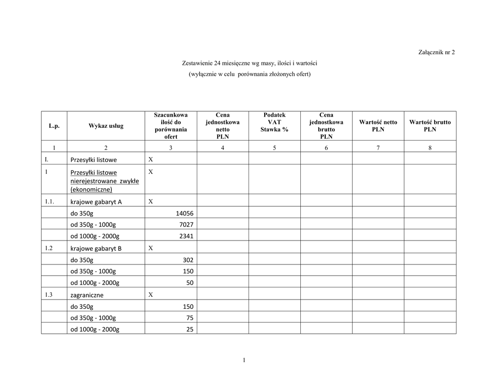 Załącznik nr 2 Zestawienie 24 miesięczne wg masy, ilości i wartości (wyłącznie w celu porównania złożonych ofert) L.p. Wykaz usług Szacunkowa ilość do porównania ofert 1 2 3 I. Przesyłki listowe X 1 Przesyłki listowe nierejestrowane zwykłe (ekonomiczne) X 1.1. krajowe gabaryt A X do 350g 1.2 1.3 7027 od 1000g - 2000g 2341 302 od 350g - 1000g 150 od 1000g - 2000g 50 do 350g Cena jednostkowa brutto PLN Wartość netto PLN Wartość brutto PLN 4 5 6 7 8 X do 350g zagraniczne Podatek VAT Stawka % 14056 od 350g - 1000g krajowe gabaryt B Cena jednostkowa netto PLN X 150 od 350g - 1000g 75 od 1000g - 2000g 25 1 2.1 priorytetowe X 2.1.1 krajowe gabaryt A X 2.1.2 2.1.3 do 350g 567 od 350g - 1000g 283 od 1000g - 2000g 95 krajowe gabaryt B X do 350g 92 od 350g - 1000g 45 od 1000g - 2000g 15 zagraniczne X do 350g 19 od 350g - 1000g 10 od 1000g - 2000g 3 3 Przesyłki polecone X 3.1 polecone ekonomiczne X 3.1.1 krajowe gabaryt A X 3.1.2 3.1.3 do 350g 6724 od 350g - 1000g 3362 od 1000g - 2000g 1120 krajowe gabaryt B X do 350g 567 od 350g - 1000g 283 od 1000g - 2000g 94 zagraniczne do 350g X 72 2 od 350g - 1000g 36 od 1000g - 2000g 12 3.2 priorytetowe X 3.2.1 krajowe gabaryt A X 3.2.2 3.2.3 II. 1. 2 do 350g 524 od 350g - 1000g 261 od 1000g - 2000g 87 krajowe gabaryt B X do 350g 34 od 350g - 1000g 17 od 1000g - 2000g 5 zagraniczne X do 350g 25 od 350g - 1000g 12 od 1000g - 2000g 5 Paczki Paczki pocztowe ekonomiczne krajowe gabaryt A X X do 2 kg 95 do 5 kg 77 do 10g 2 do 15kg Paczki pocztowe ekonomiczne krajowe gabaryt B 2 do 1kg X 17 3 3 4 5 6 do 2 kg 5 do 5kg Paczki pocztowe priorytetowe krajowe gabaryt A do 2 kg Przesyłki reklamowe kopertowane do 50g Przesyłki pobraniowe z przekazaniem kwoty krajowe Usługi potwierdzenia odbioru 2 6.1 a krajowe 6.2 b zagraniczne 2 439624 634 2054 1951 103 Opis usług Przesyłki listowe: Gabaryt A - min 9 x 14mm, max wys. 2cm, długość 32,5cm szerokość 23cm do 350g od 350g - 1000g od 1000g - 2000g Gabaryt B - jeżeli jeden z wymiarów przekracza min. wysokość 2 cm i szer. 23cm, największy wymiar nie może przekroczyć 60cm do 350g od 350g - 1000g od 1000g - 2000g 4 Paczki: Gabaryt A minimum - wymiary strony adresowej nie mogą być mniejsze niż 90 x 140mm; maksimum - żaden z wymiarów nie może przekroczyć: długość 600mm, szerokość 500 mm, wysokość 300mm Gabaryt B minimum - jeśli choć jeden z wymiarów przekracza długość 600mm, szerokość 500mm, wysokość 300mm; maksimum - suma długości i największego obwodu mierzonego w innym kierunku niż długość - 3000mm, przy czym największy wymiar nie może przekraczać 1500mm ..........................,dn.................... …………………………………………………… Podpisy wykonawcy lub osób upoważnionych do składania oświadczeń woli w imieniu wykonawcy 5