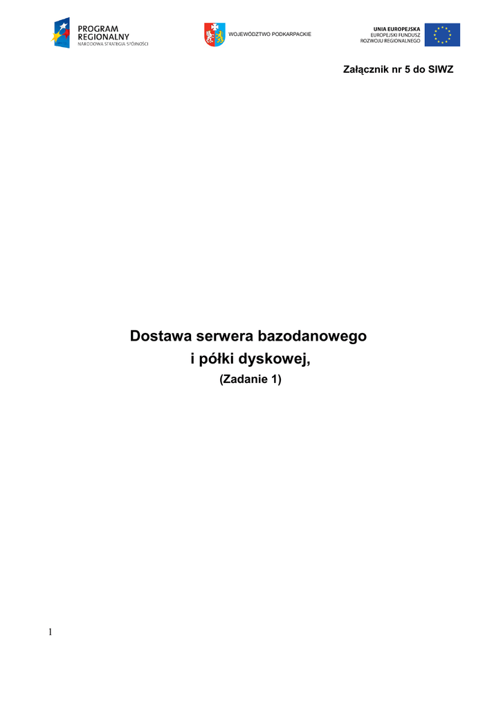 WOJEWÓDZTWO PODKARPACKIE Załącznik nr 5 do SIWZ Dostawa serwera bazodanowego i półki dyskowej, (Zadanie 1) 1 WOJEWÓDZTWO PODKARPACKIE 1. Serwer bazodanowy – 1 szt. Producent …………………………………………………………………. model ……………………………………………………………………… Lp. Parametr Minimalne(maksymalne) parametry wymaganie 1. Obudowa Minimalnie 1U do instalacji w standardowej szafie RACK 19”, dostarczona wraz z szynami i prowadnicą kabli. Możliwość instalacji minimalnie 8 dysków twardych Hot-Plug. Możliwość zabezpieczenia dysków twardych przed nieuprawnionym wyjęciem. 2. Płyta główna Płyta główna z możliwością zainstalowania do dwóch procesorów, cztero, sześcio lub ośmiordzeniowych. Płyta główna musi być zaprojektowana przez producenta serwera i oznaczona jego znakiem firmowym 3. Chipset Dedykowany przez producenta procesora do pracy w serwerach dwuprocesorowych 4. Procesor Procesor sześciordzeniowy klasy x86 dedykowany do pracy w serwerach zaprojektowany do pracy w układach dwuprocesorowych, umożliwiający osiągnięcie wyniku min. 441 punktów w teście SPECint_rate_base2006 w konfiguracji dwuprocesorowej, dostępnym na stronie www.spec.org 2 5. RAM 64GB DDR3 RDIMM 1333 MHz, na płycie głównej powinno znajdować się minimum 24 sloty przeznaczonych dla pamięci. Płyta główna powinna obsługiwać do 768GB pamięci DDR3. 6. Zabezpiecz Memory Rank Sparing, Memory Mirror, SBEC, enia pamięci Lockstep RAM 7. Napęd optyczny DVD+/-RW SATA 8. Gniazda PCI Minimum 2 x PCI-Express trzeciej generacji 9. Interfejsy sieciowe Minimum 4 porty typu Gigabit Ethernet Base-T z wsparciem dla protokołu IPv6 oraz możliwością iSCSI boot. Interfejsy sieciowe nie mogą zajmować żadnego z dostępnych slotów PCI-Express. Możliwość instalacji wymiennie modułów udostępniających 2 porty Gigabit Ethernet Base-T oraz 2 porty 10Gb Ethernet Spełnia (TAK/NIE) Parametry oferowane (opis) WOJEWÓDZTWO PODKARPACKIE SFP+ Dodatkowa dwuportowa karta 8Gb FC 10. Dyski twarde Możliwość instalacji dysków twardych SATA, SAS, NearLine SAS i SSD. Zainstalowane 2 dyski twarde o pojemności min. 300GB SAS 10k RPM skonfigurowane fabrycznie w RAID 1 11. Kontroler RAID Zainstalowany sprzętowy kontroler dyskowy, posiadający min. 512MB nieulotnej pamięci cache , możliwe konfiguracje poziomów RAID : 0, 1, 5, 6, 10, 50, 60 12. Porty 5 x USB 2.0 z czego 2 USB na przednim panelu obudowy, 2 na tylnym panelu obudowy i jeden wewnętrzny, VGA, 1 port szeregowy 13. Video Zintegrowana karta graficzna, umożliwiająca rozdzielczość min. 1280x1024. 14. Elementy Min. Zasilacze, wentylatory redundantne HotPlug 15. Zasilacze Redundantne, Hot-Plug maksymalnie 750W każdy. 16. Bezpieczeń stwo Zintegrowany z płytą główną moduł TPM. Wbudowany czujnik otwarcia obudowy współpracujący z BIOS i kartą zarządzającą. 17. Diagnostyka Panel LCD lub LED umieszczony na froncie obudowy, umożliwiający wyświetlenie informacji o stanie procesora, pamięci, dysków, BIOS’u, zasilaniu. 18. Karta Możliwość instalacji niezależnej od Zarządzania zainstalowanego na serwerze systemu operacyjnego posiadającej dedykowane port RJ-45 Gigabit Ethernet umożliwiającej: - zdalny dostęp do graficznego interfejsu Web karty zarządzającej - zdalne monitorowanie i informowanie o statusie serwera (m.in. prędkości obrotowej wentylatorów, konfiguracji serwera, ) - szyfrowane połączenie (SSLv3) oraz autentykacje i autoryzację użytkownika - możliwość podmontowania zdalnych wirtualnych napędów - wirtualną konsolę z dostępem do myszy, klawiatury - wsparcie dla IPv6 - wsparcie dla WSMAN (Web Service for Managament); SNMP; IPMI2.0, VLAN tagging, Telnet, SSH - możliwość zdalnego monitorowania w czasie rzeczywistym poboru prądu przez serwer - możliwość zdalnego ustawienia limitu poboru prądu przez konkretny serwer - integracja z Active Directory 3 WOJEWÓDZTWO PODKARPACKIE - możliwość obsługi przez dwóch administratorów jednocześnie - wsparcie dla dynamic DNS - wysyłanie do administratora maila z powiadomieniem o awarii lub zmianie konfiguracji sprzętowej - możliwość podłączenia lokalnego poprzez złącze RS-232 - możliwość instalacji karty SD 8GB 19. Inne Możliwość instalacji wewnętrznego modułu z redundantnymi kartami SD o pojemności min. 2GB każda. Możliwość konfigurowania mirroru pomiędzy redundantnymi kartami SD. 20. Certyfikaty Serwer musi być wyprodukowany zgodnie z normą ISO-9001 oraz ISO-14001. Deklaracja CE. Oferowany serwer musi znajdować się na liście Windows Server Catalog i posiadać status „Certified for Windows” dla systemów Windows Server 2008 R2 x64, x64, x86. 21. Warunki gwarancji Przynajmniej trzy lata gwarancji. Gwarantowany czas naprawy do 24 godzin. Naprawa w miejscu instalacji sprzętu. Firma serwisująca musi posiadać ISO 9001:2000 na świadczenie usług serwisowych oraz posiadać autoryzacje producenta serwera – dokumenty potwierdzające załączyć do oferty. Oświadczenie producenta serwera, że w przypadku nie wywiązywania się z obowiązków gwarancyjnych oferenta lub firmy serwisującej, przejmie na siebie wszelkie zobowiązania związane z serwisem. 22. Dokumentac Zamawiający wymaga dokumentacji w języku ja polskim lub angielskim. użytkownika Możliwość telefonicznego sprawdzenia konfiguracji sprzętowej serwera oraz warunków gwarancji po podaniu numeru seryjnego bezpośrednio u producenta lub jego przedstawiciela. 4 WOJEWÓDZTWO PODKARPACKIE 2. Półka dyskowa do macierzy EMC VNX5100 wraz z konfiguracją – 1szt. Producent ………………………………………………………………. Model …………………………………………………………………… Lp. Parametr Minimalne(maksymalne) parametry Spełnia Parametry oferowane wymaganie (Tak/Nie) 1.0 Półka Dodatkowa półka (3U) do macierzy dyskowej EMC VNX 