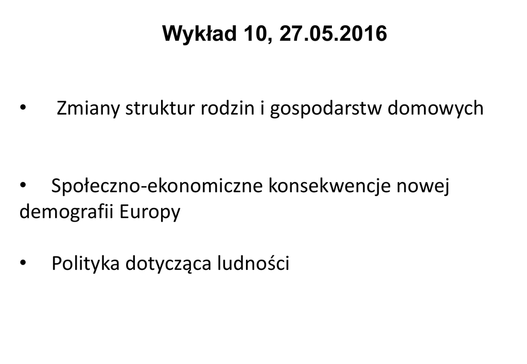 Wykład 10, 27.05.2016 • Zmiany struktur rodzin i gospodarstw domowych • Społeczno-ekonomiczne konsekwencje nowej demografii Europy • Polityka dotycząca ludności Źródło: I.E.Kotowska, 1994, Prognozowanie gospodarstw domowych. Problemy i metody. Monografie i Opracowania, 396, SGH, Warszawa. • Rodzina - grupa osób powiązane poprzez związki formalne lub nieformalne, więzy krwi lub adopcję • gospodarstwo domowe - grupa wyłoniona na podstawie kryterium współzamieszkiwania i wspólnego utrzymywania się Rodzina biologiczna - para osób płci przeciwnej bez dzieci lub z dziećmi (rodziny pełne) oraz samotny rodzic z dzieckiem (rodzina niepełna) - rodzina nuklearna (NSP 2002, 2011) Typy rodzin: małżeństwo (partnerzy) bez dzieci, małżeństwo (partnerzy) z dziećmi, samotna matka z dzieckiem, samotny ojciec z dzieckiem rodzina zrekonstruowana: para z jednym lub większą liczbą dzieci, z których co najmniej jedno nie jest wspólnym dzieckiem tej pary tzn. jest naturalnym lub adoptowanym dzieckiem jednego z nich rodzina rozszerzona: wśród członków gospodarstwa domowego oprócz rodziny biologicznej jest osoba spokrewniona w linii prostej lub bocznej z jednym członkiem rodziny biologicznej (np. rodzice z dziećmi i ojciec żony) • obiekty zbiorowego zakwaterowania: obiekty stałego zamieszkania (np. domy opieki dla osób starszych, zakłady opiekuńczo-lecznicze, klasztory, domy zakonne), obiekty dłuższego zamieszkania (domy studenckie, internaty, hotele pracownicze, domy dziecka, zakłady karne), obiekty krótkotrwałego pobytu (hotele, szpitale, pensjonaty itp.). Odpowiada to kategorii gospodarstwa instytucjonalne (Eurostat): tworzone osoby przebywające w obiektach, które podlegają jednakowym zasadom organizacji pobytu w tych miejscach. Kryteria demograficzne klasyfikacji gospodarstw domowych • liczba osób, • liczba rodzin • typ rodziny, • skład gospodarstwa Głowa rodziny; głowa gospodarstwa Źródło utrzymania: • dochody z pracy: rolnicze, pozarolnicze • niezarobkowe (emerytury, renty, zasiłki dla bezrobotnych, zasiłki z pomocy społecznej) • dochody z własności Grupy społeczno-ekonomiczne gospodarstw domowych Czynniki zmian liczby i struktury gospodarstw domowych demograficzne • liczba i struktura ludności według płci i wieku • zmiany wzorca tworzenia i rozpadu rodzin (spadek skłonności do zawierania związków formalnych, opóźnianie zawierania małżeństw, wzrost częstości kohabitacji, wzrost częstości rozwodów); • spadek płodności; • spadek umieralności zróżnicowany według płci; • wzorce opuszczania domu rodzinnego przez dzieci i współzamieszkiwania osób dorosłych (zamężne dzieci, spokrewnione osoby starsze, osoby niespokrewnione) ekonomiczno-społeczne • sytuacja mieszkaniowa (podaż mieszkań, koszt ich pozyskania i eksploatacji), • sytuacja ekonomiczna członków gospodarstwa (dochody, aktywność ekonomiczna), • zmiany podziału pracy w gospodarstwie wynikające głównie ze wzrostu aktywności ekonomicznej kobiet i zmian ról kulturowych kobiet i mężczyzn, • sytuacja na rynku pracy, rola ekonomiczna gospodarstwa jako jednostki wytwarzającej dobra i usługi oraz jednostki konsumpcyjnej • migracje Średnia wielkość gospodarstwa w latach 1960-2011 Gospodarstwa 1960 1970 1978 1988 2002 2011 Ogółem 3,47 3,39 3,11 3,10 2,84 2,82 Miasta 3,12 3,03 2,85 2,86 2,60 2,54 Wieś 3,87 3,87 3,55 3,56 3,33 3,40 Struktura gospodarstw według wielkości w latach 1960- 2011 Gospodarstwa 1960 1970 1978 1988 2002 2011 Jednoosobowe Dwuosobowe Trzy- i czteroosobowe Pięcioosobowe i większe 16,2 18,5 38,8 16,1 18,8 41,2 17,4 21,7 44,0 18,3 22,3 42,3 24,8 23,2 37,9 24,0 25,7 36,4 26,5 23,9 16,9 17,1 14,1 13,9 Źródło: I.E.Kotowska, Analiza i prognozowanie gospodarstw domowych, w: Procesy demograficzne i metody ich analizy, red.J.Kurkiewicz, Akademia Ekonomiczna w Krakowie, 2010; GUS 2013, Gospodarstwa domowe w 2011 roku – wyniki spisu ludności i mieszkań 2011, Warszawa. A.Abramowska-Kmon, 2014, Zmiany wielkości i składu gospodarstw domowych oraz struktury rodzin, w: I.E.Kotowska (red.), Niska dzietność w Polsce w kontekście percepcji Polaków. Diagnoza Społeczna 2013, raport tematyczny, Warszawa, s.27, 28. M.Mynarska, Zmiany zachowań dotyczących rodziny w Polsce na tle innych krajów Europy, w: I.E.Kotowska (red.), Niska dzietność w Polsce w kontekście percepcji Polaków. Diagnoza Społeczna 2013, raport tematyczny, Warszawa, s.22 Starzenie się populacji – struktura gospodarstw domowych według wieku członków Gospodarstwa, w których skład wchodzą osoby młode (0-29 lat), osoby w średnim wieku (3059 lat) oraz osoby starsze (60 lat i więcej) Struktura gospodarstw według składu pokoleniowego w latach 2002-2011 (w %) Gospodarstwa z osobami 2002 2011 Wyłącznie młodymi 8,4 6,9 Wyłącznie w średnim wieku 15,0 15,8 Wyłącznie starsze 18,9 19,3 Młodymi i w średnim wieku 40,9 35,7 Młodymi i starszymi 2,1 1,9 W średnim wieku i starszymi 7,6 Młodymi, w średnim wieku i starszymi 7,5 17,2 9,8 22,1 10,4 Źródło: tabela 8, GUS 2014, Gospodarstwa domowe i rodziny. Charakterystyka demograficzna, Warszawa. Łącznie gospodarstwa z osobą starszą jako członkiem stanowiły w 2011 roku 43,4%; wzrost udziału gospodarstw dwurodzinnych w latach 2002-2011 znajduje obecnie odzwierciedlenie we wzroście udziału gospodarstw z dwoma i trzema pokoleniami. Konsekwencje zmian struktury wieku ludności Powołana została specjalna grupa robocza przy Komisji Europejskiej (AWG – Working Group on Ageing Populations and Sustainability), która co kilka lat przygotowuje projekcje ludności oraz projekcje wydatków publicznych na emerytury i renty, ochronę zdrowia, opiekę długoterminową, itd. http://europa.eu/epc/working_groups/ageing_en.htm Ageing Report 2009, Ageing Report 2012, Ageing Report 2015 Makromodel AWG Assumptions Projections Unemployment benefits Labour Productivity Pr