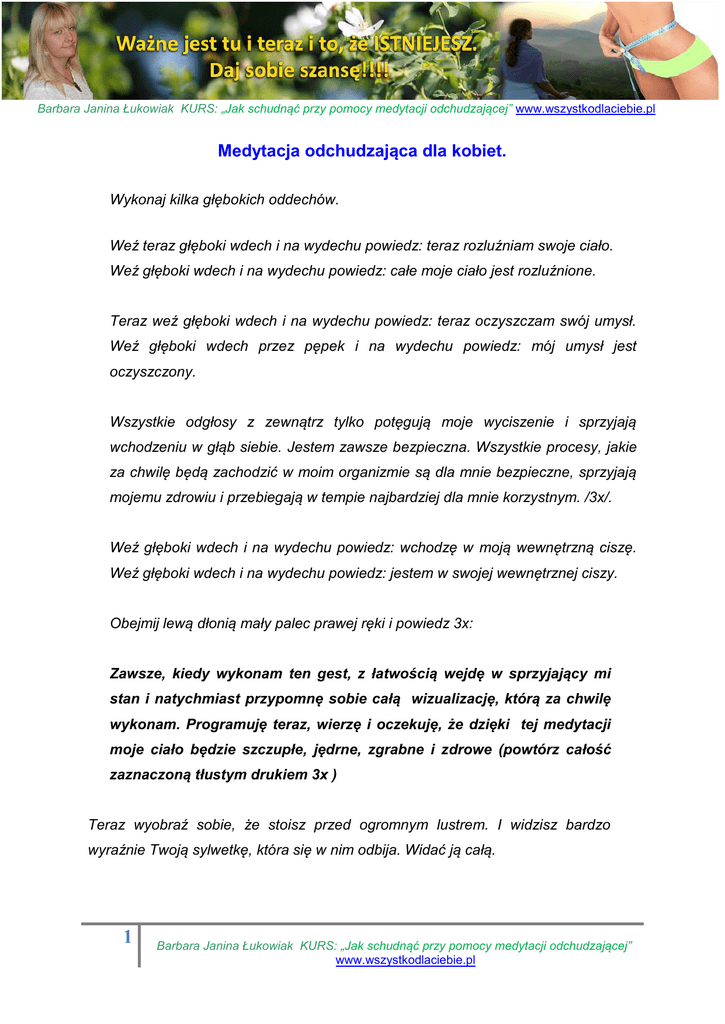Barbara Janina Łukowiak KURS: „Jak schudnąć przy pomocy medytacji odchudzającej” www.wszystkodlaciebie.pl Barbara Janina Łukowiak KURS: „Jak schudnąć przy pomocy medytacji odchudzającej” www.wszystkodlaciebie.pl Medytacja odchudzająca dla kobiet. Wykonaj kilka głębokich oddechów. Weź teraz głęboki wdech i na wydechu powiedz: teraz rozluźniam swoje ciało. Weź głęboki wdech i na wydechu powiedz: całe moje ciało jest rozluźnione. Teraz weź głęboki wdech i na wydechu powiedz: teraz oczyszczam swój umysł. Weź głęboki wdech przez pępek i na wydechu powiedz: mój umysł jest oczyszczony. Wszystkie odgłosy z zewnątrz tylko potęgują moje wyciszenie i sprzyjają wchodzeniu w głąb siebie. Jestem zawsze bezpieczna. Wszystkie procesy, jakie za chwilę będą zachodzić w moim organizmie są dla mnie bezpieczne, sprzyjają mojemu zdrowiu i przebiegają w tempie najbardziej dla mnie korzystnym. /3x/. Weź głęboki wdech i na wydechu powiedz: wchodzę w moją wewnętrzną ciszę. Weź głęboki wdech i na wydechu powiedz: jestem w swojej wewnętrznej ciszy. Obejmij lewą dłonią mały palec prawej ręki i powiedz 3x: Zawsze, kiedy wykonam ten gest, z łatwością wejdę w sprzyjający mi stan i natychmiast przypomnę sobie całą wizualizację, którą za chwilę wykonam. Programuję teraz, wierzę i oczekuję, że dzięki tej medytacji moje ciało będzie szczupłe, jędrne, zgrabne i zdrowe (powtórz całość zaznaczoną tłustym drukiem 3x ) Teraz wyobraź sobie, że stoisz przed ogromnym lustrem. I widzisz bardzo wyraźnie Twoją sylwetkę, która się w nim odbija. Widać ją całą. 1 Barbara Janina Łukowiak KURS: „Jak schudnąć przy pomocy medytacji odchudzającej” www.wszystkodlaciebie.pl Barbara Janina Łukowiak KURS: „Jak schudnąć przy pomocy medytacji odchudzającej” www.wszystkodlaciebie.pl Teraz pomyśl przez chwilę jak by to było, gdybyś była szczupła. Pomyśl o Twojej idealnej sylwetce. Jakbyś wyglądała? Jakby wyglądało Twoje ciało? Wyobraź sobie wszystkie możliwe szczegóły związane z Twoim szczupłym ciałem. Jak wyglądają Twoje: nogi, uda pośladki, brzuch, klatka piersiowa, ramiona, twarz? W miarę, jak sobie to wszystko wyobrażasz dostrzegasz, że w Twoim odbiciu w lustrze również zachodzą zmiany. Widzisz w nim wyraźnie osobę, jaką chciałabyś być i jaką będziesz już niedługo. Stań bokiem do lustra i sprawdź jak wygląda z tej pozycji odbicie Twojej szczupłej sylwetki w lustrze. A teraz sprawdź jak wygląda odbicie Twojego całego szczupłego ciała, kiedy jesteś zwrócona do lustra przodem. A teraz wyobraź sobie jak jędrne w dotyku jest to nowe ciało: jędrne uda, zgrabne pośladki, płaski brzuch, jędrne piersi, szczupłe ramiona, cudowna szeroko uśmiechnięta twarz. To wszystko tak Ci się podoba, że chciałabyś poczuć się dokładnie tak samo, jak Twoje szczupłe odbicie w lustrze. Dlatego wchodzisz do środka lustra, wchodzisz w szczupłą wersję Ciebie. Cały nadmiar tłuszczu, który się w Tobie znajduje po prostu gdzieś wyparowuje a Ty doskonale wpasowujesz się w tą szczupłą sylwetkę. Już w niej się znajdujesz. Poczuj komfort i lekkość nowego ciała. Dotknij je. Wykonaj skłon do palców stóp. Jak się czujesz wykonując ten skłon? Wbiegnij po schodach na pierwsze piętro. Jak się czujesz biegnąc po schodach? A teraz pograj po prostu w piłkę, poskacz na skakance albo pobiegaj czy popływaj. Jakież to cudowne uczucie, kiedy z łatwością możesz wykonywać te wszystkie czynności i wciąż czujesz się lekko i masz nadmiar energii! Zobacz w wyobraźni siebie, jak mierzysz swój obwód ud, pasa, bioder i piersi. Na centymetrze widać nowe wartości! Wyszczuplałaś w każdym miejscu, w 2 Barbara Janina Łukowiak KURS: „Jak schudnąć przy pomocy medytacji odchudzającej” www.wszystkodlaciebie.pl Barbara Janina Łukowiak KURS: „Jak schudnąć przy pomocy medytacji odchudzającej” www.wszystkodlaciebie.pl jakim pragnęłaś być smuklejsza. Zobacz, jak zakładasz używane dotychczas spodnie lub spódnicę i tu czeka Cię też niespodzianka. Będziesz musiała przeszyć guzik albo założyć pasek, ponieważ spodnie i spódnica po prostu są za luźne, wręcz spadają z Ciebie. To samo dzieje się z bluzką płaszczem. Może o wiele prościej jest sprawić sobie nowe, szczuplejsze ubrania? Idziesz zatem do sklepu i kupujesz sobie nowy, wystrzałowy ciuch. Prosisz oczywiście o nowy rozmiar, mniejszy o numer lub kilka numerów od tego, który nosiłaś do tej pory. Zakładasz na siebie nowe ubrania. Jak się przy tym czujesz? Wychodzisz ze sklepu i spotykasz na ulicy dawno nie widzianego znajomego, a on z ledwością może cię poznać! To Ty? Myślałem, że to jakaś znana mi modelka z telewizji. Wyglądasz świetnie. Co zrobiłaś, że masz tak doskonałą figurę i wyglądasz o parę lat młodziej? Musisz koniecznie zdradzić mi tą tajemnicę źródła młodości. Usłysz wyraźnie i poczuj składane ci przez Twoich znajomych i bliskich gratulacje i wyrazy podziwu: świetnie wyglądasz, jesteś taka szczupła i zgrabna! Jesteś jakaś inna taka radosna, zadowolona z życia i ta twoja nowa figura. No! No! Teraz stajesz przed wystawą sklepową lub ogromnym lustrem i widzisz siebie dokładnie taką, jaką opisuje twój znajomy. Dokładnie taką, o jakiej zawsze marzyłaś. Jaką zawsze sobie wyobrażałaś.: atrakcyjną, uśmiechniętą, zrelaksowaną, szczęśliwą, smukłą, szczupłą i zadowoloną z siebie i z życia. Twoje piersi są jędrne, sprężyste i krągłe, Twoja talia jest wysmukła, Twoje biodra odpowiednio krągłe, Twoje uda i nogi zgrabne, wysmukłe, gładkie i jędrne. Twoje skóra gładka i sprężysta. Twoja twarz uśmiechnięta i szczęśliwa. Wchodzisz na wagę. Spoglądasz na wskaźnik i oto widzisz na niej dokładnie tyle kilogramów, ile chcesz ważyć! Teraz odczuj bardzo wyraźnie radość i szczęście. Poczuj wyraźnie