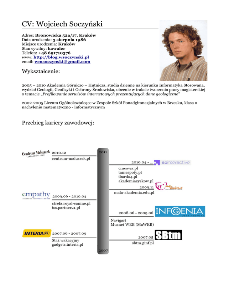 CV: Wojciech Soczyński Adres: Bronowicka 52a/17, Kraków Data urodzenia: 3 sierpnia 1986 Miejsce urodzenia: Kraków Stan cywilny: kawaler Telefon: +48 691710376 www: http://blog.wsoczynski.pl email: [email protected] Wykształcenie: 2005 – 2010 Akademia Górniczo – Hutnicza, studia dzienne na kierunku Informatyka Stosowana, wydział Geologii, Geofizyki i Ochrony Środowiska, obecnie w trakcie tworzenia pracy magisterskiej o temacie „Profilowanie serwisów internetowych prezentujących dane geologiczne” 2002-2005 Liceum Ogólnokształcące w Zespole Szkół Ponadgimnazjalnych w Brzesku, klasa o nachyleniu matematyczno - informatycznym Przebieg kariery zawodowej: Doświadczenia: SoInteractive: – – – – – – – – – tworzenie serwisów dla dużych klientów korporacyjnych (Comarch, Grupa Żywiec) pracujących w warunkach dużej odwiedzalności optymalizacja serwisów www pod kątem wysokiej dostępności integracja z oprogramowaniem Comarch ECOD praca z wykorzystaniem biblioteki Doctrine 2 (ORM – Data Mapper) projektowanie dedykowanych modułów do firmowego CMS-a w metodyce Domain Driven Design tworzenie testów jednostkowych w PHPUnit implementacja biblioteki mapowania obiektowo-relacyjnego wg. własnego pomysłu, opartej na wzorcu „Data Mapper” korzystanie z systemu kontroli wersji GIT korzystanie z systemu raportowania błędów i czasu pracy: RedMine Empathy Internet Software House: – – – – – – – – praca z bazą PostgreSQL współprojektowanie i implementacja dedykowanych platform internetowych wg. wytycznych klienta praca z wykorzystaniem biblioteki Doctrine 1 (m.in tree, hooks) poznanie jej zalet i ograniczeń współtworzenie firmowego frameworka opartego na Zend Framework praca w warunkach podwyższonego stresu i krótkich „deadline'ów” integracja z oprogramowaniem Comarch (m.in Altum) przy użyciu m.in protokołu SOAP praca w wieloosobowym zespole programistycznym praktyczne stosowanie wzorców projektowych Infogenia Sp.z.o.o (teraz Ontia): – – – – – – – – – – praca z bazą MySQL projektowanie i wykonanie aplikacji typu AJAX praca z Zend Framework praca z biblioteka Dojo Toolkit, rozszerzanie jej funkcjonalności integracja z firmowym oprogramowaniem opartym na Borland Delphi (Musnet) praca z dokumentami XML współpraca z klientem zagranicznym (Francja) korzystanie z systemu kontroli wersji CSV, SVN korzystanie z systemu raportowania błędów: TRAC tworzenie aplikacji wielojęzycznych Interia.pl: – – – – – – poznanie korporacyjnego procesu powstawania projektów programistycznych tworzenie „gadżetów” dla systemu Windows Vista praca z użyciem „czystego” Javascriptu: AJAX, proste animacje tworzenie dokumentacji projektowej pierwsze „poważne” zastosowanie PHP/HTML/CSS tworzenie własnych funkcji do szablonów Smarty Freelance, własne projekty i publikacje na blogu: – – – – – – – – – – eksploracja metodyki Domain Driven Design eksploracja metodyk object oriented design, model oriented design praktyczne implementacje wzorców projektowych implementacja własnego konterea IoC w PHP implementacja frameworka w architekturze MVP wg. własnego projektu praca z bazą MongoDB poznawanie innych języków programowania i platform: Python, Ruby, Scala, Clojure (Lisp) kontakt z klientem tworzenie niewielkich stron internetowych od wykupienia miejsca na serwerze po ostateczną implementacje i utrzymanie „cięcie” layoutów do HTML i CSS Studia: – – – – – – – tworzenie projektów zaliczeniowych w językach Java (RMI, Swing, Spring, JSF, JPA), C#, C/C++ (Borland C++ Builder) implementacja algorytmów m.in sztucznej inteligencji (sieci neuronowe) oraz metod numerycznych łączenie kodu natywnego z zarządzanym na platformie .net (marshaling) tworzenie schematów i obsługa baz danych PostgreSQL, MySQL, IBM Db2, Oracle tworzenie skryptów shellowych w systemach Unix/Linux tworzenie własnych sterowników dla systemu Linux typowe czynności administracyjne w systemach Linux Umiejętności: Platforma WWW – 4 lata doświadczenia: – – – HTML CSS Javascript: Jquery, Dojo Toolkit Platforma PHP – 4 lata doświadczenia: – Zend Framework: Zend_Soap, Zend_Json, Zend_Form, Zend_Controller, Zend_Translate, – – – – Zend_Amf, Zend_Acl, Zend_Cache, Zend_Captcha, Zend_Config, Zend_Validate, Zend_View, Zend_Registry, Zend_Session, Zend_Loader, Zend_Mail Doctrine 1 i 2 PHP (ciekawsze rozszerzenia): SPL, PDO, Reflection API Xcache, APC Smarty Kontrola wersji: – CSV – SVN – GIT Inne – głównie doświadczenia akademickie lub własne, bez zastosowań komercyjnych – – – – Java (RMI, JPA, Swing, Spring, JSF) Python (WSGI, XML) C# C/C++ Języki obce: Płynnie w mowie i na piśmie: niemiecki (Zertifikat Deutsch – poziom B1), angielski (TELC) Podstawy: francuski Zainteresowania: sport: piłka nożna (gra w B-klasowym zespole KS Bronowicki), deskorolka, snowboard, informatyka: architektura oprogramowania, wzorce projektowe, poznawanie nowych języków programowania i technologii humanistyczne: publicystyka (blog), fotografia, socjologia, psychologia, filozofia, podróże, kulinaria Wyrażam zgodę na przetwarzanie moich danych osobowych niezbędnych dla potrzeb procesu rekrutacji, zgodnie z ustawą z dnia 27 sierpnia 1997r. o Ochronie Danych Osobowych, Dz. U. z 2002 r. Nr 101, poz. 926 z późniejszymi zmianami