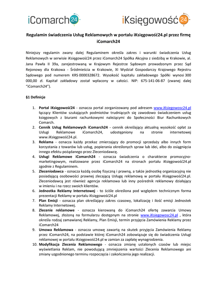 Regulamin świadczenia Usług Reklamowych w portalu iKsięgowość24.pl przez firmę iComarch24 Niniejszy regulamin zwany dalej Regulaminem określa zakres i warunki świadczenia Usług Reklamowych w serwisie iKsięgowość24 przez iComarch24 Spółka Akcyjna z siedzibą w Krakowie, al. Jana Pawła II 39a, zarejestrowaną w Krajowym Rejestrze Sądowym prowadzonym przez Sąd Rejonowy dla Krakowa - Śródmieścia w Krakowie, XI Wydział Gospodarczy Krajowego Rejestru Sądowego pod numerem KRS 0000328672. Wysokość kapitału zakładowego Spółki wynosi 300 000,00 zł. Kapitał zakładowy został wpłacony w całości. NIP: 675-141-06-87 (zwanej dalej “iComarch24”). §1 Definicje 1. Portal iKsięgowość24 - oznacza portal zorganizowany pod adresem www.iKsiegowosc24.pl łączący Klientów szukających podmiotów trudniących się zawodowo świadczeniem usług księgowych z biurami rachunkowymi należącymi do Społeczności Biur Rachunkowych Comarch. 2. Cennik Usług Reklamowych iComarch24 - cennik określający aktualną wysokość opłat za Usługi Reklamowe iComarch24, udostępniony na stronie internetowej www.iKsięgowość24.pl. 3. Reklama - oznacza każdy przekaz zmierzający do promocji sprzedaży albo innych form korzystania z towarów lub usług, popierania określonych spraw lub idei, albo do osiągnięcia innego efektu pożądanego przez Zleceniodawcę. 4. Usługi Reklamowe iComarch24 - oznacza świadczenia o charakterze promocyjnomarketingowym, realizowane przez iComarch24 na stronach portalu iKsięgowość24.pl zgodnie z Regulaminem. 5. Zleceniodawca - oznacza każdą osobę fizyczną i prawną, a także jednostkę organizacyjną nie posiadającą osobowości prawnej zlecającą Usługę reklamową w portalu iKsięgowość24.pl. Zleceniodawcą jest również agencja reklamowa lub inny pośrednik reklamowy działający w imieniu i na rzecz swoich klientów. 6. Jednostka Reklamy Internetowej - to ściśle określona pod względem technicznym forma prezentacji Reklamy w portalu iKsięgowość24.pl 7. Plan Emisji - oznacza plan określający zakres czasowy, lokalizację i ilość emisji Jednostek Reklamy Internetowej. 8. Zlecenie reklamowe - oznacza kierowaną do iComarch24 ofertę zawarcia Umowy Reklamowej, złożoną na formularzu dostępnym na stronie www.iKsiegowosc24.pl , która określa rodzaj zamawianej Reklamy, Plan Emisji, termin przyjęcia Zamówienia Reklamy przez iComarch24 9. Umowa Reklamowa - oznacza umowę zawartą na skutek przyjęcia Zamówienia Reklamy przez iComarch24, na podstawie której iComarch24 zobowiązuje się do świadczenia Usługi reklamowej w portalu iKsięgowość24.pl w zamian za zapłatę wynagrodzenia. 10. Modyfikacja Zlecenia Reklamowego - oznacza zmianę ustalonych czasów lub miejsc wyświetlania Reklam, nie powodującą zmniejszenia wartości Zlecenia Reklamowego ani zmiany uzgodnionego terminu rozpoczęcia i zakończenia jego realizacji. §2 Rodzaj i zakres usług świadczonych przez iComarch24 1. iComarch24 świadczy na rzecz Zleceniodawcy Usługi reklamowe polegające na umieszczeniu i wyświetlaniu zgodnie z Umową reklamową: a) bannera reklamowego - graficznego elementu reklamowego, opracowanego w formie elektronicznej, zatwierdzonego przez iComarch24 bądź też b) linku sponsorowanego - tekstowego linku składającego się z tytułu i krótkiego opisu wskazanego przez Zleceniodawcę do 150 znaków, zatwierdzonego przez iComarch24, w określonym miejscu, na Portalu iKsięgowość24.pl. 2. Czas trwania reklamy jest określony Umową Reklamową. 3. Wzór i treść banneru opracowuje Zleceniodawca. 4. Wzór i treść linku sponsorowanego opracowuje Zleceniodawca. 5. Dane techniczne banneru znajdują się na witrynie portalu iKsięgowość24 oraz poniżej w Regulaminie. 6. Dane techniczne linku sponsorowanego znajdują się na witrynie portalu iKsięgowość24 oraz poniżej w Regulaminie. 7. Kliknięcie w banner powoduje automatyczne przejście do reklamowanego serwisu. 8. Kliknięcie w link sponsorowany powoduje automatyczne przejście do reklamowanego serwisu. §3 Warunki świadczenia Usług reklamowych przez iComarch24 1. 2. 3. 4. 5. iComarch24 samodzielnie decyduje o zawartości portalu iKsięgowość24.pl i ogólnym stylu prezentacji Reklam oraz o polityce reklam. iComarch24 zastrzega sobie prawo do odmowy zawarcia Umowa reklamowej oraz wyświetlania Reklam, w szczególności Reklam niezgodnych z jej stylem lub polityką portalu lub też wobec których istnieć będzie podejrzenie o niezgodność zawartych treści ze stanem faktycznym i obowiązującym w RP prawem. Zakazane jest dostarczanie przez Zleceniodawcę treści o charakterze bezprawnym. W razie otrzymania przez iComarch24 urzędowego zawiadomienia lub wiarygodnej wiadomości o bezprawnym charakterze danych dostarczonych przez Zleceniodawcę, iComarch24 uprawniona jest do wstrzymania wyświetlania Reklamy. iComarch24 nie będzie ponosić odpowiedzialności względem Zleceniodawcy ani jakiejkolwiek osoby trzeciej za szkodę powstałą w wyniku wstrzymania wyświetlania Reklamy o treści bezprawnej lub też powstałą w wyniku wstrzymania wyświetlania Reklamy o treści, w stosunku, do której zostało skierowane do iComarch24 urzędowe zawiadomienie o bezprawnym charakterze danych dostarczonych przez Zleceniodawcę. W przypadku uzyskania wiadomości bądź urzędowego zawiadomienia o bezprawnym charakterze Reklamy iComarch24 zawiadomi Zleceniodawcę o zamiarze wstrzymania wyświetlania Reklamy. 6. Zleceniodawca odpowiada za zgodność materiałów reklamowych z obowiązującym w RP prawem, a w szczególności z przepisami dotyczącymi reklamy w mediach audiowizualnych. 7. iComarch24 nie odpowiada za treść emitowanych Reklam. 8. Zleceniodawca jest zobowiązany do dostarczenia do iComarch24 w drodze elektronicznej wszystkich informacji koniecznych do wykonania Usługi reklamowej w formie zgodnej z wymogami zamawianej Jednostki Reklamy Internetowej. Wspomniane informacje po