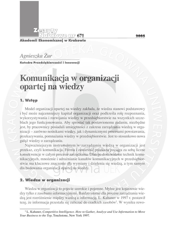 Zeszyty Naukowe nr 671 2005 Akademii Ekonomicznej w Krakowie Agnieszka ˚ur Katedra Przedsi´biorczoÊci i Innowacji Komunikacja w organizacji opartej na wiedzy 1. Wst´p Model organizacji opartej na wiedzy zakłada, że wiedza stanowi podstawowy i być może najcenniejszy kapitał organizacji oraz podkreśla rolę rozpoznania, wykorzystywania i rozwijania wiedzy w przedsiębiorstwie na wszystkich szczeblach jego funkcjonowania. Aby sprostać tak postawionemu zadaniu, niezbędne jest, by pracownicy posiadali umiejętności z zakresu zarządzania wiedzą w organizacji – zarówno nośnikami wiedzy, jak i dynamicznymi procesami powstawania, przekazywania, pomnażania wiedzy w przedsiębiorstwie. Jest to stosunkowo nowa gałąź wiedzy o zarządzaniu. Najważniejszym instrumentem w zarządzaniu wiedzą w organizacji jest przekaz, czyli komunikacja. Forma i zawartość przekazu pociąga za sobą liczne konsekwencje w całym procesie zarządzania. Dlatego doskonalenie technik komunikacyjnych, mnożenie i udrażnianie kanałów komunikacyjnych w przedsiębiorstwie ma kluczowe znaczenie dla wymiany i dzielenia się wiedzą, a tym samym dla budowania organizacji opartej na wiedzy. 2. Wiedza w organizacji Wiedza w organizacji to pojecie szerokie i pojemne. Mylne jest kojarzenie wiedzy tylko z zasobami informacyjnymi. Bardzo istotne dla procesu zarządzania wiedzą jest rozróżnienie między wiedzą a informacją. L. Kahaner w 1997 r. postawił tezę, że informacja przestała się zaliczać do rzadkich zasobów1. W wyniku rewo1 L. Kahaner, Competitive Intelligence. How to Gather, Analyze and Use Information to Move Your Business to the Top, Touchstone, New York 1997. 148 Agnieszka Żur lucji informatycznej i postępu technologicznego stała się powszechnie dostępna, co więcej – niemal każdy ma do niej taki sam dostęp. L. Kahaner twierdzi, że informacja nie wystarcza, aby podejmować dobre decyzje. Potrzebna jest wiedza, gdyż obok samej dostępności zasobów informacyjnych sukces organizacji zależy od umiejętności ich selekcji i aplikacji, czyli przekształcania informacji w wiedzę. To jakościowe rozróżnienie podkreśla również R. Byrne pisząc, że „organizacje, które rozumieją różnicę pomiędzy informacją a wiedzą, przesuwają się w rozwoju od takich, które gromadzą i wykorzystują informacje, do takich, które nabywają, przetwarzają i dzielą się wiedzą”2. Zatem wiedza opiera się na informacji, ale nie jest tym samym co informacja. Jest przetworzoną informacją wzbogaconą o dotychczasową wiedzę, doświadczenia i wartości. „Informacja jest zatem strumieniem wiadomości, podczas gdy wiedza jest jego wytworem zakorzenionym w przekonaniach i oczekiwaniach odbiorcy. Wiedza jest w takim znaczeniu związana z ludzkim działaniem”3. Autorzy tego tekstu – I. Nonaka i H. Takeuchi posuwają się dalej i twierdzą, że wiedza jest pojęciem daleko bardziej różnym od informacji, gdyż tworzona jest społecznie w toku międzyludzkich interakcji. Niech to podejście posłuży jako podstawa do rozważań o zarządzaniu wiedzą w organizacji. Członkowie organizacji z informacji, poglądów, przekonań i umiejętności budują wiedzę zbiorową. Powstaje ona w toku ich wzajemnych interakcji i wymiany myśli. Nośnikami wiedzy w przedsiębiorstwie są nie tylko człowiek i jego umysł, ale też wszystkie procesy transformacji wiedzy w organizacji i powstające w ich wyniku nośniki wiedzy: określone technologie, dokumenty, procedury, prawa, patenty i inne rozwiązania, jakimi posługuje się przedsiębiorstwo – to wszystko, co buduje zasoby wiedzy zbiorowej. Zatem zasoby wiedzy organizacji dalece przewyższają sumę wiedzy wszystkich pracowników. Wiedza w organizacji występuje pod wieloma postaciami. W literaturze przedmiotu powszechnie przyjęty jest podział zasobów wiedzy organizacji na wiedzę jawną i ukrytą4. Wiedza jawna, lub inaczej dostępna, to wiedza wyrażona w słowach i liczbach, łatwa do przekazania i rozpowszechniania. Jest to również wiedza stosunkowo łatwo przyswajalna przez odbiorcę, jest bowiem skodyfikowana i przetworzona. To nie tylko informacje w postaci danych, formuł czy zasad. Wiedza jawna obejmuje też szerokie pole reguł postępowania, zachowania, procedur i hierarchii w organizacji, pod warunkiem, że wiedza ta jest wyrażona w słowach i liczbach. Natomiast wiedza ukryta nie jest łatwo dostrzegalna ani wyrażalna, stosunkowo trudno ją więc przekazywać i rozpowszechniać. Nie jest sformalizowana 2 R. Byrne, Employees: Capital or Commodity?, MCB University Press, „The Learning Organization” 2001, vol. 8. 3 I. Nonaka, H. Takeuchi, Kreowanie wiedzy w organizacji, Poltext, Warszawa 2000. 4 W literaturze angielskojezycznej stosuje się najczęściej terminy tangible (uchwytna) i intangible (nieuchwytna). Komunikacja w organizacji opartej na wiedzy 149 i możliwe, że nigdy nie zostanie jednoznacznie wyartykułowana i zebrana. Istnieją jednak dowody, że istnieje i jest stosowana. Świadczy o tym z jednej strony cały zespół indywidualnych umiejętności, które na podstawie długich lat doświadczeń i indywidualnego talentu pozwalają osiągnąć mistrzostwo w danej dziedzinie, a z drugiej – zespół subiektywnych ocen, wartości i opinii, które wyznaczają sposób postrzegania rzeczywistości. Wiedza jawna jest ogólnodostępna w grupie lub społeczeństwie, a wiedza ukryta – wysoce indywidualna i dostępna tylko danej jednostce. Aby została rozpowszechniona i wykorzystana szerzej w organizacji, musi być przekształcona w zrozumiałe dla każdego znaki. Wiedza, która podlega mniejszej lub większej artykulacji, poprzez procesy transformacji wiedzy zostaje wbudowana w funkcjonowanie organizacji i wzbogaca wiedzę organizacyjną. 3. Zarzàdzanie wiedzà w organizacji Najważniejszym założeniem zarządzania wiedzą w organizacji jest teza, że wiedza jest zasobem, który można i trzeba gromadzić, prz