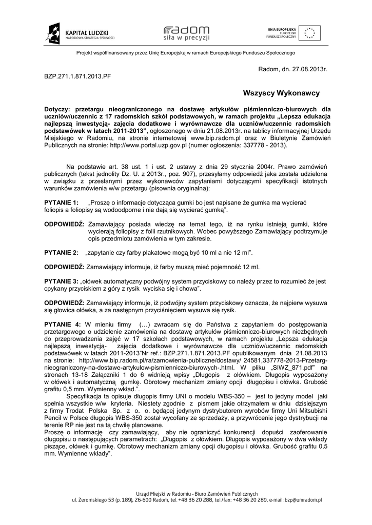 Projekt współfinansowany przez Unię Europejską w ramach Europejskiego Funduszu Społecznego Radom, dn. 27.08.2013r. BZP.271.1.871.2013.PF Wszyscy Wykonawcy Dotyczy: przetargu nieograniczonego na dostawę artykułów piśmienniczo-biurowych dla uczniów/uczennic z 17 radomskich szkół podstawowych, w ramach projektu „Lepsza edukacja najlepszą inwestycją- zajęcia dodatkowe i wyrównawcze dla uczniów/uczennic radomskich podstawówek w latach 2011-2013”, ogłoszonego w dniu 21.08.2013r. na tablicy informacyjnej Urzędu Miejskiego w Radomiu, na stronie internetowej www.bip.radom.pl oraz w Biuletynie Zamówień Publicznych na stronie: http://www.portal.uzp.gov.pl (numer ogłoszenia: 337778 - 2013). Na podstawie art. 38 ust. 1 i ust. 2 ustawy z dnia 29 stycznia 2004r. Prawo zamówień publicznych (tekst jednolity Dz. U. z 2013r., poz. 907), przesyłamy odpowiedź jaka została udzielona w związku z przesłanymi przez wykonawców zapytaniami dotyczącymi specyfikacji istotnych warunków zamówienia w/w przetargu (pisownia oryginalna): PYTANIE 1: „Proszę o informacje dotycząca gumki bo jest napisane że gumka ma wycierać foliopis a foliopisy są wodoodporne i nie dają się wycierać gumką”. ODPOWIEDŹ: Zamawiający posiada wiedzę na temat tego, iż na rynku istnieją gumki, które wycierają foliopisy z folii rzutnikowych. Wobec powyższego Zamawiający podtrzymuje opis przedmiotu zamówienia w tym zakresie. PYTANIE 2: „zapytanie czy farby plakatowe mogą być 10 ml a nie 12 ml”. ODPOWIEDŹ: Zamawiający informuje, iż farby muszą mieć pojemność 12 ml. PYTANIE 3: „ołówek automatyczny podwójny system przyciskowy co należy przez to rozumieć że jest cpykany przyciskiem z góry z rysik wyciska się i chowa”. ODPOWIEDŹ: Zamawiający informuje, iż podwójny system przyciskowy oznacza, że najpierw wysuwa się głowica ołówka, a za następnym przyciśnięciem wysuwa się rysik. PYTANIE 4: W mieniu firmy (…) zwracam się do Państwa z zapytaniem do postępowania przetargowego o udzielenie zamówienia na dostawę artykułów piśmienniczo-biurowych niezbędnych do przeprowadzenia zajęć w 17 szkołach podstawowych, w ramach projektu „Lepsza edukacja najlepszą inwestycjązajęcia dodatkowe i wyrównawcze dla uczniów/uczennic radomskich podstawówek w latach 2011-2013”Nr ref.: BZP.271.1.871.2013.PF opublikowanym dnia 21.08.2013 na stronie: http://www.bip.radom.pl/ra/zamowienia-publiczne/dostawy/ 24581,337778-2013-Przetargnieograniczony-na-dostawe-artykulow-pismienniczo-biurowych-.html. W pliku „SIWZ_871.pdf” na stronach 13-18 Załączniki 1 do 6 widnieją wpisy „Długopis z ołówkiem. Długopis wyposażony w ołówek i automatyczną gumkę. Obrotowy mechanizm zmiany opcji długopisu i ołówka. Grubość grafitu 0,5 mm. Wymienny wkład.”. Specyfikacja ta opisuje długopis firmy UNI o modelu WBS-350 – jest to jedyny model jaki spełnia wszystkie w/w kryteria. Niestety zgodnie z pismem jakie otrzymałem w dniu dzisiejszym z firmy Trodat Polska Sp. z o. o. będącej jedynym dystrybutorem wyrobów firmy Uni Mitsubishi Pencil w Polsce długopis WBS-350 został wycofany ze sprzedaży, a przywrócenie jego dystrybucji na terenie RP nie jest na tą chwilę planowane. Proszę o informację czy zamawiający, aby nie ograniczyć konkurencji dopuści zaoferowanie długopisu o następujących parametrach: „Długopis z ołówkiem. Długopis wyposażony w dwa wkłady piszące, ołówek i gumkę. Obrotowy mechanizm zmiany opcji długopisu i ołówka. Grubość grafitu 0,5 mm. Wymienne wkłady”. Projekt współfinansowany przez Unię Europejską w ramach Europejskiego Funduszu Społecznego ODPOWIEDŹ: Zamawiający posiada wiedzę, iż na rynku dostępne są długopisy spełniające kryteria zawarte w opisie przedmiotu zamówienia dla tego artykułu. Wobec powyższego Zamawiający podtrzymuje opis przedmiotu zamówienia w tym zakresie. Z up. PREZYDENTA MIASTA Artur Ślarzyński Kierownik Biura Zamówień Publicznych
