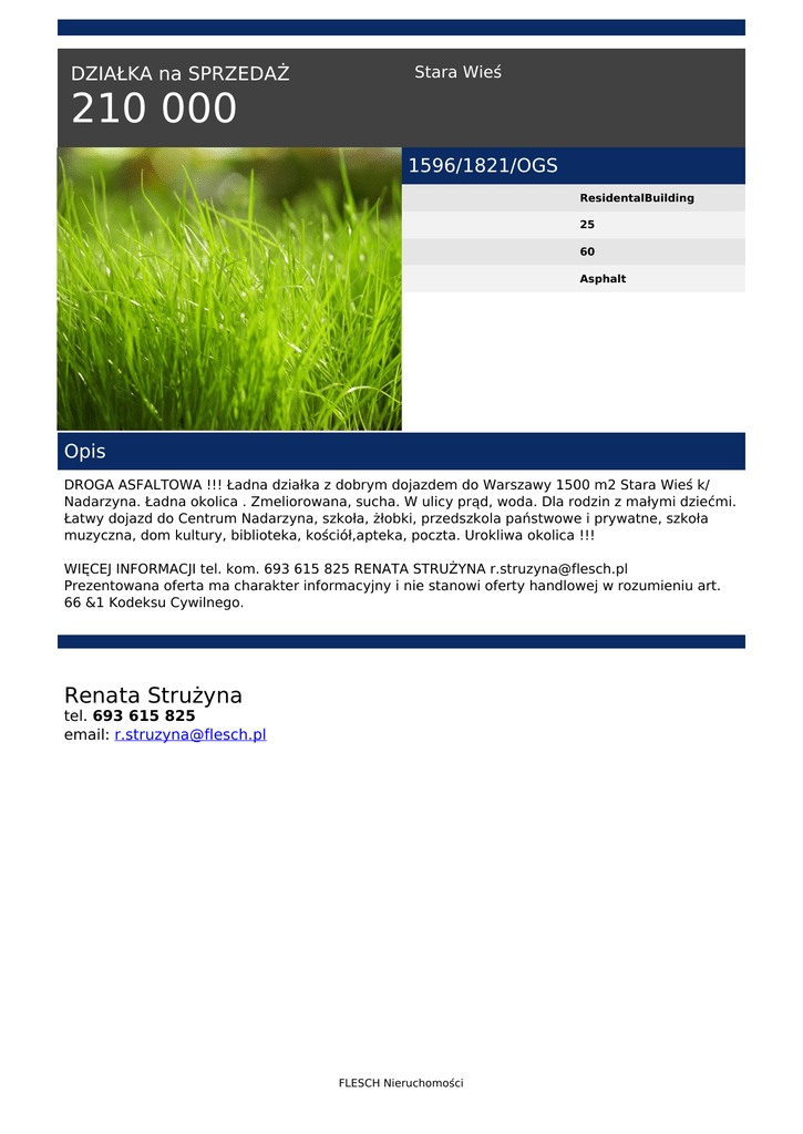 DZIAŁKA na SPRZEDAŻ Stara Wieś 210 000 1596/1821/OGS ResidentalBuilding 25 60 Asphalt Opis DROGA ASFALTOWA !!! Ładna działka z dobrym dojazdem do Warszawy 1500 m2 Stara Wieś k/ Nadarzyna. Ładna okolica . Zmeliorowana, sucha. W ulicy prąd, woda. Dla rodzin z małymi dziećmi. Łatwy dojazd do Centrum Nadarzyna, szkoła, żłobki, przedszkola państwowe i prywatne, szkoła muzyczna, dom kultury, biblioteka, kościół,apteka, poczta. Urokliwa okolica !!! WIĘCEJ INFORMACJI tel. kom. 693 615 825 RENATA STRUŻYNA [email protected] Prezentowana oferta ma charakter informacyjny i nie stanowi oferty handlowej w rozumieniu art. 66 &1 Kodeksu Cywilnego. Renata Strużyna tel. 693 615 825 email: [email protected] FLESCH Nieruchomości Powered by TCPDF (www.tcpdf.org)
