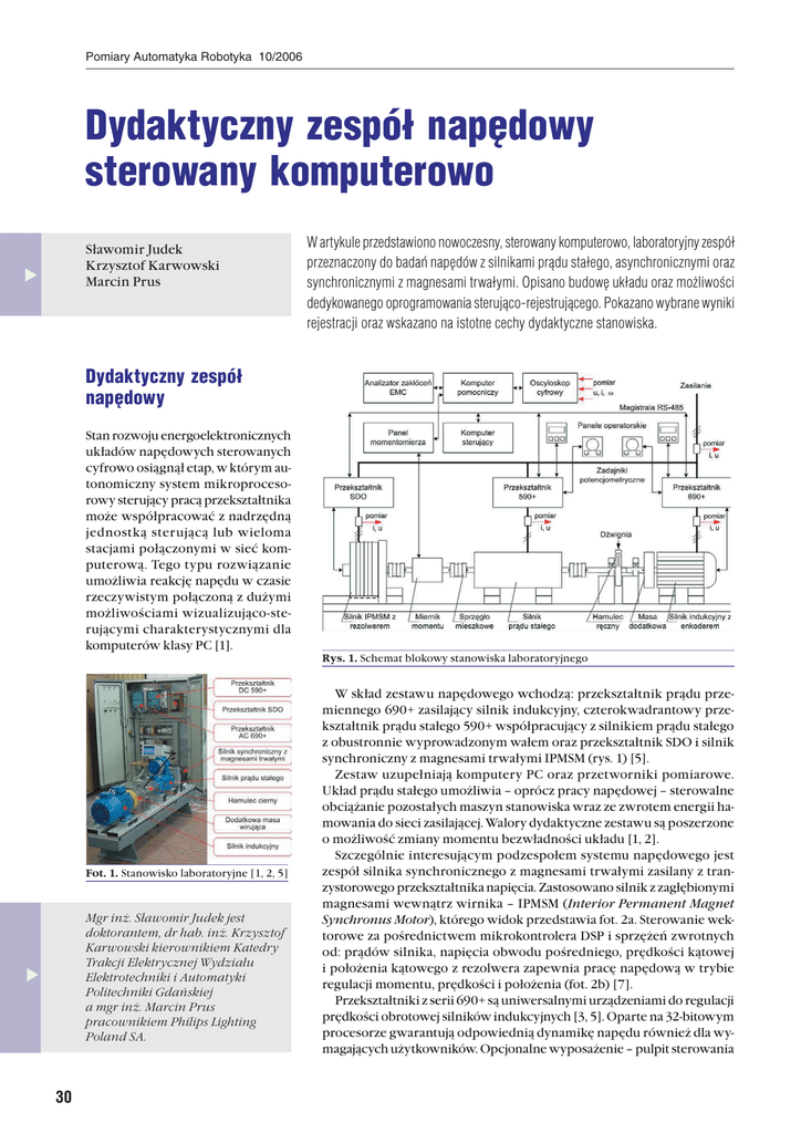 Pomiary Automatyka Robotyka 10/2006 Dydaktyczny zespół napędowy sterowany komputerowo Sławomir Judek Krzysztof Karwowski Marcin Prus W artykule przedstawiono nowoczesny, sterowany komputerowo, laboratoryjny zespół przeznaczony do badań napędów z silnikami prądu stałego, asynchronicznymi oraz synchronicznymi z magnesami trwałymi. Opisano budowę układu oraz możliwości dedykowanego oprogramowania sterująco-rejestrującego. Pokazano wybrane wyniki rejestracji oraz wskazano na istotne cechy dydaktyczne stanowiska. Dydaktyczny zespół napędowy Stan rozwoju energoelektronicznych układów napędowych sterowanych cyfrowo osiągnął etap, w którym autonomiczny system mikroprocesorowy sterujący pracą przekształtnika może współpracować z nadrzędną jednostką sterującą lub wieloma stacjami połączonymi w sieć komputerową. Tego typu rozwiązanie umożliwia reakcję napędu w czasie rzeczywistym połączoną z dużymi możliwościami wizualizująco-sterującymi charakterystycznymi dla komputerów klasy PC [1]. Rys. 1. Schemat blokowy stanowiska laboratoryjnego Fot. 1. Stanowisko laboratoryjne [1, 2, 5] Mgr inż. Sławomir Judek jest doktorantem, dr hab. inż. Krzysztof Karwowski kierownikiem Katedry Trakcji Elektrycznej Wydziału Elektrotechniki i Automatyki Politechniki Gdańskiej a mgr inż. Marcin Prus pracownikiem Philips Lighting Poland SA. 30 W skład zestawu napędowego wchodzą: przekształtnik prądu przemiennego 690+ zasilający silnik indukcyjny, czterokwadrantowy przekształtnik prądu stałego 590+ współpracujący z silnikiem prądu stałego z obustronnie wyprowadzonym wałem oraz przekształtnik SDO i silnik synchroniczny z magnesami trwałymi IPMSM (rys. 1) [5]. Zestaw uzupełniają komputery PC oraz przetworniki pomiarowe. Układ prądu stałego umożliwia – oprócz pracy napędowej – sterowalne obciążanie pozostałych maszyn stanowiska wraz ze zwrotem energii hamowania do sieci zasilającej. Walory dydaktyczne zestawu są poszerzone o możliwość zmiany momentu bezwładności układu [1, 2]. Szczególnie interesującym podzespołem systemu napędowego jest zespół silnika synchronicznego z magnesami trwałymi zasilany z tranzystorowego przekształtnika napięcia. Zastosowano silnik z zagłębionymi magnesami wewnątrz wirnika – IPMSM (Interior Permanent Magnet Synchronus Motor), którego widok przedstawia fot. 2a. Sterowanie wektorowe za pośrednictwem mikrokontrolera DSP i sprzężeń zwrotnych od: prądów silnika, napięcia obwodu pośredniego, prędkości kątowej i położenia kątowego z rezolwera zapewnia pracę napędową w trybie regulacji momentu, prędkości i położenia (fot. 2b) [7]. Przekształtniki z serii 690+ są uniwersalnymi urządzeniami do regulacji prędkości obrotowej silników indukcyjnych [3, 5]. Oparte na 32-bitowym procesorze gwarantują odpowiednią dynamikę napędu również dla wymagających użytkowników. Opcjonalne wyposażenie – pulpit sterowania Pomiary Automatyka Robotyka 10/2006 a) b) Fot. 2. Układ napędowy z silnikiem synchronicznym z magnesami trwałymi: a) widok wnętrza silnika IPMSM; b) przekształtnik napięcia i specjalizowane moduły komunikacyjne – stwarza dużą elastyczność w ustalaniu strategii sterowania. Możliwa jest konfiguracja przekształtnika do pracy w trzech trybach: sterowanie w otwartej pętli – tryb według charakterystyki u/f, tzw. sterowanie skalarne sterowanie wektorowe bezczujnikowe (Sensorless Vector) – zapewnia precyzyjną kontrolę prędkości dzięki algorytmowi sterowania MRAS (Model Reference Adaptive System) sterowanie wektorem strumienia w zamkniętej pętli sprzężenia (Closed Loop Vector) – tryb wraz z enkoderem zapewnia pracę z zerową prędkością obrotową przy momencie znamionowym oraz stabilizację prędkości przy zmianach obciążenia. Obcowzbudny silnik prądu stałego jest zasilany poprzez przekształtnik 590+, którego główny obwód mocy jest zbudowany na bazie dwóch sterowalnych mostków tyrystorowych. Algorytmy sterowania układu umożliwiają rozruch, hamowanie oraz regulację prędkości i momentu obrotowego dla obu kierunków wirowania wału [2, 5]. Sterowanie pracą przekształtników 590+ oraz 690+ jest możliwe przez: zadajniki potencjometryczne, panele operatorskie oraz przy użyciu komputera. Do wymiany danych pomiędzy komputerem a przekształtnikami można użyć magistrali transmisji szeregowej RS-485 [1, 2]. Oprogramowanie sterujące i rejestrujące parametryzacji nastaw poszczególnych przekształtników oraz pozwalającego na pomiar i wizualizację wybranych parametrów elektryczno-mechanicznych [1]. Aby ułatwić zagadnienia związane z oprogramowaniem portów komunikacyjnych, okien dialogowych, wykresów itp., na rzecz zwiększenia możliwości użytkowych programu wybrano środowisko programistyczne LabVIEW [6]. Oprogramowanie przeznaczone do współpracy z zespołem napędowym składa się z trzech głównych, autonomicznych aplikacji: interfejsu sterującego pracą przekształtnika 590+, przekształtnika 690+ oraz aplikacji współpracującej z momentomierzem Magtrol 6400. Jednym z pięciu podprogramów dostępnych z menu głównego aplikacji sterującej przekształtnikiem 690+ jest program Bezpośredniego sterowania prędkością silnika. Głównym celem tego podprogramu było pokazanie możliwości zdalnego odczytu i rejestracji parametrów charakteryzujących układ napędowy. Wykorzystując go, można sterować silnikiem na zasadach podobnych do pracy napędu z użyciem zadajnika potencjometrycznego (tj. start, stop, regulacja prędkości). Na panelu programu (rys. 2) można wyróżnić trzy grupy elementów. Pierwsza z nich to przyciski sterujące i okna zmiany nastaw parametrów. Drugą grupę elementów stanowią wskaźniki monitorowanych parametrów opisujących pracę silnika. Wielkości te są wizualizowane w czasie za pomocą rejestratorów graficznych. Ostatnią grupę stanowią kontrolki: ZAPIS – 