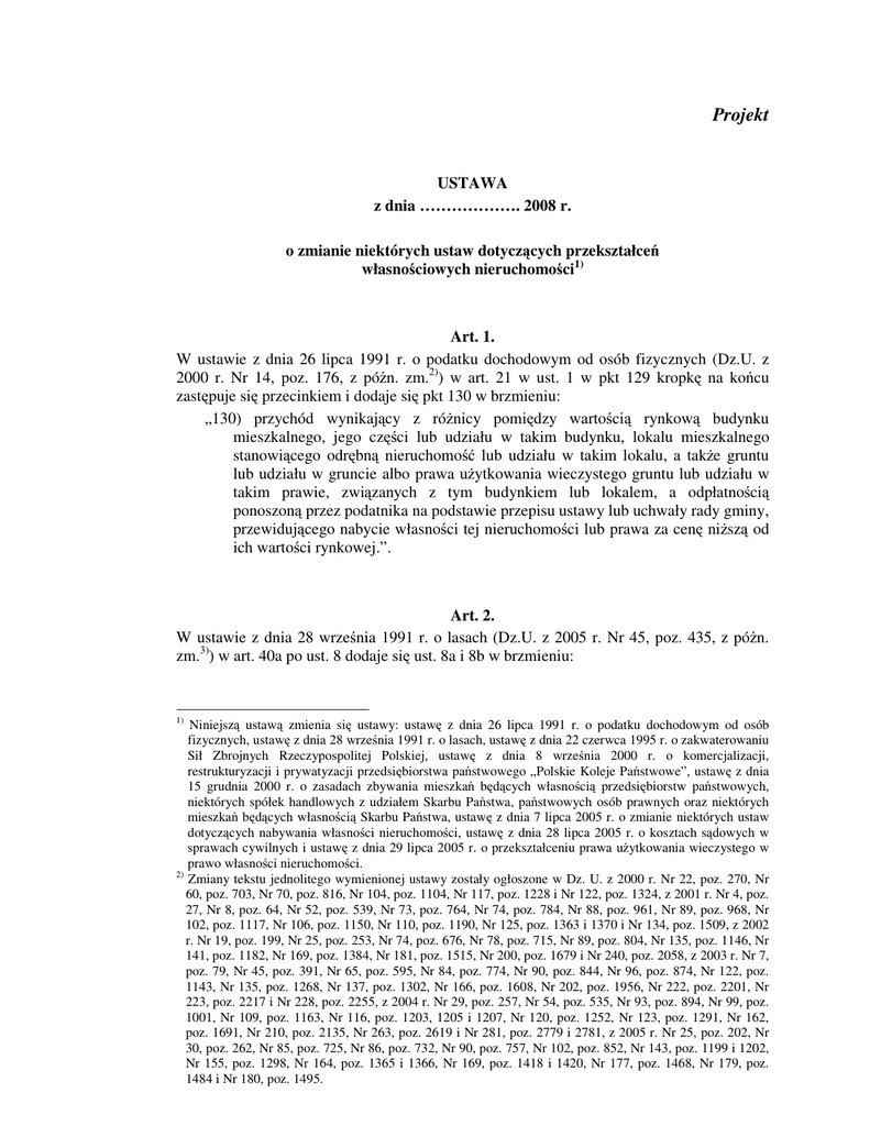 Projekt USTAWA z dnia ………………. 2008 r. o zmianie niektórych ustaw dotyczących przekształceń własnościowych nieruchomości1) Art. 1. W ustawie z dnia 26 lipca 1991 r. o podatku dochodowym od osób fizycznych (Dz.U. z 2000 r. Nr 14, poz. 176, z późn. zm.2)) w art. 21 w ust. 1 w pkt 129 kropkę na końcu zastępuje się przecinkiem i dodaje się pkt 130 w brzmieniu: „130) przychód wynikający z różnicy pomiędzy wartością rynkową budynku mieszkalnego, jego części lub udziału w takim budynku, lokalu mieszkalnego stanowiącego odrębną nieruchomość lub udziału w takim lokalu, a także gruntu lub udziału w gruncie albo prawa użytkowania wieczystego gruntu lub udziału w takim prawie, związanych z tym budynkiem lub lokalem, a odpłatnością ponoszoną przez podatnika na podstawie przepisu ustawy lub uchwały rady gminy, przewidującego nabycie własności tej nieruchomości lub prawa za cenę niższą od ich wartości rynkowej.”. Art. 2. W ustawie z dnia 28 września 1991 r. o lasach (Dz.U. z 2005 r. Nr 45, poz. 435, z późn. zm.3)) w art. 40a po ust. 8 dodaje się ust. 8a i 8b w brzmieniu: 1) Niniejszą ustawą zmienia się ustawy: ustawę z dnia 26 lipca 1991 r. o podatku dochodowym od osób fizycznych, ustawę z dnia 28 września 1991 r. o lasach, ustawę z dnia 22 czerwca 1995 r. o zakwaterowaniu Sił Zbrojnych Rzeczypospolitej Polskiej, ustawę z dnia 8 września 2000 r. o komercjalizacji, restrukturyzacji i prywatyzacji przedsiębiorstwa państwowego „Polskie Koleje Państwowe”, ustawę z dnia 15 grudnia 2000 r. o zasadach zbywania mieszkań będących własnością przedsiębiorstw państwowych, niektórych spółek handlowych z udziałem Skarbu Państwa, państwowych osób prawnych oraz niektórych mieszkań będących własnością Skarbu Państwa, ustawę z dnia 7 lipca 2005 r. o zmianie niektórych ustaw dotyczących nabywania własności nieruchomości, ustawę z dnia 28 lipca 2005 r. o kosztach sądowych w sprawach cywilnych i ustawę z dnia 29 lipca 2005 r. o przekształceniu prawa użytkowania wieczystego w prawo własności nieruchomości. 2) Zmiany tekstu jednolitego wymienionej ustawy zostały ogłoszone w Dz. U. z 2000 r. Nr 22, poz. 270, Nr 60, poz. 703, Nr 70, poz. 816, Nr 104, poz. 1104, Nr 117, poz. 1228 i Nr 122, poz. 1324, z 2001 r. Nr 4, poz. 27, Nr 8, poz. 64, Nr 52, poz. 539, Nr 73, poz. 764, Nr 74, poz. 784, Nr 88, poz. 961, Nr 89, poz. 968, Nr 102, poz. 1117, Nr 106, poz. 1150, Nr 110, poz. 1190, Nr 125, poz. 1363 i 1370 i Nr 134, poz. 1509, z 2002 r. Nr 19, poz. 199, Nr 25, poz. 253, Nr 74, poz. 676, Nr 78, poz. 715, Nr 89, poz. 804, Nr 135, poz. 1146, Nr 141, poz. 1182, Nr 169, poz. 1384, Nr 181, poz. 1515, Nr 200, poz. 1679 i Nr 240, poz. 2058, z 2003 r. Nr 7, poz. 79, Nr 45, poz. 391, Nr 65, poz. 595, Nr 84, poz. 774, Nr 90, poz. 844, Nr 96, poz. 874, Nr 122, poz. 1143, Nr 135, poz. 1268, Nr 137, poz. 1302, Nr 166, poz. 1608, Nr 202, poz. 1956, Nr 222, poz. 2201, Nr 223, poz. 2217 i Nr 228, poz. 2255, z 2004 r. Nr 29, poz. 257, Nr 54, poz. 535, Nr 93, poz. 894, Nr 99, poz. 1001, Nr 109, poz. 1163, Nr 116, poz. 1203, 1205 i 1207, Nr 120, poz. 1252, Nr 123, poz. 1291, Nr 162, poz. 1691, Nr 210, poz. 2135, Nr 263, poz. 2619 i Nr 281, poz. 2779 i 2781, z 2005 r. Nr 25, poz. 202, Nr 30, poz. 262, Nr 85, poz. 725, Nr 86, poz. 732, Nr 90, poz. 757, Nr 102, poz. 852, Nr 143, poz. 1199 i 1202, Nr 155, poz. 1298, Nr 164, poz. 1365 i 1366, Nr 169, poz. 1418 i 1420, Nr 177, poz. 1468, Nr 179, poz. 1484 i Nr 180, poz. 1495. „8a. Jeżeli w określonej nieruchomości co najmniej jeden lokal, w rozumieniu ust. 1, został przez Lasy Państwowe sprzedany osobie upoważnionej w ust. 4, 5, 5a, 6 lub 7, to na wniosek osoby uprawnionej zajmującej lokal w tej nieruchomości, Lasy Państwowe są obowiązane sprzedać jej ten lokal na warunkach określonych w ust. 4 lub 7, o ile lokal ten nie jest lokalem niezbędnym. 8b. Dyrektor Generalny może podjąć decyzję o sprzedaży lokalu nieprzydatnego Lasom Państwowym nieujętego w wykazie, o którym mowa w ust. 8.”. Art. 3. W ustawie z dnia 22 czerwca 1995 r. o zakwaterowaniu Sił Zbrojnych Rzeczypospolitej Polskiej (Dz.U. z 2005 r. Nr 41, poz. 398, z późn. zm.4)) wprowadza się następujące zmiany: 1) w art. 57: a) ust. 2 otrzymuje brzmienie: „2. Dyrektor oddziału regionalnego Agencji ustala roczny plan sprzedaży lokali mieszkalnych na podstawie wykazu, o którym mowa w art. 23 ust. 4, z zastrzeżeniem ust. 3.”, b) dodaje się ust. 3 i 4 w brzmieniu: „3. Jeżeli w określonym budynku co najmniej jedno mieszkanie zostało przez Agencję sprzedane osobie uprawnionej, to na wniosek osoby uprawnionej zajmującej mieszkanie w tej nieruchomości Agencja jest obowiązana sprzedać jej to mieszkanie, w przypadku gdy to mieszkanie znajduje się w wykazie kwater, które stały się zbędne na zakwaterowanie żołnierzy służby stałej, zgodnie z art. 23 ust. 4. 4. Naruszenie prawa lub interesu prawnego osoby uprawnionej, o której mowa w ust. 3, sąd stwierdza, na wniosek tej osoby, prawomocnym orzeczeniem wydanym w postępowaniu nieprocesowym.”; 2) w art. 58: a) w ust. 2: - po pkt 1 dodaje się pkt 1a w brzmieniu: „1a) 95% - jeżeli osobą uprawnioną, w rozumieniu art. 56, jest emeryt, rencista lub wdowa po nim (wdowiec po niej),”, - pkt 2 otrzymuje brzmienie: „2) 90% - osobom nie wymienionym w pkt 1 i 1a”, b) ust. 3 otrzymuje brzmienie: „3. Pomniejszenia, o których mowa w ust. 2, stosuje się do sprzedaży prawa własności lub użytkowania wieczystego, w przypadku posiadania przez Agencję takiego prawa, ułamkowej części nieruchomości wspólnej przypadającej na sprzedawany lokal w rozumieniu art. 3 ustawy z dnia 24 czerwca 1994 r. o własności lokali.”. Art. 4. W ustawie z dnia 8 września 2000 r. o komercjalizacji, restrukturyzacji i prywatyzacji przedsiębiorstwa państwowego „Polskie Koleje Państwowe” (Dz.U. Nr 84, poz. 948, z późn. zm.5)) wprowadza 