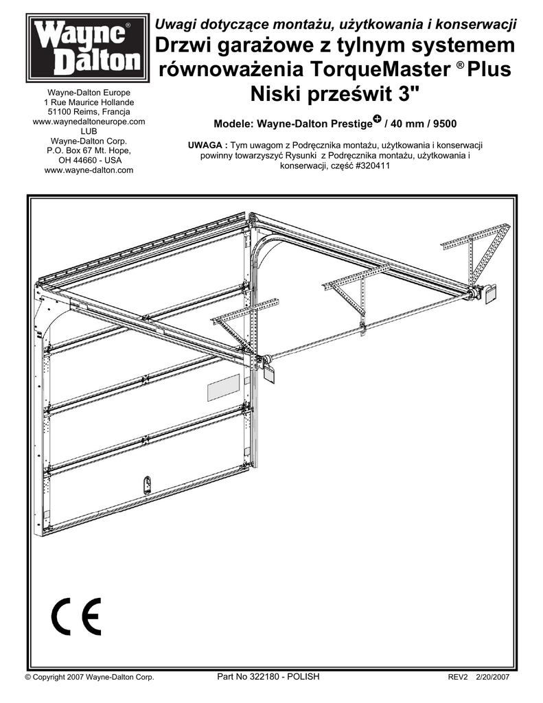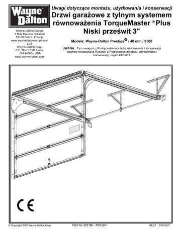 Uwagi dotyczące montażu, użytkowania i konserwacji Wayne-Dalton Europe 1 Rue Maurice Hollande 51100 Reims, Francja www.waynedaltoneurope.com LUB Wayne-Dalton Corp. P.O. Box 67 Mt. Hope, OH 44660 - USA www.wayne-dalton.com © Copyright 2007 Wayne-Dalton Corp. Drzwi garażowe z tylnym systemem równoważenia TorqueMaster ® Plus Niski prześwit 3" Modele: Wayne-Dalton Prestige / 40 mm / 9500 UWAGA : Tym uwagom z Podręcznika montażu, użytkowania i konserwacji powinny towarzyszyć Rysunki z Podręcznika montażu, użytkowania i konserwacji, część #320411 Part No 322180 - POLISH REV2 2/20/2007 SPIS TREŚCI Uwagi dotyczące montażu, użytkowania i konserwacji Definicje symboli .............................................................................................................................................3. Ważne wskazówki dotyczące bezpieczeństwa montażu ................................................................................3. Zawartość opakowania ....................................................................................................................................4. Potrzebne narzędzia .......................................................................................................................................4. Dostępne akcesoria ........................................................................................................................................4. „MONTAŻ” Uszczelka pionowa ............................................................................................................................5. Łącznik rowadnika ..............................................................................................................................5. Pręty w kształcie U .............................................................................................................................5. Rolki / Osłony rolkowe ................................................................................................................ 5. - 6. Kątownik ścienny / Poziomowanie segmentu dolnego ......................................................................6. Uszczelka nadproża ...........................................................................................................................6. Ponowny montaż szyny pionowej ......................................................................................................6. Ustawianie segmentów ............................................................................................................... 6. - 7. Szyna pozioma ..................................................................................................................................7. Wspornik górny LHR / Segment górny ..............................................................................................7. Zespół wieszaka tylnego / mocowanie prowadnic poziomych .................................................... 7. - 8. Krążek linowy......................................................................................................................................8. Zespół tulejki wspornika środkowego ................................................................................................8. Bębny linowe................................................................................................................................ 8. - 9. Wspornik końcowy ..............................................................................................................................9. Wkładki dystansowe bębna ................................................................................................................9. Mocowanie wspornika środkowego ...................................................................................................9. Regulowanie liny ..............................................................................................................................10. Naciąganie sprężyn ................................................................................................................. 10 - 11. Przednia osłona szyny .....................................................................................................................11. Płytka stopniowa / Uchwyt do podnoszenia ....................................................................................12. Ograniczenie rolkowe .......................................................................................................................12. Etykieta z numerem seryjnym / CE ..................................................................................................12. Mocowanie typowego zaczepu drzwiowego.....................................................................................12. „OBSŁUGA” .............................................................................................................................................................12. „KONSERWACJA” Serwis / Naprawa .............................................................................................................................13. Instrukcje resetowania TorqueMaster® Plus ............................................................................ 13.- 15. Demontaż / Usuwanie ......................................................................................................................15. Konserwacja półroczna.....................................................................................................................15. Konserwacja / Malowanie ................................................................................................................16. „WYMIANA” Sprężyny ..........................................................................................................................................17. Uszczelka nadproża .....................................................................................