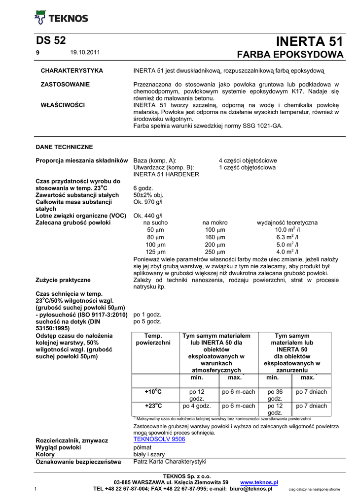 DS 52 9 INERTA 51 19.10.2011 FARBA EPOKSYDOWA CHARAKTERYSTYKA INERTA 51 jest dwuskładnikową, rozpuszczalnikową farbą epoksydową ZASTOSOWANIE Przeznaczona do stosowania jako powłoka gruntowa lub podkładowa w chemoodpornym, powłokowym systemie epoksydowym K17. Nadaje się również do malowania betonu. INERTA 51 tworzy szczelną, odporną na wodę i chemikalia powłokę malarską. Powłoka jest odporna na działanie wysokich temperatur, również w środowisku wilgotnym. Farba spełnia warunki szwedzkiej normy SSG 1021-GA. WŁAŚCIWOŚCI DANE TECHNICZNE 4 części objętościowe Proporcja mieszania składników Baza (komp. A): Utwardzacz (komp. B): 1 część objętościowa INERTA 51 HARDENER Czas przydatności wyrobu do 6 godz. stosowania w temp. 23oC 50±2% obj. Zawartość substancji stałych Ok. 970 g/l Całkowita masa substancji stałych Lotne związki organiczne (VOC) Ok. 440 g/l na sucho na mokro wydajność teoretyczna Zalecana grubość powłoki 50 µm 100 µm 10.0 m2 /l 80 µm 160 µm 6.3 m2 /l 100 µm 200 µm 5.0 m2 /l 125 µm 250 µm 4.0 m2 /l Ponieważ wiele parametrów własności farby może ulec zmianie, jeżeli nałoży się jej zbyt grubą warstwę, w związku z tym nie zalecamy, aby produkt był aplikowany w grubości większej niż dwukrotna zalecana grubość powłoki. Zależy od techniki nanoszenia, rodzaju powierzchni, strat w procesie Zużycie praktyczne natrysku itp. Czas schnięcia w temp. 23oC/50% wilgotności wzgl. (grubość suchej powłoki 50µm) - pyłosuchość (ISO 9117-3:2010) po 1 godz. po 5 godz. suchość na dotyk (DIN 53150:1995) Odstęp czasu do nałożenia Temp. Tym samym materiałem Tym samym kolejnej warstwy, 50% powierzchni lub INERTA 50 dla materiałem lub wilgotności wzgl. (grubość obiektów INERTA 50 eksploatowanych w dla obiektów suchej powłoki 50µm) eksploatowanych w warunkach zanurzeniu atmosferycznych min. max. * min. max. * +10oC +23oC *) po 12 godz. po 4 godz. po 6 m-cach po 6 m-cach po 36 godz. po 12 godz. po 7 dniach po 7 dniach Maksymalny czas do nałożenia kolejnej warstwy bez konieczności szorstkowania powierzchni Zastosowanie grubszej warstwy powłoki i wyższa od zalecanych wilgotność powietrza mogą spowolnić proces schnięcia. Rozcieńczalnik, zmywacz Wygląd powłoki Kolory Oznakowanie bezpieczeństwa 1 TEKNOSOLV 9506 półmat biały i szary Patrz Karta Charakterystyki TEKNOS Sp. z o.o. 03-885 WARSZAWA ul. Księcia Ziemowita 59 www.teknos.pl TEL +48 22 67-87-004; FAX +48 22 67-87-995; e-mail: [email protected] ciąg dalszy na następnej stronie INERTA 51 SPOSÓB STOSOWANIA Przygotowanie podłoża DS 52-9 strona 2 Usunąć z podłoża wszelkie zanieczyszczenia, które mogą niekorzystnie wpływać na proces przygotowania podłoża i malowania. Usunąć również rozpuszczalne w wodzie sole stosując odpowiednie metody, (ISO 12944-4). Powierzchnię należy oczyścić zależnie od rodzaju podłoża, jak niżej: Stal: Zgorzelinę i rdzę usunąć przy pomocy obróbki strumieniowo ściernej do uzyskania stopnia czystości Sa 21/2 (ISO 8501-1). Zszorstkowanie powierzchni cienkiej blachy poprawia adhezję do podłoża. Beton: Beton musi mieć, co najmniej 4 tygodnie, być dobrze utwardzony i wytrzymały. Zawartość wody w warstwie powierzchniowej nie może przekroczyć 4% wagowych. Powierzchnia powinna być gładka, pozbawiona wszelkich nierówności. Usunąć za pomocą szczotki luźny cement, piasek i kurz. Z powierzchni należy zmyć oleje i smary wodą z detergentem lub rozpuszczalnikiem. Jeśli występuje mleczko cementowe, należy je usunąć poprzez trawienie środkiem BETONI-PEITTAUSLIUOS, przez szlifowanie lub piaskowanie. Powierzchnie malowane nadające się do przemalowania: Wszelkie zanieczyszczenia, które mogą niekorzystnie wpływać na nakładanie farby (np. tłuszcze i sole), usunąć. Powierzchnia musi być czysta i sucha. Stare, pomalowane powierzchnie, które przekroczyły maksymalny odstęp czasu do nałożenia kolejnej warstwy należy zszorstkować. Uszkodzone fragmenty pomalowanej powierzchni należy przygotować do ponownego malowania zgodnie z wymaganiami stawianymi przez rodzaj podłoża i sposób renowacji. Czas i miejsce przygotowywania powinny być dobrane tak, ażeby powierzchnia przed malowaniem nie była brudna i wilgotna (ISO 12944-4). Grunt do czasowej ochrony INERTA 51 jest kompatybilna z gruntem KORRO E – epoksydowym. Przygotowanie wyrobu Przygotować tylko taką ilość farby, którą zużyje się w czasie krótszym niż czas przydatności do stosowania. Przed malowaniem zmieszać składnik bazowy z utwardzaczem we właściwej proporcji. Składniki wymieszać dokładnie w całej objętości naczynia. Niedokładne wymieszanie lub nieprawidłowy stosunek składników są przyczyną nieprawidłowego utwardzania i pogorszenia się własności powłoki. Warunki podczas nakładania Powierzchnia do malowania musi być sucha. Temperatura otaczającego powietrza, malowanej powierzchni i farby powinna być wyższa niż +10oC, a wilgotność względna powietrza poniżej 80% zarówno podczas nakładania jak i w okresie schnięcia wyrobu. Dodatkowo, temperatura malowanej powierzchni oraz farby musi być wyższa co najmniej o +3oC od temperatury punktu rosy otaczającego powietrza. Nakładanie Farbę przed użyciem dokładnie wymieszać. Farbę nanosi się głównie natryskiem bezpowietrznym, bo tylko ta metoda pozwala na otrzymanie zalecanej grubości warstwy przy jednokrotnym malowaniu. Używać dyszy do natrysku bezpowietrznego o średnicy 0.017 0.021". Malowanie pędzlem jest dopuszczalne jedynie w przypadku malowania małych powierzchni i wykonywania napraw miejscowych powłoki farby. Informacje dodatkowe Informacje dotyczące przechowywania umieszczone są na etykietce towaru. Farbę przechowywać w chłodnym pomieszczeniu, dokładnie zamkniętą. Dodatkowe informacje na temat przygotowani powierzchni można znaleźć w normie ISO 12944-4 i ISO 8501-2. Informacje zawarte w arkuszu dany