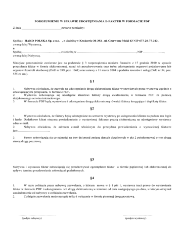 POROZUMIENIE W SPRAWIE UDOSTĘPNIANIA E-FAKTUR W FORMACIE PDF Z dnia __________________________zawarte pomiędzy: Spółką : HAKO POLSKA Sp. z o.o. , z siedzibą w Krakowie 30-392 , ul. Czerwone Maki 63 NIP 677-20-77-313 , zwaną dalej Wystawcą, a Spółką ……………………….…..….., z siedzibą w …………………………………………………., NIP …………….….., zwaną dalej Nabywcą. Niniejsze porozumienie zawierane jest na podstawie § 3 rozporządzenia ministra finansów z 17 grudnia 2010 w sprawie przesyłania faktur w formie elektronicznej, zasad ich przechowywania oraz trybu udostępniania organowi podatkowemu lub organowi kontroli skarbowej (DzU nr 249, poz. 1661) oraz ustawy z 11 marca 2004 o podatku towarów i usług (DzU nr 54, poz. 535 ze zm.). §1 1. Nabywca oświadcza, Ŝe zezwala na udostępnianie drogą elektroniczną faktur wystawianych przez wystawcę zgodnie z obowiązującymi przepisami, w formacie PDF. 2. Wystawca zobowiązuje się udostępnić klientowi faktury drogą elektroniczną w formacie PDF za pomocą dedykowanego serwisu internetowego. 3. W formacie PDF będą wystawiane i udostępniane drogą elektroniczną równieŜ faktury korygujące i duplikaty faktur. §2 1. Wystawca oświadcza, Ŝe faktury będą udostępniane na serwerze wystawcy po zalogowaniu klienta na podane mu login i hasło. Dodatkowo klient otrzyma powiadomienie o wystawionej fakturze pocztą elektroniczną na udostępniony wystawcy adres e-mail. 2. Nabywca oświadcza, Ŝe adresem e-mail właściwym do przesyłana powiadomienia o wystawionej fakturze jest:………………………….. 3. Strony zobowiązują się co najmniej na trzy dni przed zmianą danych określonych w pkt 2 poinformować o tym drugą stronę drogą pocztową. §3 Nabywca i wystawca faktur zobowiązują się przechowywać egzemplarze faktur w formie papierowej lub elektronicznej do upływu terminu przedawnienia zobowiązań podatkowych. §4 1. W razie cofnięcia przez nabywcę zezwolenia, o którym mowa w § 1 pkt 1, wystawca traci prawo do wystawienia faktur w formacie PDF i udostępniania ich drogą elektroniczną w terminie od dnia następującego po dniu, w którym otrzymał zawiadomienie od nabywcy o cofnięciu zezwolenia. 2. Cofnięcie zezwolenia moŜe nastąpić tylko i wyłącznie w formie pisemnej drogą pocztową. ……………………………. (podpis nabywcy) ………………........... (podpis wystawcy)