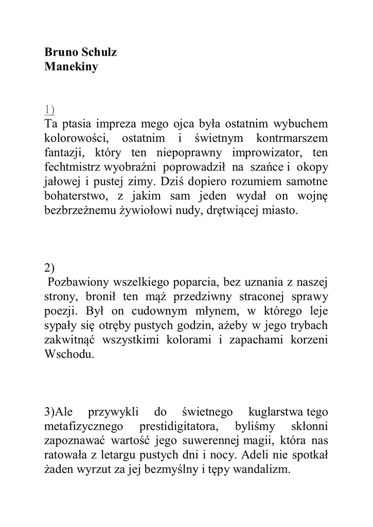 Bruno Schulz Manekiny 1) Ta ptasia impreza mego ojca była ostatnim wybuchem kolorowości, ostatnim i świetnym kontrmarszem fantazji, który ten niepoprawny improwizator, ten fechtmistrz wyobraźni poprowadził na szańce i okopy jałowej i pustej zimy. Dziś dopiero rozumiem samotne bohaterstwo, z jakim sam jeden wydał on wojnę bezbrzeżnemu żywiołowi nudy, drętwiącej miasto. 2) Pozbawiony wszelkiego poparcia, bez uznania z naszej strony, bronił ten mąż przedziwny straconej sprawy poezji. Był on cudownym młynem, w którego leje sypały się otręby pustych godzin, ażeby w jego trybach zakwitnąć wszystkimi kolorami i zapachami korzeni Wschodu. 3)Ale przywykli do świetnego kuglarstwa tego metafizycznego prestidigitatora, byliśmy skłonni zapoznawać wartość jego suwerennej magii, która nas ratowała z letargu pustych dni i nocy. Adeli nie spotkał żaden wyrzut za jej bezmyślny i tępy wandalizm. 4) Przeciwnie, czuliśmy jakieś niskie zadowolenie, haniebną satysfakcję z ukrócenia tych wybujałości, których kosztowaliśmy łakomie do syta, ażeby potem uchylić się perfidnie od odpowiedzialności za nie. A może był w tej zdradzie i tajny pokłon w stronę zwycięskiej Adeli, której przypisywaliśmy niejasno jakąś misję i posłannictwo sił wyższego rzędu. 5) Zdradzony przez wszystkich, wycofał się ojciec bez walki z miejsc swej niedawnej chwały. Bez skrzyżowania szpad oddał w ręce wroga domenę swej byłej świetności. Dobrowolny banita, usunął się do pustego pokoju na końcu sieni i oszańcował się tam samotnością. Zapomnieliśmy o nim. 6) Obległa nas znowu ze wszech stron żałobna szarość miasta, zakwitając w oknach ciemnym liszajem świtów, pasożytniczym grzybem zmierzchów, rozrastającym się w puszyste futro długich nocy zimowych. Tapety pokojów, rozluźnione błogo za tamtych dni i otwarte dla kolorowych lotów owej skrzydlatej czeredy, zamknęły się znów w sobie, zgęstniały, plącząc się w monotonii gorzkich monologów. 7) Lampy poczerniały i zwiędły jak stare osty i bodiaki. Wisiały teraz osowiałe i zgryźliwe, dzwoniąc cicho kryształkami szkiełek, gdy ktoś przeprawiał się omackiem przez szary zmierzch pokoju. Na próżno wetknęła Adela we wszystkie ramiona tych lamp kolorowe świece, nieudolny surogat, blade wspomnienie świetnych iluminacji, którymi kwitły niedawno wiszące ich ogrody. 8) Ach! gdzie było to świegotliwe pączkowanie, to owocowanie pośpieszne i fantastyczne w bukietach tych lamp, w których, jak z pękających czarodziejskich tortów, ulatywały skrzydlate fantazmaty, rozbijające powietrze na talie kart magicznych, rozsypując je w kolorowe oklaski, sypiące się gęstymi łuskami lazuru, pawiej, papuziej zieleni, metalicznych połysków, rysując w powietrzu linie i arabeski, migotliwe ślady lotów i kołowań, rozwijając kolorowe wachlarze trzepotów, utrzymujące się długo po przelocie w bogatej i błyskotliwej atmosferze. 9) Jeszcze teraz kryły się w głębi zszarzałej aury echa i możliwości barwnych rozbłysków, lecz nikt nie nawiercał fioletem, nie doświadczał świdrem zmętniałych słojów powietrznych. Tygodnie te stały pod znakiem dziwnej senności. 10) Łóżka cały dzień nie zaścielone, zawalone pościelą zmiętą i wytarzaną od ciężkich snów, stały jak głębokie łodzie gotowe do odpływu w mokre i zawiłe labirynty jakiejś czarnej, bezgwiezdnej Wenecji. O głuchym świcie Adela przynosiła nam kawę. Ubieraliśmy się leniwie w zimnych pokojach, przy świetle świecy, odbitej wielokrotnie w czarnych szybach okien. 11) Poranki te były pełne bezładnego krzątania się, rozwlekłego szukania w różnych szufladach i szafach. Po całym mieszkaniu słychać było kłapanie pantofelków Adeli. Subiekci zapalali latarnie, brali z rąk matki wielkie klucze sklepowe i wychodzili w gęstą, wirującą ciemność. 12) Matka nie mogła dojść do ładu z toaletą. Świece dogasały w lichtarzu. Adela przepadała gdzieś w odległych pokojach lub na strychu, gdzie rozwieszała bieliznę. Nie można jej było się dowołać. Młody jeszcze, mętny i brudny ogień w piecu lizał zimne, błyszczące narośle sadzy w gardzieli komina. Świeca gasła, pokój pogrążał się w ciemności. 13) Z głowami na obrusie stołu, wśród resztek śniadania zasypialiśmy na wpół ubrani. Leżąc twarzami na futrzanym brzuchu ciemności, odpływaliśmy na jego falistym oddechu w bezgwiezdną nicość. Budziło nas głośne sprzątanie Adeli. Matka nie mogła uporać się z toaletą. Nim skończyła czesanie, subiekci wracali na obiad. 14) Mrok na rynku przybierał kolor złotawego dymu. Przez chwilę z tych dymnych miodów, z tych mętnych bursztynów mogły się rozpowić kolory najpiękniejszego popołudnia. Ale szczęśliwy moment mijał, amalgamat świtu przekwitł, wezbrany ferment dnia, już niemal dościgły, opadał z powrotem w bezsilną szarość. 15) Zasiadaliśmy do stołu, subiekci zacierali czerwone z zimna ręce i nagle proza ich rozmów sprowadzała od razu pełny dzień, szary i pusty wtorek, dzień bez tradycji i bez twarzy. Ale gdy pojawiał się na stole półmisek z rybą w szklistej galarecie, dwie duże ryby leżące bok przy boku, głową do ogona jak figura zodiakalna, odpoznawaliśmy w nich herb owego dnia, emblemat kalendarzowy bezimiennego wtorku, i rozbieraliśmy go pośpiesznie między siebie, pełni ulgi, że dzień odzyskał w nim swą fizjonomię. 16) Subiekci spożywali go z namaszczeniem, z powagą kalendarzowej ceremonii. Zapach pieprzu rozchodził się po pokoju. A gdy wytarli bułką ostatek galarety ze swych talerzy, rozważając w myśli heraldykę następnych dni, i na półmisku zostawały tylko głowy z wygotowanymi oczyma — czuliśmy wszyscy, że dzień został wspólnymi siłami pokonany i że reszta nie wchodziła już w rachubę. 17) W samej rzeczy z resztą tą, wydaną na jej łaskę, Adela nie robiła sobie długic