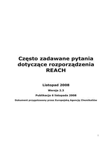 Często zadawane pytania dotyczące rozporządzenia REACH Listopad 2008 Wersja 2.3 Publikacja 6 listopada 2008 Dokument przygotowany przez Europejską Agencję Chemikaliów 1 1. INFORMACJE OGÓLNE 1.1 Co to jest REACH i gdzie mogę znaleźć informacje na jego temat? Skrót REACH pochodzi od nazwy rozporządzenia w sprawie rejestracji, oceny, udzielania zezwoleń i stosowanych ograniczeń w zakresie chemikaliów. Niniejsze rozporządzenie weszło w życie 1 czerwca 2007 r. w celu ulepszenia i usprawnienia wcześniej obowiązującego w Unii Europejskiej systemu prawnego obejmującego chemikalia. Ponadto, rozporządzenie REACH ustanawia Europejską Agencję Chemikaliów (ECHA), która pełni główną rolę w zarządzaniu oraz we wdrażaniu działań i procesów wynikających z rozporządzenia. Agencja z siedzibą w Helsinkach, w Finlandii zarządza procesami: rejestracji i oceny chemikaliów, udzielania zezwoleń na ich stosowanie, wprowadzania ograniczeń ich stosowania w celu zapewnienie spójnego podejścia w całej Unii Europejskiej. Tekst rozporządzenia REACH jest dostępny w Dzienniku Urzędowym opublikowanym na stronie Unii Europejskiej. O systemie REACH – w celu uzyskania podstawowych i zwięzłych informacji na temat REACH można skorzystać z zakładki „O systemie REACH” na stronie ECHA; Poradniki REACH – dostarczają dodatkowych informacji oraz wyjaśnień do przepisów prawnych. Przewodniki dostępne są na stronie Agencji. Poradniki powstały w drodze konsultacji między odpowiednimi zainteresowanymi stronami oraz dzięki bliskiej współpracy między Urzędami Właściwymi Państw Członkowskich a Komisją Europejską. Proszę zapoznać się z aktualną lista poradników na stronie Agencji. Opcja szukania „SEARCH” – pozwala na przeszukiwanie dostępnych dokumentów. Stosując słowo kluczowe podczas przeszukiwania (keyword search) wyświetla się odpowiednie rozdziały poradników lub odpowiednie sekcje na stronie Agencji. Narzędzie NAVIGATOR – Navigator pomaga w określeniu obowiązków wynikających z rozporządzenia REACH. REACH–IT i IUCLID5 - IUCLID5 jest oprogramowaniem narzędziowym pozwalającym na wprowadzanie, zarządzanie, gromadzenie i wymianę informacji o niebezpiecznych właściwościach chemikaliów. Załączony jest do niego poradnik: “Where to enter the data requirements for EU REACH Regulation”. IUCLID5 wykorzystuje ujednolicone szablony opracowane przez OECD (Organizacja Współpracy Gospodarczej i Rozwoju) w celu uzyskania dodatkowych informacji patrz pytanie 5.3 i 6.6). System REACH IT zapewni firmom dostęp do specjalnie dla nich stworzonych stron internetowych, za pomocą których dokonywane będzie przedkładanie dokumentacji rejestracyjnej. REACH-IT pozwoli także ECHA oraz właściwym organom Państw Członkowskich dokonywać przeglądu dokumentacji. ECHA udostępni na swojej stronie informacje, które nie są poufne. Więcej informacji na temat REACH-IT oraz IUCLID 5 dostępnych jest na stronie internetowej Agencji. Krajowe Centra Informacjne – w każdym pastwie członkowskim są wyznaczone centra informacyjne, z którymi można się skontaktować w celu uzyskania pomocy w kwestiach związanych z systemem REACH (szczegóły w pytaniu 1.5). Lista Krajowych Centrów Informacyjnych dostępna jest na stronie internetowej Agencji. Na stronie tej dodatkowo znajdują się informacje na temat centrum informacyjnego (Helpdesku) zorganizowanego i obsługiwanego przez samą Agencję, a także pomocne informacje dotyczące oprogramowania IUCLID 5. 2 1.2 Co zostało zmienione w sprostowaniu do rozporządzenia REACH z dnia 29 maja 2007? Sprostowanie do rozporządzenia REACH, opublikowane 29 maja 2007 r. miało na celu korektę błędów językowych, co nie wpłynęło w żaden sposób na treść rozporządzenia. Większość zmian powinna mieć zastosowanie w innych wersjach językowych niż angielska. Jedna zmiana, o której tu wspomnimy dotyczy błędu w druku w art. 64 ust 8: odwołanie do procedury podejmowania końcowej decyzji dotyczącej udzielenia lub odmowy udzielenia zezwolenia poprawiono na art. 133 ust. 3, będącą procedurą Komitetu. 1.3 Kiedy zaczyna obowiązywać system REACH? (Korekta) Artykuł 141 rozporządzenia REACH określa terminy wejścia w życie przepisów rozporządzenia i spełniania obowiązków z nich wynikających. Rozporządzenie REACH weszło w życie 1 czerwca 2007 r. Od tego dnia obowiązują przepisy rozporządzenia, które nie zostały wymienione w art. 141 ust. 2 – 4. Od 1 czerwca 2008 r. obowiązuje większość istotnych przepisów rozporządzenia, tj. Tytuł II - Rejestracja substancji, Tytuł III - Udostępnianie danych i unikanie powtarzania niepotrzebnych badań, Tytuł V - Dalsi użytkownicy, Tytuł VI - Ocena, Tytuł VII Procedura zezwoleń, Tytuł XI - Wykaz klasyfikacji i oznakowania oraz Tytuł XII – Informacje, a także artykuł 128 dotyczący klauzuli o swobodnym przepływie oraz art. 136 o środkach przejściowych dotyczących substancji istniejących. Tytuł VIII i Załącznik XVII odnoszące sie do ograniczeń dotyczących produkcji, wprowadzania do obrotu i stosowania niektórych niebezpiecznych substancji chemicznych, preparatów i wyrobów, będą obowiązywać od 1 czerwca 2009 r. 1.4 Kto jest REACH? odpowiedzialny za wprowadzenie w życie rozporządzenia Zgodnie z art. 125 i 126 rozporządzenia REACH państwa członkowskie odpowiadają za przygotowanie do dnia 1 grudnia 2008 r. przepisów ustanawiających właściwy system kontroli oraz określających kary za nieprzestrzeganie przepisów rozporządzenia REACH. Zalecamy skontaktowanie się z właściwym organem we własnym państwie członkowskim w celu uzyskania informacji na temat krajowych procedur kontroli. W celu uzyskania szczegółowych informacji można zwrócić się także do służb celnych oraz krajowego centrum informacyjnego ds. REACH. 1.5 Jeżeli mam pytanie na temat REACH, z kim należy się kontaktować? Do