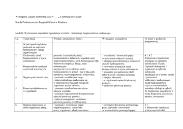 Wymagania. Zajęcia techniczne klasa V „ Z techniką na co dzień” Szkoła Podstawowa im. Przyjaciół Ziemi w Kłodawie Moduł I. Wytwarzanie materiałów i produkcja wyrobów. Informacja, bezpieczeństwo, technologia. Lp. Temat lekcji 1 W jaki sposób będziemy pracować na zajęciach technicznych?- lekcja organizacyjna Zachowanie zasad bezpieczeństwa w życiu codziennym. 2 3 Bezpieczeństwo podczas wycieczek rowerowych 4 Wypoczynek latem i zimą 5 Pomoc poszkodowanym w wypadkach 6. Staranne planowanie to dobra organizacja pracy. Wiedza i umiejętności (treści) Wymagania szczegółowe Nr treści w podstawie programowej poznanie i zrozumienie pojęć: bezpieczeństwo, katastrofa, wypadek, uraz; znaki bezpieczeństwa, atest, homologacja, bhp, Państwowa Inspekcja Pracy; znaki informacyjne turystyczne i przyrodnicze, znaki bezpieczeństwa w górach i nad wodą, park narodowy, rezerwat przyrody, środowisko, • poznanie zasad bezpiecznego i odpowiedzialnego zachowania się w określonych sytuacjach niosących zagrożenie życia i zdrowia, • poznanie zasad zachowania się na miejscu wypadku, • poznanie wyposażenia i skompletowanie apteczki pierwszej pomocy, • nabycie umiejętności udzielania pierwszej pomocy przedlekarskiej • poznanie i zrozumienie pojęć: organizacja pracy, stanowisko pracy, ergonomia, Międzynarodowa • rozumienie i stosowanie pojęć 4.1, 4.2 4.Sprawnie i bezpiecznie posługuje się sprzętem technicznym. Uczeń: 1) potrafi obsługiwać i regulować urządzenia techniczne znajdujące się w domu, szkole i przestrzeni publicznej z zachowaniem zasad bezpieczeństwa; czyta ze zrozumieniem instrukcje obsługi urządzeń; 2) bezpiecznie uczestniczy w ruchu drogowym jako pieszy, pasażer, rowerzysta. w opisywaniu zdarzeń i sytuacji, • odczytywanie informacji z poznanych znaków i piktogramów, • stosowanie poznanych zasad bezpieczeństwa w życiu codziennym, • umiejętne powiadomienie służb ratowniczych i złożenie meldunku z miejsca zdarzenia, • przygotowanie apteczki pierwszej pomocy, • udzielenie pierwszej pomocy • rozwijanie słownictwa technicznego przez używanie i stosowanie ze zrozumieniem poznanych pojęć, 3.1 3. Planowanie i realizacja praktycznych działań 7 Czym jest: surowiec, materiał, proces technologiczny? 8 Język techniczny zrozumiały i użyteczny. 9 Poznajemy zasady rzutowania prostokątnego. 10 Wymiarujemy rysunek techniczny. 11 Praktyczne zastosowanie dokumentacji technicznej w życiu. 12 Wynalazek Chińczyków ułatwia nam życie. Organizacja Pracy, • omówienie zasad planowania i organizowania czasu pracy, • poznanie zasad i analiza ergonomicznej organizacji stanowiska pracy, • opracowanie regulaminów: domowego i pracowni technicznej • urządzenia techniczne, narzędzia, przyrządy, przybory; surowce, materiały, proces technologiczny, • poznanie zależności między surowcem i materiałem oraz klasyfikacja surowców i materiałów, • planowanie pracy i czasu własnego, • ergonomiczne organizowanie stanowiska pracy w szkole i w domu, technicznych. Uczeń: 1) wypisuje kolejność działań (operacji technologicznych); szacuje czas ich trwania; organizuje miejsce pracy; • rozróżnianie surowców i materiałów, • znajomość ich właściwości, • poznanie i zrozumienie pojęć: normalizacja, norma, normy ISO, EU, PN, certyfikat, patent, licencja, Polski Komitet Normalizacyjny, Międzynarodowa Organizacja Normalizacyjna, • zarządzanie jakością, rysunek poglądowy, • poznanie zasad sporządzania rysunku poglądowego, • rysowanie przedmiotów w sposób poglądowy, • poznanie zasad rzutowania prostokątnego, • przedstawianie przedmiotów w rzutach prostokątnych, • zrozumienie zasad wymiarowania rysunku technicznego • wzbogacenie słownictwa technicznego, • korzystanie z rożnych źródeł informacji do rozwiązania problemu technicznego, • sporządzanie i zastosowanie rysunków poglądowych w pracach projektowych, • zastosowanie rzutów prostokątnych w dokumentacji technicznej, • wymiarowanie rysunków technicznych 1.2 1. Opisywanie techniki w bliższym i dalszym otoczeniu. Uczeń: 2) podaje zalety i wady stosowanych rozwiązań materiałowych i konstrukcyjnych. 2.2 2. Opracowywanie koncepcji rozwiązań problemów technicznych. Uczeń: 2) zapisuje rozwiązania techniczne w formie graficznej, wykonuje odręczne szkice techniczne i proste rysunki rzutowe (prostokątne i aksonometryczne), analizuje rysunki techniczne stosowane w katalogach i instrukcji obsługi; • poznanie i zrozumienie pojęć: papirus, pergamin, papier, orgiami, makulatura, gramatura papieru, stosowanie słownictwa technicznego, • znajomość procesu produkcyjnego papieru, 2.1 2. Opracowywanie koncepcji rozwiązań problemów 13 Cykl produkcji papieru. 14 Poznajemy sztukę origami. 15 Włókna – modne i przydatne w życiu. 16 Rodzaje wyrobów włókienniczych. formaty papieru, cykl produkcyjny, • poznanie historii powstania papieru, • poznanie surowców do jego wyrobu, • poznanie technologii wyrobu papieru, • klasyfikacja materiałów papierniczych poznanie szeregów formatów papieru i oznaczeń wielkości arkuszy, • poznanie i badanie właściwości wyrobów papierniczych, • poznanie narzędzi i przyborów do obróbki papieru oraz zasad ich bezpiecznego używania, • poznanie zasad planowania pracy wytwórczej, • poznanie i nabycie umiejętności wykonywania podstawowych operacji technologicznych, • poznanie zasad sztuki origami • poznanie i zrozumienie pojęć: odzież, moda, tkanina, dzianina, splot, osnowa, wątek, oczko, kolumienka, higroskopijność, sprężystość, piktogram, rozmiar, fason, ścieg, haft, aplikacja, forma, • poznanie historii ubioru i funkcji odzieży, • klasyfikowanie surowców i materiałów włókienniczych, • badanie właściwości materiałów włókienniczych, • poznanie budowy tkanin i dzianin oraz sposobów ich wytwarzania, • rozumienie r