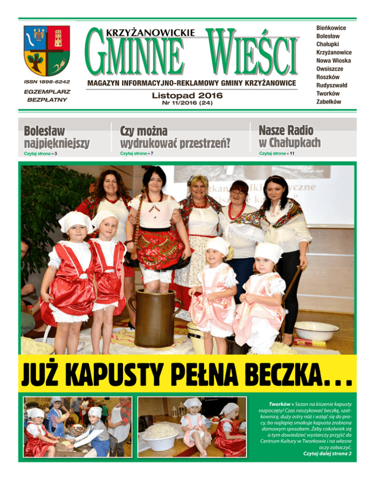 ISSN 1898-6242 MAGAZYN INFORMACYJNO-REKLAMOWY GMINY KRZYŻANOWICE EGZEMPLARZ BEZPŁATNY Bolesław najpiękniejszy Czytaj strona » 3 Listopad 2016 Nr 11/2016 (24) Czy można wydrukować przestrzeń? Czytaj strona » 7 Bieńkowice Bolesław Chałupki Krzyżanowice Nowa Wioska Owsiszcze Roszków Rudyszwałd Tworków Zabełków Nasze Radio w Chałupkach Czytaj strona » 11 JUŻ KAPUSTY PEŁNA BECZKA… Tworków » Sezon na kiszenie kapusty rozpoczęty! Czas naszykować beczkę, szatkownicę, duży ostry nóż i wziąć się do pracy, bo najlepiej smakuje kapusta zrobiona domowym sposobem. Żeby cokolwiek się o tym dowiedzieć wystarczy przyjść do Centrum Kultury w Tworkowie i na własne oczy zobaczyć. Czytaj dalej strona 2 2 » Ogłoszenia i komunikaty » Listopad 2016 » Krzyżanowickie Gminne Wieści KALENDARZ NAJBLIŻSZYCH IMPREZ PLANOWANYCH w gminie Krzyżanowice 04.12.2016 Kiermasz Świąteczny Centrum Kultury w Tworkowie 04.12.2016 Weihnachtsfest Bolesław, przy remizie OSP 06.12.2016 Spotkanie Mikołajkowe – bajka dla dzieci Świetlica w Roszkowie 11.12.2016 Kiermasz Świąteczny - Weihnachtsfest Krzyżanowice, parking przy kościele 11.12.2016 Kiermasz Świąteczny Chałupki, Centrum Wypoczynku i Rekreacji 11.12.2016 Weihnachtsmarkt Tworków, przy kościele Gminny Przegląd Kolęd i Pastorałek w języku polskim i niemieckim 14.12.2016 pt. „Weihnachten mit Weihnachtslieden - Święta z Kolędą” Centrum Kultury w Tworkowie 18.12.2016 Weihnachtsfest Świetlica w Roszkowie 18.12.2016 Weihnachtsfest Bieńkowice, przy remizie OSP « Wydarzenia i aktualności « 3 Listopad 2016 » Krzyżanowickie Gminne Wieści Już kapusty pełna beczka… W środę 26 października zebrały się gospodynie z gminy Krzyżanowice, aby deptać kapustę – choć nie w dębowej beczce, ale w kamiennym buncloku. Najpierw obrano kapustę z brudnych i uszkodzonych liści, potem poszatkowano na maszynce. Do deptania przygotowała się w tym roku Agnieszka Lasak z Bieńkowic, dokładnie myjąc nogi w gorącej wodzie. Zapracowanym gospodyniom przyglądały się zaciekawione gospodynie uprzyjemniały sobie śpiewem, nato miast dzieci ze szkoły i przedszkola w Bole- przedszkolaki, które przyszły zobaczyć to niezwykłe dla nich widowisko. Bo było co oglądać, a i pokosztować można marchewki i jabłek, które dodaje się do kapusty. Kilka dziewczynek także pomagało deptać kapustę. Zapracowane gospodynie odwiedził zastępca wójta gminy Grzegorz Swoboda. Deptanie kapusty to również, tak jak kiedyś bywało, spotkanie towarzyskie i to bardzo wesołe. Czas wypełniony pracą Bolesław najpiękniejszą wsią sławiu przygotowały krótki program z wierszykami i skecz. Nie mogło także obyć się bez wspólnego posiłku, który przed imprezą przygotowały panie ze świetlic wiejskich gminy Krzyżanowice. WOJEWÓDZTWA ŚLĄSKIEGO! Nowy komendant w Krzyżanowicach Rozstrzygnięto tegoroczną edycję konkursu Piękna Wieś Województwa Śląskiego, którego organizatorem jest Urząd Marszałkowski. Najpiękniejszą wsią województwa śląskiego, spośród 29 miejscowości zgłoszonych do konkursu, został Bolesław – jedno z najmniejszych sołectw gminy Krzyżanowice. 6 września Bolesław odwiedziła komisja konkursowa. Gospodarze przywitali jurorów kawą i kołoczem. Potem goście zwiedzali miejscowość, przewodnikami byli sołtys Bertold Fichna i pani Urszula Prochaska-Burek. W wizytacji uczestniczył wójt gminy Grzegorz Utracki oraz przedstawiciele organizacji działających w so- łectwie. Jurorzy byli pod ogromnym wrażeniem zaangażowania mieszkańców w życiu kulturalno - społecznym małego Bolesławia. Przy ocenie komisja wzięła pod uwagę aktywność społeczności lokalnej w działaniu na rzecz wsi, sposoby współdziałania samorządu z mieszkańcami oraz umiejętności zaprezentowania dorobku wsi podczas wizytacji. O przebiegu wizytacji informowaliśmy we wrześniowym numerze Gminnych Wieści. W kategorii najpiękniejsza wieś województwa śląskiego przyznano następujące nagrody: • I miejsce - Bolesław gm. Krzyżanowice pow. raciborski • II miejsce – Wręczyca Wielka gm. Wręczyca Wielka pow. kłobucki • III miejsce – Łodygowice gm. Łodygowice pow. żywiecki Warto przypomnieć, że w 2008 roku tytuł „Piękna wieś województwa śląskiego” otrzymał Tworków. Natomiast rok wcześniej w konkursie wzięły udział Owsiszcze, zdobywając drugie miejsce – wtedy pierwszego miejsca komisja konkursowa nie przyznała żadnej miejscowości. Natomiast w 2014 roku komisja przyznała wyróżnienie dla Roszkowa. (tb) „Kiszynie kapusty” po raz ósmy zorganizował Gminny Zespół Oświaty, Kultury, Sportu i Turystyki przy wydatnej pomocy pań z kół gospodyń wiejskich całej gminy. (tb) wprowadzenia nowego komendanta dokonał Komendant Powiatowy Policji w Raciborzu insp. Łukasz Krebs. Podinspektor Bogdan Gładysz w Policji służy od ponad 17 lat. Ostatnie zajmowane przez niego stanowisko to zastępca komendanta Komisariatu Policji w Kuźni Raciborskiej. Kandydatura komendanta Komisariatu została pozytywnie zaopiniowana i przyjęta przez władze samorządowe gminy Krzyżanowice i miasta Krzanowice. Rozkazem personalnym nr 264/16 z dnia 24 października 2016 roku podinsp. Bogdan Gładysz został powołany przez komendanta powiatowego policji w Raciborzu insp. ŁukaKrzyżanowice » W ponieW obecności wójta gminy sza Krebsa na stanowisko kodziałek 7 listopada odbyła się Krzyżanowice Grzegorza Utrac- mendanta Komisariatu Policji uroczystość objęcia stanowi- kiego, zastępcy burmistrza mia- w Krzyżanowicach z dniem 1 ska komendanta Komisariatu sta Krzanowice Jarosława Gał- listopada 2016 roku. Policji w Krzyżanowicach przez kowskiego, a także funkcjonariuZdj: KPP Racibórz podinsp. Bogdana Gładysza. szy Komendy Powiatowej Policji, 4 » Wydarzenia i aktualności » KRÓTKO 3 listopada Rewitalizacja społeczna była przedmiotem konferencji, odbywają