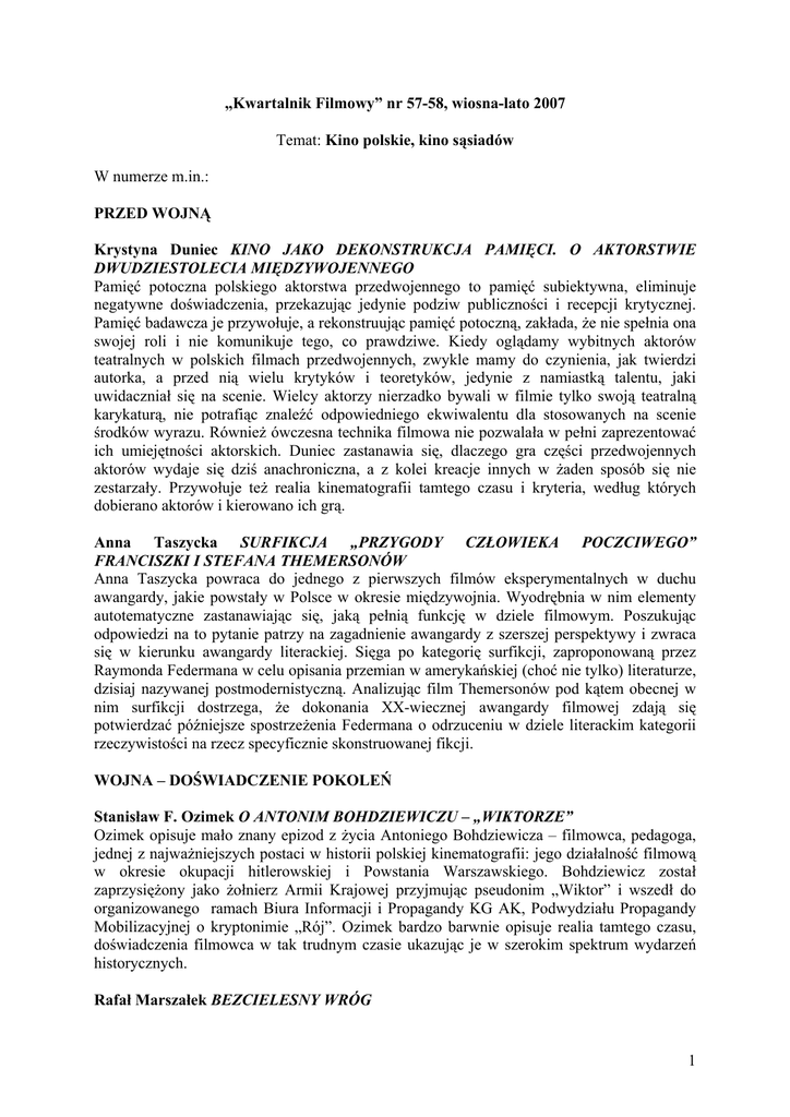 „Kwartalnik Filmowy” nr 57-58, wiosna-lato 2007 Temat: Kino polskie, kino sąsiadów W numerze m.in.: PRZED WOJNĄ Krystyna Duniec KINO JAKO DEKONSTRUKCJA PAMIĘCI. O AKTORSTWIE DWUDZIESTOLECIA MIĘDZYWOJENNEGO Pamięć potoczna polskiego aktorstwa przedwojennego to pamięć subiektywna, eliminuje negatywne doświadczenia, przekazując jedynie podziw publiczności i recepcji krytycznej. Pamięć badawcza je przywołuje, a rekonstruując pamięć potoczną, zakłada, że nie spełnia ona swojej roli i nie komunikuje tego, co prawdziwe. Kiedy oglądamy wybitnych aktorów teatralnych w polskich filmach przedwojennych, zwykle mamy do czynienia, jak twierdzi autorka, a przed nią wielu krytyków i teoretyków, jedynie z namiastką talentu, jaki uwidaczniał się na scenie. Wielcy aktorzy nierzadko bywali w filmie tylko swoją teatralną karykaturą, nie potrafiąc znaleźć odpowiedniego ekwiwalentu dla stosowanych na scenie środków wyrazu. Również ówczesna technika filmowa nie pozwalała w pełni zaprezentować ich umiejętności aktorskich. Duniec zastanawia się, dlaczego gra części przedwojennych aktorów wydaje się dziś anachroniczna, a z kolei kreacje innych w żaden sposób się nie zestarzały. Przywołuje też realia kinematografii tamtego czasu i kryteria, według których dobierano aktorów i kierowano ich grą. Anna Taszycka SURFIKCJA „PRZYGODY CZŁOWIEKA POCZCIWEGO” FRANCISZKI I STEFANA THEMERSONÓW Anna Taszycka powraca do jednego z pierwszych filmów eksperymentalnych w duchu awangardy, jakie powstały w Polsce w okresie międzywojnia. Wyodrębnia w nim elementy autotematyczne zastanawiając się, jaką pełnią funkcję w dziele filmowym. Poszukując odpowiedzi na to pytanie patrzy na zagadnienie awangardy z szerszej perspektywy i zwraca się w kierunku awangardy literackiej. Sięga po kategorię surfikcji, zaproponowaną przez Raymonda Federmana w celu opisania przemian w amerykańskiej (choć nie tylko) literaturze, dzisiaj nazywanej postmodernistyczną. Analizując film Themersonów pod kątem obecnej w nim surfikcji dostrzega, że dokonania XX-wiecznej awangardy filmowej zdają się potwierdzać późniejsze spostrzeżenia Federmana o odrzuceniu w dziele literackim kategorii rzeczywistości na rzecz specyficznie skonstruowanej fikcji. WOJNA – DOŚWIADCZENIE POKOLEŃ Stanisław F. Ozimek O ANTONIM BOHDZIEWICZU – „WIKTORZE” Ozimek opisuje mało znany epizod z życia Antoniego Bohdziewicza – filmowca, pedagoga, jednej z najważniejszych postaci w historii polskiej kinematografii: jego działalność filmową w okresie okupacji hitlerowskiej i Powstania Warszawskiego. Bohdziewicz został zaprzysiężony jako żołnierz Armii Krajowej przyjmując pseudonim „Wiktor” i wszedł do organizowanego ramach Biura Informacji i Propagandy KG AK, Podwydziału Propagandy Mobilizacyjnej o kryptonimie „Rój”. Ozimek bardzo barwnie opisuje realia tamtego czasu, doświadczenia filmowca w tak trudnym czasie ukazując je w szerokim spektrum wydarzeń historycznych. Rafał Marszałek BEZCIELESNY WRÓG 1 Tekst jest zapisem wystąpienia na międzynarodowej konferencji „Powstanie Warszawskie w kontekście stosunków polsko-niemieckich”, która odbyła się w Warszawie w dniach 30 marca – 1 kwietnia 2007 r. Rafał Marszałek stawia w nim tezę, że z należących do nurtu szkoły polskiej wybranych dział Andrzeja Wajdy, Kazimierza Kutza i Andrzeja Munka wyłania się najpierw wróg bezzębny, potem wróg bezcielesny. Nie ma w nich natomiast miejsca dla wroga absolutnego, nie ujawnia się w nich nienawiść do Niemców jako najeźdźców i okupantów. Tak dzieje się np. w Kanale, w którym zagłada powstańczego oddziału zobrazowana została w języku symbolicznym; w Ostinato lugubre – drugiej noweli Eroiki, gdzie Niemcy jako wróg nie są demonicznym upostaciowaniem opresji; ale także w noweli Pies z Krzyża Walecznych – tu bohater oszczędza życie psu, pilnującemu kiedyś więźniów w Oświęcimiu, uświadomiwszy sobie, że niewinne zwierze nie może symbolizować bezcielesnego, nieznanego Niemca. Marszałek zauważa, że taka dematerializacja wroga nie wypływa z przebaczenia, lecz raczej ze szczególnego instynktu samozachowawczego. Marcin Maron „SZYFRY” Autor analizuje jeden z najciekawszych, choć nieco dziś zapomniany film Wojciecha J. Hasa Szyfry (1966). Jest to dzieło dające świadectwo czasów, w których się zrodziło, a zarazem film-poemat, który niesie głęboką i uniwersalną refleksję dotyczącą międzyludzkich więzi – osobistych, społecznych i narodowych. Na kanwie opowieści o ojcu poszukującym śladów zaginionego podczas wojny syna, Has wnikliwie diagnozuje kondycję moralną Polaków i charakter powojennej rzeczywistości; rewiduje jej fałszywy obraz i stawia pytania o sens wspólnych – wojennych i powojennych – doświadczeń oraz o możliwość ich integracji w kontekście współczesnym. Polifoniczna struktura dzieła – współtworzą ją „sceny wizyjne” i fragmenty poematu Juliusza Słowackiego Anhelli – obfituje w symboliczne znaczenia. Między innymi właśnie dzięki nim film zmusza widza do „hermeneutycznego” odczytania historii; ma ono umożliwić wgląd w skomplikowaną prawdę o ludziach i czasie, ukrytą pod powierzchnią najbardziej nawet tragicznych faktów. Wojciech Świdziński „POŻEGNANIA” – Z CZYM SIĘ ŻEGNA WOJCIECH JERZY HAS? Pożegnaniami Wojciech Jerzy Has rozpoczął swoje filmowe rozważania nad strukturą czasu. Prowadząc poetycki, podszyty ironią dialog z narodową tradycją i prozą Stanisława Dygata, zrealizował film, który wszedł do kanonu szkoły polskiej. Jednocześnie pozostał na jej uboczu. Reżysera bardziej niż historia przez wielkie „h” interesowały poszukiwania zaginionego czasu, obserwowanie odchodzenia w przeszłość ludzi, miejsc i rzeczy. Romans dwójki bohaterów zostaje w zakończeniu niemal dosłownie rozjechany przez kolumnę radzie