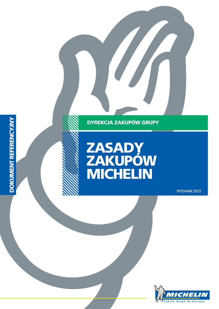 DOKUMENT REFERENCYJNY DYREKCJA ZAKUPÓW GRUPY ZASADY ZAKUPÓW MICHELIN WYDANIE 2015 SPIS TREŚCI WSTĘP ZASADY I WARTOŚCI GRUPY MICHELIN 04 ZASADY ZAKUPÓW MICHELIN 06 08 ➥ Misja ➥ Zasady deontologii i etyki w relacjach z dostawcami ➥ Wybór dostawców ➥ Jakość ➥ Zarządzanie relacjami z dostawcami „SRM“ ➥ Business Continuity Management „BCM“ ➥ Nasza Polityka CSR, Osiągnięcia i Odpowiedzialność Michelin: „Lepsza droga do postępu“ w Zakupach ➥ Ocena wyników Wnioski ZAŁĄCZNIKI ➥ Jakość – proces zatwierdzania produktu ➥ Kryteria oceny CSR 26 WSTĘP WSTĘP Grupa Michelin została zbudowana na głęboko zakorzenionych wartościach wyrażonych w Karcie Osiągnięć i Odpowiedzialności Michelin. Wartości te, kierując nami od zawsze, ukształtowały naszą kulturę oraz zbudowały naszą renomę firmy przyczyniającej się do rozwoju mobilności towarów i ludzi dzięki jakości oferowanych produktów i usług. Nasza strategia polega na nawiązywaniu długoterminowych relacji z dostawcami z poszanowaniem ich interesów i kultury. Zasady Zakupów oparte są na wartościach Grupy; stanowią podstawę zaufania, jakie musi istnieć pomiędzy Grupą Michelin, jej zespołami zakupowymi a dostawcami na całym świecie. Celem niniejszego dokumentu jest zestawienie podstawowych wytycznych, tak aby każdy uczestnik procesu niezależnie od okoliczności mógł się do nich odwołać i dostosować. Zasady te nie są wyczerpujące, lecz w powiązaniu z indywidualnym poczuciem odpowiedzialności stanowią użyteczny punkt odniesienia dla wszystkich pracowników firmy Michelin i jej partnerów. Zarówno dla Michelin, jak i dla dostawców Zasady Zakupów posłużą do wyznaczenia ram naszej działalności, pomogą w dokonywaniu wyborów oraz bieżącej realizacji naszej misji. Obowiązkiem nas wszystkich jest postępować zgodnie z tymi wytycznymi i zasadami. Na nich opiera się nasza uczciwość i etyka. Pozwoli to nam być bardziej niż kiedykolwiek firmą, która wzbudza zaufanie i szacunek, tworzy wartości dla swoich partnerów i siebie samej. Promując ważne wartości oraz przestrzegając wysokich norm etycznych, Serwis Zakupów jest uprzywilejowanym rozmówcą dostawców, z którymi angażujemy się we wspólne działania na rzecz ciągłego postępu i dzielenia się osiągnięciami. Luc Minguet Dyrektor Generalny Zakupów Grupy ZASADY ZAKUPÓW MICHELIN 04 ZASADY I WARTOŚCI GRUPY ZASADY I WARTOŚCI GRUPY ZASADY I WARTOŚCI GRUPY Firma Michelin z inicjatywy swoich założycieli obrała misję przyczyniania się w sposób odpowiedzialny do rozwoju mobilności. Odzwierciedleniem tego jest motto marki „Lepsza droga do postępu”. Grupa zdecydowała się realizować swoją misję poprzez innowacje i jakość, opierając swój rozwój na następujących wartościach: szacunek dla Klientów, szacunek dla Ludzi, szacunek dla Akcjonariuszy, szacunek dla Środowiska oraz szacunek dla Faktów. Od 2002 roku karta Osiągnięcia i Odpowiedzialność Michelin (PRM) określa sposób, w jaki Grupa działa i wdraża innowacje. Karta Osiągnięcia i Odpowiedzialność Michelin, „Lepsza droga do postępu” strukturyzuje kulturę firmy oraz określa nasze zobowiązania w zakresie stosowania zasad zrównoważonego i odpowiedzialnego rozwoju. To globalne podejście leżące u podstaw wszystkich projektów, skierowane na wszystkie poziomy firmy, tłumaczy chęć Michelin do budowania długoterminowej wizji swojego rozwoju, z zachowaniem równowagi pomiędzy wynikami ekonomicznymi, poszanowaniem środowiska i stałym dążeniem do jakości w relacjach z pracownikami i partnerami firmy. Zasady ujęte w Karcie Osiągnięć i Odpowiedzialności Michelin, „Lepsza droga do postępu” odzwierciedlają: KNOW-HOW SPECYFICZNY DLA MICHELIN ➥ Słuchanie i zaspokajanie potrzeb klientów ➥ Działanie na rzecz wydajności ekonomicznej Grupy ➥ Harmonijne włączanie się do życia społeczności lokalnych oraz wspólnot, które nas otaczają, we wszystkich krajach na całym świecie ➥ Działalność bardziej przyjazna środowisku ➥ Budowanie uczciwych i trwałych relacji z partnerami przemysłowymi, handlowymi oraz z naszymi dostawcami WYJĄTKOWĄ KULTURĘ ➥ Szacunek dla Ludzi ➥ Gwarancja jakości ➥ Promowanie innowacyjności ➥ Ciągły postęp ➥ Szacunek dla Faktów ➥ Posiadanie długoterminowej wizji Te historyczne wartości stanowią atut przy podejmowaniu poważnych wyzwań obecnie i w przyszłości. ZASADY ZAKUPÓW MICHELIN 06 ZASADY ZAKUPÓW MICHELIN ZASADY ZAKUPÓW MICHELIN MISJA Firma Michelin współpracuje z dostawcami, którzy spełniają jej wymogi dotyczące jakości, kosztów, terminowości i wiarygodności oraz zobowiązują się do ciągłego postępu na rzecz poszanowania ludzi i środowiska. Relacje Grupy Michelin z dostawcami wpisują się w poszanowanie podstawowych zasad ujętych w Karcie Osiągnięć i Odpowiedzialności Michelin, „Lepsza droga do postępu” przywołanych powyżej. Opierają się one również na zasadach obiektywizmu, sprawiedliwości i lojalności. Michelin wymaga od swoich dostawców znajomości podstawowych zasad regulujących współpracę opisanych w niniejszym dokumencie oraz chce mieć pewność, że dostawcy ich przestrzegają. MISJA Misja Serwisu Zakupów polega na zagwarantowaniu klientom wewnętrznym dostępności niezbędnych wyrobów i usług poprzez wybór dostawców, którzy spełniają wymagania techniczne i ekonomiczne firmy jak również jej oczekiwania w wymiarze społecznym i środowiskowym. Jednym ze składników misji Serwisu Zakupów jest również nawiązywanie długoterminowych relacji z dostawcami. Oznacza to przede wszystkim wspieranie rozwoju w celu tworzenia wspólnych wartości, prowadzenie dialogu dotyczącego jakości, utrzymywanie regularnej komunikacji oraz promowanie innowacyjności. Naszym celem jest przyczynianie się do rozwoju konkurencyjności jednostek operacyjnych Grupy poprzez 