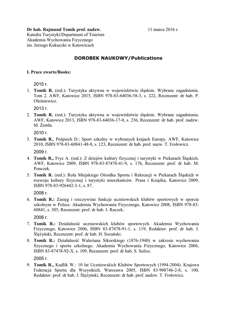 Dr hab. Rajmund Tomik prof. nadzw. Katedra Turystyki/Department of Tourism Akademia Wychowania Fizycznego im. Jerzego Kukuczki w Katowicach 11 marca 2016 r. DOROBEK NAUKOWY/Publications I. Prace zwarte/Books: 2015 r. 1. Tomik R. (red.): Turystyka aktywna w województwie śląskim. Wybrane zagadnienia. Tom 2. AWF, Katowice 2015, ISBN 978-83-64036-58-3, s. 222, Recenzent: dr hab. P. Oleśniewicz. 2013 r. 2. Tomik R. (red.): Turystyka aktywna w województwie śląskim. Wybrane zagadnienia. AWF, Katowice 2013, ISBN 978-83-64036-17-0, s. 236, Recenzent: dr hab. prof. nadzw. M. Żemła. 2010 r. 3. Tomik R., Pośpiech D.: Sport szkolny w wybranych krajach Europy. AWF, Katowice 2010, ISBN 978-83-60841-48-8, s. 123, Recenzent: dr hab. prof. nazw. T. Frołowicz. 2009 r. 4. Tomik R., Fryc A. (red.): Z dziejów kultury fizycznej i turystyki w Piekarach Śląskich. AWF, Katowice 2009, ISBN 978-83-87478-41-9, s. 176, Recenzent: prof. dr hab. M. Ponczek. 5. Tomik R. (red.): Rola Miejskiego Ośrodka Sportu i Rekreacji w Piekarach Śląskich w rozwoju kultury fizycznej i turystyki mieszkańców. Prasa i Książka, Katowice 2009, ISBN 978-83-926442-3-1, s. 87. 2008 r. 6. Tomik R.: Zasięg i rzeczywiste funkcje uczniowskich klubów sportowych w sporcie szkolnym w Polsce. Akademia Wychowania Fizycznego, Katowice 2008, ISBN 978-8360841, s. 305, Recenzent: prof. dr hab. J. Raczek. 2006 r. 7. Tomik R.: Działalność uczniowskich klubów sportowych. Akademia Wychowania Fizycznego, Katowice 2006, ISBN 83-87478-91-1, s. 119, Redaktor: prof. dr hab. J. Ślężyński, Recenzent: prof. dr hab. H. Sozański. 8. Tomik R.: Działalność Waleriana Sikorskiego (1876-1940) w zakresie wychowania fizycznego i sportu szkolnego. Akademia Wychowania Fizycznego, Katowice 2006, ISBN 83-87478-92-X, s. 109, Recenzent: prof. dr hab. S. Sulisz. 2005 r. 9. Tomik R., Kudlik W.: 10 lat Uczniowskich Klubów Sportowych (1994-2004). Krajowa Federacja Sportu dla Wszystkich, Warszawa 2005, ISBN 83-908746-2-8, s. 100, Redaktor: prof. dr hab. J. Ślężyński, Recenzent: dr hab. prof. nadzw. T. Frołowicz. II. Artykuły i doniesienia naukowe i metodyczne/articles 1. 2. 3. 4. 5. 6. 7. 8. 9. 2015 r. Tomik R., Ardeńska A.: Motywy uprawiania wybranych rodzajów turystyki aktywnej. (W:) Turystyka aktywna w województwie śląskim. Wybrane zagadnienia. Tom 2. Red. R. Tomik. AWF, Katowice 2015, 9-23. Wyszkowska E., Plaszczyk T., Tomik R.: Zachowania wolnoczasowe turystów odwiedzających schronisko PTTK na Przegibku w miesiącach letnich. (W:) Turystyka aktywna w województwie śląskim. Wybrane zagadnienia. Tom 2. Red. R. Tomik. AWF, Katowice 2015, 39-54. Hadzik A., Ryśnik J., Tomik R.: Determinanty uczestnictwa w międzynarodowych widowisk sportowych (w świetle wyników badań). (W:) Prace Naukowe Uniwersytetu Ekonomicznego we Wrocławiu nr 379. Gospodarka turystyczna w regionie. Przesiębiorstwo, samorząd współpraca. Red. A. Rapacz. Wydawnictwo Uniwersytetu Ekonomicznego, Wrocław 2015, 75-86. Tomik R., Bursy B., Mikołowicz D.: Udział uczniów w lekcjach wychowania fizycznego w świetle badań własnych. (W:) Praktyczny i teoretyczny wymiar aktywności fizycznej i sportu dla wszystkich. Red. J. Nowocień, K. Zuchora. AWF w Warszawie, Polska Akademia Olimpijska, Fundacja „Centrum Edukacji Olimpijskiej“, Warszawa 2015, 278285. Zdebel D., Tomik R.: Doping in kickboxing against the backdrop of other combat sports. Scientific Review of Physical Culture 2015, vol. 5 no. 3, 138-147. Hadzik A., Tomik R., Ryśnik J.: Międzynarodowe widowisko sportowe jako przykład produktu turystyki sportowej. (W:) Turystyka sportowe. Społeczno-kulturowy potencjał i perspektywy rozwoju. Red. M. Kazimierczak. Monografie nr 441, AWF, Poznań 2015, 129-137. Tomik R., Hadzik A., Ryśnik J.: Turystyka aktywna w programie studiów kierunku turystyka i rekreacja w Akademii Wychowania Fizycznego w Katowicach. Rozprawy Naukowe AWF we Wrocławiu, 50, Wrocław 2015, 146-151. Tomik R., Cholewa J., Hadzik A., Motivations for Active Sport Tourism: The Case of Hikers on Mountain Trails. Sport Tourism. (W:) New Challenges in a Globalized World. Red. R. Melo. Proceedings E-Book. Coimbra College of Education, 2015, 22-27. Cholewa J., Tomik R., Zuber D., Demand Determinants of Kayak Tourism in Upper Silesia Region in Poland. (W:) New Challenges in a Globalized World. Red. R. Melo. Proceedings E-Book. Coimbra College of Education, 2015, 195-201. 2014 r. 10. Hadzik A., Tomik R.: Sport Tourism – Essence and its Understanding. (W:) Searching for the Scientific Identity of Tourism Research. Red. L. Bukowska. Monografie, SGTiR Warszawa 2014. 11. Ardeńska A., Boryczka W., Kwaśna K., Tomik R.: Motywacje do podejmowania aktywności fizycznej przez uczestników marszów na orientację. (W:) Ruch: skuteczny środek oddziaływnia zdrowotnego. Red. R. Plinta, M. Kosińska, L. Niebrój. Eukrasia, vol. 21, Katowice, 2014, 7-16. 12. Ryśnik J., Hadzik A., Tomik R.: Potencjał turystycznych inicjatyw klastrowych w budowaniu lokalnych DMO na przykładzie województwa śląskiego. (W:) Ewolucja podaży i popytu w turystyce. Wyd. Wyższej Szkoły Turystyki i Ekologii, Sucha Beskidzka 2014, Rozdział XI, 160-186. 13. Tomik R., Cholewa J., Hadzik A.: Motivations for Active Sport Tourism: The Case of Hikers on Mountain Trails. Sport Tourism. New Challenges in a Globalized World. Book of abstracts, Coimbra College of Education, Coimbra 2014, 43-44. 14. Cholewa J., Tomik R., Zuber D.: Demand Determinants of Kayak Tourism in Upper Silesia Region in Poland. Sport Tourism. New Challenges in a Globalized World. Book of abstracts, Coimbra College of Education, Coimbra 2014, 125-126. 15. Ardeńska A., Tomik R.: Motywacja wewnętrzna, zewnętrzna i amotywacja na studiach w obszarze kultury fizycznej. Rozprawy Naukowe AWF we Wrocławiu, 47, Wrocław 2014, 70-79. 16. Tomik R., Górska K., Staszkiewicz A., Polechoński J.: Motives for participation in active sport tourism participants of holiday windsur
