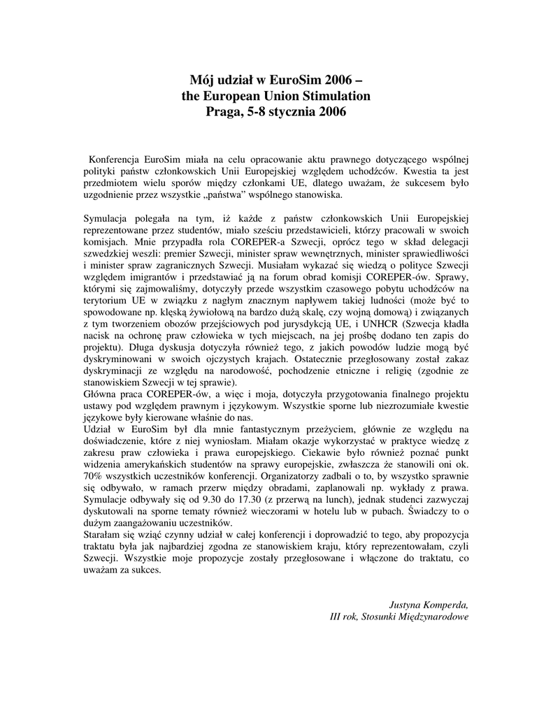Mój udział w EuroSim 2006 – the European Union Stimulation Praga, 5-8 stycznia 2006 Konferencja EuroSim miała na celu opracowanie aktu prawnego dotyczącego wspólnej polityki państw członkowskich Unii Europejskiej względem uchodźców. Kwestia ta jest przedmiotem wielu sporów między członkami UE, dlatego uważam, że sukcesem było uzgodnienie przez wszystkie „państwa” wspólnego stanowiska. Symulacja polegała na tym, iż każde z państw członkowskich Unii Europejskiej reprezentowane przez studentów, miało sześciu przedstawicieli, którzy pracowali w swoich komisjach. Mnie przypadła rola COREPER-a Szwecji, oprócz tego w skład delegacji szwedzkiej weszli: premier Szwecji, minister spraw wewnętrznych, minister sprawiedliwości i minister spraw zagranicznych Szwecji. Musiałam wykazać się wiedzą o polityce Szwecji względem imigrantów i przedstawiać ją na forum obrad komisji COREPER-ów. Sprawy, którymi się zajmowaliśmy, dotyczyły przede wszystkim czasowego pobytu uchodźców na terytorium UE w związku z nagłym znacznym napływem takiej ludności (może być to spowodowane np. klęską żywiołową na bardzo dużą skalę, czy wojną domową) i związanych z tym tworzeniem obozów przejściowych pod jurysdykcją UE, i UNHCR (Szwecja kładła nacisk na ochronę praw człowieka w tych miejscach, na jej prośbę dodano ten zapis do projektu). Długa dyskusja dotyczyła również tego, z jakich powodów ludzie mogą być dyskryminowani w swoich ojczystych krajach. Ostatecznie przegłosowany został zakaz dyskryminacji ze względu na narodowość, pochodzenie etniczne i religię (zgodnie ze stanowiskiem Szwecji w tej sprawie). Główna praca COREPER-ów, a więc i moja, dotyczyła przygotowania finalnego projektu ustawy pod względem prawnym i językowym. Wszystkie sporne lub niezrozumiałe kwestie językowe były kierowane właśnie do nas. Udział w EuroSim był dla mnie fantastycznym przeżyciem, głównie ze względu na doświadczenie, które z niej wyniosłam. Miałam okazje wykorzystać w praktyce wiedzę z zakresu praw człowieka i prawa europejskiego. Ciekawie było również poznać punkt widzenia amerykańskich studentów na sprawy europejskie, zwłaszcza że stanowili oni ok. 70% wszystkich uczestników konferencji. Organizatorzy zadbali o to, by wszystko sprawnie się odbywało, w ramach przerw między obradami, zaplanowali np. wykłady z prawa. Symulacje odbywały się od 9.30 do 17.30 (z przerwą na lunch), jednak studenci zazwyczaj dyskutowali na sporne tematy również wieczorami w hotelu lub w pubach. Świadczy to o dużym zaangażowaniu uczestników. Starałam się wziąć czynny udział w całej konferencji i doprowadzić to tego, aby propozycja traktatu była jak najbardziej zgodna ze stanowiskiem kraju, który reprezentowałam, czyli Szwecji. Wszystkie moje propozycje zostały przegłosowane i włączone do traktatu, co uważam za sukces. Justyna Komperda, III rok, Stosunki Międzynarodowe