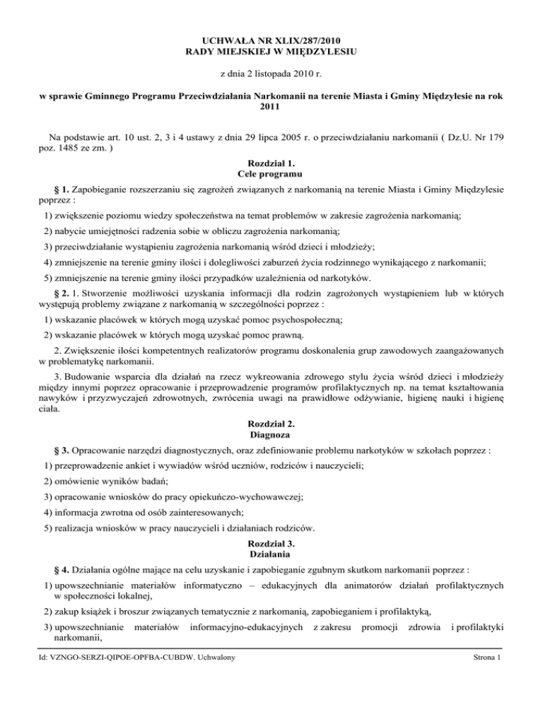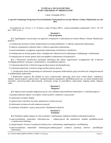 UCHWAŁA NR XLIX/287/2010 RADY MIEJSKIEJ W MIĘDZYLESIU z dnia 2 listopada 2010 r. w sprawie Gminnego Programu Przeciwdziałania Narkomanii na terenie Miasta i Gminy Międzylesie na rok 2011 Na podstawie art. 10 ust. 2, 3 i 4 ustawy z dnia 29 lipca 2005 r. o przeciwdziałaniu narkomanii ( Dz.U. Nr 179 poz. 1485 ze zm. ) Rozdział 1. Cele programu § 1. Zapobieganie rozszerzaniu się zagrożeń związanych z narkomanią na terenie Miasta i Gminy Międzylesie poprzez : 1) zwiększenie poziomu wiedzy społeczeństwa na temat problemów w zakresie zagrożenia narkomanią; 2) nabycie umiejętności radzenia sobie w obliczu zagrożenia narkomanią; 3) przeciwdziałanie wystąpieniu zagrożenia narkomanią wśród dzieci i młodzieży; 4) zmniejszenie na terenie gminy ilości i dolegliwości zaburzeń życia rodzinnego wynikającego z narkomanii; 5) zmniejszenie na terenie gminy ilości przypadków uzależnienia od narkotyków. § 2. 1. Stworzenie możliwości uzyskania informacji dla rodzin zagrożonych wystąpieniem lub w których występują problemy związane z narkomanią w szczególności poprzez : 1) wskazanie placówek w których mogą uzyskać pomoc psychospołeczną; 2) wskazanie placówek w których mogą uzyskać pomoc prawną. 2. Zwiększenie ilości kompetentnych realizatorów programu doskonalenia grup zawodowych zaangażowanych w problematykę narkomanii. 3. Budowanie wsparcia dla działań na rzecz wykreowania zdrowego stylu życia wśród dzieci i młodzieży między innymi poprzez opracowanie i przeprowadzenie programów profilaktycznych np. na temat kształtowania nawyków i przyzwyczajeń zdrowotnych, zwrócenia uwagi na prawidłowe odżywianie, higienę nauki i higienę ciała. Rozdział 2. Diagnoza § 3. Opracowanie narzędzi diagnostycznych, oraz zdefiniowanie problemu narkotyków w szkołach poprzez : 1) przeprowadzenie ankiet i wywiadów wśród uczniów, rodziców i nauczycieli; 2) omówienie wyników badań; 3) opracowanie wniosków do pracy opiekuńczo-wychowawczej; 4) informacja zwrotna od osób zainteresowanych; 5) realizacja wniosków w pracy nauczycieli i działaniach rodziców. Rozdział 3. Działania § 4. Działania ogólne mające na celu uzyskanie i zapobieganie zgubnym skutkom narkomanii poprzez : 1) upowszechnianie materiałów informatyczno – edukacyjnych dla animatorów działań profilaktycznych w społeczności lokalnej, 2) zakup książek i broszur związanych tematycznie z narkomanią, zapobieganiem i profilaktyką, 3) upowszechnianie narkomanii, materiałów informacyjno-edukacyjnych Id: VZNGO-SERZI-QIPOE-OPFBA-CUBDW. Uchwalony z zakresu promocji zdrowia i profilaktyki Strona 1 4) prowadzenie szkoleń podnoszących kwalifikacje zawodowe osób realizujących zadania profilaktyczne, w szczególności dla pracowników placówek oświatowych, 5) prowadzenie zajęć na temat „ uczenia dzieci sztuki odmawiania”: a) prowadzenie lekcji, ścieżek edukacyjnych i apeli z uwzględnieniem profilaktyki narkomanii; b) systematyczne wydawanie gazetki szkolnej. 6) wykorzystanie ofert programów profilaktyczno – wychowawczych uwzględniających inscenizację teatralną do przekazu treści profilaktycznych, 7) zapoznanie uczniów z elementami ustawy o przeciwdziałaniu narkomanii, 8) udział uczniów w konkursach : a) w kampaniach edukacyjno – profilaktycznych, b) w programach ogólnopolskich, 9) opracowanie i realizacja Szkolnych Programów Przeciwdziałania Narkomanii. § 5. Profilaktyka antynarkotykowa poprzez rodzinę a to : 1) organizowanie i finansowanie programów edukacyjnych dla rodziców, 2) zacieśnienie więzi pomiędzy rodzicami a szkołą: a) pogadanki z rodzicami, b) otwarte dyskusje z dziećmi, wychowawcami i rodzicami na temat zdrowego stylu życia, c) indywidualne kontakty z rodzicami uczniów, którzy mogą mieć kontakt z narkotykami, d) pomoc psychologa i pedagoga. § 6. Przygotowanie nauczycieli do prowadzenia działań profilaktycznych poprzez : 1) organizowanie szkoleń i warsztatów dla nauczycieli : a) w zakresie rozpoznawania problemu narkomanii i udzielenia pomocy, b) na temat psychologiczno – społecznych uwarunkowań agresji wśród młodzieży z uwzględnieniem wpływu środków odurzających na wzrost zachowań agresywnych. 2) doposażenie biblioteki szkolnej w stosowną literaturę fachową, 3) przyłączenie się do koalicji organizacji i instytucji, chcących wspierać i podejmować działania na rzecz przeciwdziałania przemocy wśród dzieci, będącej m.in. przyczyną narkomanii. § 7. Współdziałanie szkoły z instytucjami zajmującymi się problematyką narkomanii: 1) Organizacja spotkań z przedstawicielami organizacji zaangażowanych w przeciwdziałanie narkomanii : a) sądowym kuratorem społecznym i zawodowym, b) funkcjonariuszem Policji, c) pielęgniarką Niepublicznego Zakładu Opieki Zdrowotnej, d) pracownikiem socjalnym Ośrodka Pomocy Społecznej, e) pracownikiem Miejsko Gminnego Ośrodka Kultury. 2) Nawiązanie współpracy z : a) z Poradnią Psychologiczno – pedagogiczną w Bystrzycy Kłodzkiej, b) z Powiatowym Centrum Pomocy Rodzinie w Kłodzku, c) z Krajowym Biurem ds. Przeciwdziałania Narkomanii. § 8. Współpraca z lokalna służbą zdrowia. Id: VZNGO-SERZI-QIPOE-OPFBA-CUBDW. Uchwalony Strona 2 1) Udostępnianie i przekazywanie szkołom materiałów informacyjnych ( broszur, ulotek i innych publikacji) o tematyce antynarkotykowej. 2) Współpraca z organizacjami i instytucjami zajmującymi się fachowym udzielaniem pomocy osobom uzależnionym i działalnością profilaktyczną. 3) Profilaktyka i przeciwdziałanie medycznym skutkom przyjmowania narkotyków. 4) Rozpoznawanie przypadków używania narkotyków. 5) Pomoc szkołom w zakresie diagnozowania uzależnień i prowadzenie działań profilaktycznych. 6) Badania lekarskie dzieci i młodzieży. 7) Zorganizowanie przez lekarzy i higienistki spotkań z młodzieżą ( pogadanki, dyskusje). 8) Wyjaśnienie dzieciom i młodzieży spirali uzależnie