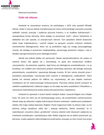 Katarzyna Szumlewicz Ciała nie własne Amatorki to stosunkowo wczesna, bo pochodząca z 1975 roku powieść Elfriede Jelinek, widać w niej już jednak charakterystyczne cechy mistrzowskiego warsztatu przyszłej noblistki: ostrość, precyzję i szydercze poczucie humoru, a ze środków stylistycznych – awangardową formę literacką, która polega na prezentacji myśli i odczuć bohaterów w dokładnie ten sam sposób, co zewnętrznych zdarzeń. Tym sposobem Jelinek skutecznie obala iluzję indywidualizmu i potrafi niejako na gorącym uczynku uchwycić działanie mechanizmów ideologicznych, które nie są produktem tego czy innego poszczególnego umysłu, ale działają w przestrzeni międzyludzkiej, wyznaczając postaciom miejsca i role w obrębie zaprogramowanych przez ideologię struktur. Jelinek jest jednak daleka od uproszczeń. Nawet poststrukturalizmu nie uważa za ostatnie słowo. Nie zgadza się z konstatacją, że język jest ostatecznym źródłem rzeczywistości. Jej pisarstwo wyjaśnia, skąd biorą się ideologiczne przeświadczenia i co je kształtuje. Ich źródłem jest mianowicie podział materialnej własności, dla którego stanowią potwierdzenie, uzasadnienie i gwarancję dalszego trwania. W tym sensie stosunki pracy i posiadania poprzedzają i wyznaczają treści zawarte w ideologicznej „nadbudowie”, która jednak nie stanowi jedynie ich odbicia czy racjonalizacji, ale jest niejako motorem niezbędnym do ich nieprzerwanego funkcjonowania. Pisarstwo Jelinek potrafi uchwycić te subtelne współzależności i dokonać czegoś, co nie udaje się wielu socjolożkom i filozofkom, a mianowicie materialistycznej analizy dyskursów patriarchatu i kapitalizmu. Amatorki to opowieść o losach dwóch młodych kobiet: szwaczki Brigitte oraz chłopki Pauli. Ich życie nie różni się od stereotypowego wzoru, ale przedmiotem zainteresowania Jelinek stają się zależności między kulturowymi kliszami zachowań i społecznymi praktykami władzy. Nie mając żadnej własności, Brigitte i Paula mogą liczyć tylko na własne ciała i za ich pomocą usiłują wywalczyć sobie byt i pozycję społeczną. Warto zauważyć, że w najściślejszym znaczeniu słowo „proletariat” oznacza właśnie ludzi skazanych wyłącznie na możliwości produkcyjne i reprodukcyjne ciała. Walka rozgrywa się na dwóch poziomach: po pierwsze, trzeba zapewnić sobie biologiczne przetrwanie, pracując na rzecz innych (czy praca ta będzie opłacana, czy nie), po drugie należy uzyskać jak najwyższą cenę na „rynku kobiet”, gdzie najważniejsza okazuje się fizyczna atrakcyjność. Od tego ostatniego zależy na ogół to pierwsze, dlatego tak ważne jest, żeby przyćmić inne kobiety i stać się wybranym towarem, za który męski konsument będzie w stanie wiele zapłacić. W powieści Jelinek roi się od określeń demaskujących wystawienie kobiecego ciała na sprzedaż. Dla Brigitte podstawowym problemem jest to, że poza nią „dostępnych jest na rynku wiele innych ciał, jedyne, co jej pomaga, to przemysł kosmetyczny. i przemysł tekstylny. brigitte posiada biust, uda, nogi, biodra i cipkę”. Problem w tym, że „inne też to mają, czasami nawet lepszej jakości”. Innym atutem bohaterki jest młodość, „którą musi dzielić z innymi, na przykład z fabryką, jej hałasem i z przepełnionym autobusem”. Młodość jednak nie jest cechą trwałą; „brigitte ma coraz więcej lat i coraz mniej jest kobietą, konkurencja ma coraz mniej lat i coraz więcej jest kobietą”. Walka z konkurencją sprawia, że kobiety „zamiast mebli z połyskiem kupują nylonowe rajstopy, sweterki i mini spódniczki – jako lokatę inwestycyjną”. Bohaterki Jelinek nie mylą się w swoich działaniach, nie cenią tego, co mniej ważne bardziej niż tego, co ważniejsze. Są posłuszne patriarchalnej ideologii właśnie dlatego, że doskonale zdają sobie sprawę z tego, jak wygląda rzeczywistość. Największy kłopot z nowoczesnym patriarchatem polega bowiem na tym, że w jego obrębie opisane w Amatorkach zachowania naprawdę przynoszą efekt, a przypisywanie kobiecie roli towaru, które leży u ich źródeł, to częstokroć po prostu opis społecznej realności. Innymi słowy, ideologii należy szukać nie na poziomie tego, co się myśli o panujących stosunkach, ale w samych tych stosunkach. Wybranek ubogiej i niewykształconej Brigitte, Heinz „w tym szczególnym wypadku oznacza życie. prawdziwe życie nie tylko oznacza heinza, ono naprawdę nim jest”. Dlaczego? Ponieważ „heinz ma przed sobą przyszłość; brigitte nie ma nawet teraźniejszości”. Kobieta jest w tym związku „nikim, czyli kimś, kim każdy inny mógłby być bez większego wysiłku”. Brigitte nie ma bowiem żadnej własności, cenionych na rynku kwalifikacji czy kapitału kulturowego, co stawia ją w sytuacji pełnego uzależnienia od mężczyzny, dysponującego jakimi takimi widokami na przyszłość. Ta nierówność znajduje drastyczne odbicie w życiu erotycznym. Służy ono wyłącznie jednej stronie; dla drugiej to ciężka i odstręczająca praca. Oto jak wypada lapidarne porównanie ról seksualnych: „brigitte odczuwa w swoim ciele nieprzyjemne uczucie, heinz przyjemne. ciało dla brigitte to droga do lepszego celu. ciało dla heinza to prawie wszystko, na równi z zawodową karierą. i dobrym jedzeniem! dla heinza to przyjemność, dla brigitte nie. dla heinza to przyjemność, a nie żarty. brigitte nie ma z tego nic, jedynie kroczącą noga za nogą nadzieję. brigitte ma poza tym krocze. robi z niego użytek. krocze brigitte łapczywie chwyta się młodego przedsiębiorcy”. Pomimo obrzydzenia do partnera „brigitte nie przychodzi do głowy, żeby powiedzieć zostaw mnie w spokoju”, nawet gdy Heinz „zwala się na nią jak zaćmienie słońca lub jakaś inna klęska żywiołowa”. Satysfakcja kobiety nie odgrywa w tym związku najmniejszej roli. Istnieje tylko chłodny rac