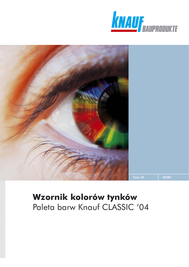 Classic ‘04 Wzornik kolorów tynków Paleta barw Knauf CLASSIC ‘04 08/2007 ZALECENIA: Nie nale¿y nak³adaæ tynku na œciany silnie nas³onecznione, a wykonan¹ wyprawê tynkarsk¹ chroniæ przed opadami deszczu oraz chroniæ przed zbyt szybkim wysychaniem przez minimum 24 godziny, a w warunkach du¿ej wilgotnoœci powietrza i niskich temperatur do 3 dni. Paleta barw Knauf CLASSIC ’04 Do wyboru: 275 kolorów oraz 4 odcienie bieli. Korzystaj z wiedzy, bêd¹cej wynikiem opracowanych w szczegó³ach studiów oraz stuletnich doœwiadczeñ, dokonaj wyboru z szerokiej palety odcieni barw, które dla Ciebie troskliwie przygotowa³a firma Knauf Bauprodukte. Ka¿dy z nas dysponuje jasnym wyobra¿eniem atmosfery, jak¹ chce uzyskaæ w poszczególnych pomieszczeniach naszego mieszkania. Ktoœ chce mieæ pokój, który bêdzie œwie¿y i pobudzaj¹cy, ktoœ inny chce mieæ przytulnie, a jeszcze ktoœ inny szuka spokoju, koncentracji i jasnoœci. To jednak nie dotyczy tylko i wy³¹cznie wnêtrz. Proszê pamiêtaæ, ¿e równie¿ kolorowe tynki i fasady zewnêtrzne naszych domów w znacznym stopniu okreœlaj¹ wygl¹d ca³ych ulic, jak i w³¹czenie domu do jego bezpoœredniego otoczenia. Poœwieæmy wiêc wiêcej naszej uwagi wyborowi barw i kolorów przy projektowaniu naszego domostwa. Mo¿e przy tej okazji odkryjemy sami siebie. Chyba ka¿dy z nas choæ raz w ¿yciu decydowa³ o wyborze koloru, i wiêkszoœæ mog³a siê przekonaæ, i¿ ten rodzaj wyboru nie nale¿y do naj³atwiejszych. Dlatego te¿ warto odwo³aæ siê do pomocy fachowca - zwróæcie siê z zaufaniem do profesjonalnie wyszkolonych przedstawicieli firmy Knauf Bauprodukte, którzy dziêki swemu wieloletniemu doœwiadczeniu doradz¹ Wam w wyborze najbardziej odpowiednich materia³ów w³aœnie dla Waszego domu. Unikaæ prac monta¿owych i tynkarskich przy silnym wietrze oraz wysokiej temperaturze otoczenia, które mog¹ powodowaæ zbyt szybkie odparowanie wody z wyprawy. Utrudnione jest wtedy zacieranie oraz pojawiaj¹ siê rysy na powierzchni tynku. Zaleca siê stosowanie os³on na rusztowaniach. W wyniku powy¿szych czynników mog¹ wyst¹piæ ró¿nice w odcieniach kolorów na jednej powierzchni. Nie jest to wad¹ techniczn¹ produktu jednak czêsto prowadzi do niezadowalaj¹cego efektu koñcowego. W celu wyrównania koloru oraz dodatkowego zabezpieczenia tynku nale¿y zastosowaæ Knauf Silikonow¹ farbê egalizacyjn¹ w danym odcieniu koloru. Kolory wystêpuj¹ce we wzorniku mog¹ nieznacznie odbiegaæ od rzeczywistych w wyniku ró¿nicy struktur pod³o¿a, warunków schniêcia oraz sposobu nak³adania farby. Malowanie Knauf farb¹ silikonow¹ mo¿liwe jest nie wczeœniej ni¿ po 7 dniach od na³o¿enia tynku. Tynki bia³e malowane na kolor wymagaj¹ przynajmniej dwukrotnego malowania. Niniejsze informacje okreœlaj¹ zakres stosowania materia³u i zalecany sposób prowadzenia robót, ale nie mog¹ zast¹piæ zawodowego przygotowania wykonawcy. Oprócz podanych zaleceñ, prace nale¿y wykonywaæ zgodnie ze sztuk¹ budowlan¹ i zasadami BHP. Producent gwarantuje jakoœæ wyrobu, natomiast nie ma wp³ywu na warunki i sposób jego u¿ycia. W przypadku w¹tpliwoœci nale¿y wykonaæ w³asne próby stosowania. C 100 PG I C 101 PG I C 102 PG I C 104 PG I C 3000 PG II C 3001 PG II C 3002 PG II C 3003 PG II C 3004 PG II C 3010 PG III C 3011 PG III C 3012 PG II C 3013 PG II C 3014 PG II C 3020 PG III C 3021 PG III C 3022 PG II C 3023 PG II C 3024 PG II C 3030 PG III C 3031 PG III C 3032 PG II C 3033 PG II C 3034 PG II C 3040 PG III C 3041 PG III C 3042 PG II C 3043 PG II C 3044 PG II C 3050 PG II C 3051 PG II C 3052 PG II C 3053 PG II C 3054 PG II C 3060 PG III C 3061 PG II C 3062 PG II C 3063 PG II C 3064 PG II C 3070 PG III C 3071 PG II C 3072 PG II C 3073 PG II C 3074 PG II Przedstawiona w formie niniejszego opracowania paleta barw Knauf pełni jedynie funkcję informacyjną. C 3080 PG II C 3081 PG II C 3082 PG II C 3083 PG II C 3084 PG II C 3090 PG III C 3091 PG II C 3092 PG II C 3093 PG II C 3094 PG II C 3100 PG III C 3101 PG II C 3102 PG II C 3103 PG II C 3104 PG II C 3110 PG III C 3111 PG III C 3112 PG II C 3113 PG II C 3114 PG II C 3120 PG III C 3121 PG III C 3122 PG II C 3123 PG II C 3124 PG II Decyzję o wyborze koloru produktu należy podejmować jedynie na podstawie aktualnej palety barw Knauf dostępnej w formie firmowych materiałów informacyjnych (tablice, wzorniki listkowe). Zawarte tam próbki kolorystyczne wykonane są z autentycznych wyrobów lub materiałów je imitujących. Wydawnictwa te dostępne są w punktach handlowych oraz u doradców technicznych i przedstawicieli handlowych Knauf Bauprodukte Polska Sp. z o.o. Różnice w odcieniach kolorów konkretnych wyrobów a odpowiednikami tych kolorów zawartymi w niniejszym opracowaniu nie mogą stanowić podstawy do jakichkolwiek roszczeń w stosunku do firmy Knauf Bauprodukte Polska Sp. z o.o. 02 – 03 C 3130 PG III C 3131 PG II C 3132 PG II C 3133 PG II C 3134 PG II C 3140 PG III C 3141 PG III C 3142 PG II C 3143 PG II C 3144 PG II C 3150 PG III C 3151 PG III C 3152 PG II C 3153 PG II C 3154 PG II C 3160 PG II C 3161 PG II C 3162 PG II C 3163 PG II C 3164 PG II C 3170 PG II C 3171 PG II C 3172 PG II C 3173 PG II C 3174 PG II C 3180 PG III C 3181 PG III C 3182 PG III C 3183 PG II C 3184 PG II C 3190 PG III C 3191 PG III C 3192 PG III C 3193 PG III C 3194 PG II C 3200 PG III C 3201 PG III C 3202 PG III C 3203 PG III C 3204 PG II C 3210 PG III C 3211 PG III C 3212 PG III C 3213 PG III C 3214 PG II C 3220 PG III C 3221 PG III C 3222 PG III C 3223 PG III C 3224 PG II C 3230 PG III C 3231 PG III C 3232 PG III C 3233 PG III C 3234 PG II C 3240 PG III C 3241 PG III C 3242 PG III C 3243 PG II C 3244 PG II C 3250 PG III C 3251 PG III C 3252 PG III C 3253 PG III C 3254 PG II C 3260 PG III C 3261 PG III C 3262 PG III C 3263 PG III C 3264 PG II C 3270 PG III C 3271 PG III C 3272 PG III C 3273 PG III C 3274 PG II C 3280 PG III C 3281 PG III C 3282 PG III C 3283 PG III C