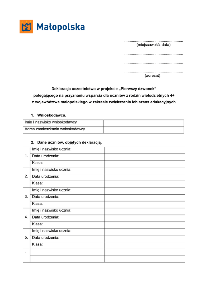 ....................................................... (miejscowość, data) ....................................................... ....................................................... ....................................................... (adresat) Deklaracja uczestnictwa w projekcie „Pierwszy dzwonek” polegającego na przyznaniu wsparcia dla uczniów z rodzin wielodzietnych 4+ z województwa małopolskiego w zakresie zwiększania ich szans edukacyjnych 1. Wnioskodawca. Imię I nazwisko wnioskodawcy Adres zamieszkania wnioskodawcy 2. Dane uczniów, objętych deklaracją. Imię i nazwisko ucznia: 1. Data urodzenia: Klasa: Imię i nazwisko ucznia: 2. Data urodzenia: Klasa: Imię i nazwisko ucznia: 3. Data urodzenia: Klasa: Imię i nazwisko ucznia: 4. Data urodzenia: Klasa: Imię i nazwisko ucznia: 5. Data urodzenia: Klasa: . 3. Liczba dzieci w rodzinie wielodzietnej 4+: …………… ………………………………….. (miejscowość i data) ………………………………….. (podpis wnioskodawcy) dziecko– należy przez to rozumieć dziecko w wieku do 18 roku życia lub pozostające na utrzymaniu rodziców lub rodzica/opiekunów lub opiekuna prawnego dziecko do 24 roku życia, uczące się lub studiujące, uczeń– należy przez to rozumieć dziecko uczęszczające do szkoły podstawowej, gimnazjum lub szkoły ponadgimnazjalnej, rodzina wielodzietna 4+ – należy przez to rozumieć rodzinę, składającą się z rodziców lub rodzica/ opiekunów lub opiekuna prawnego oraz 4 lub więcej dzieci(przy czym przynajmniej jedno z dzieci jest uczniem), i której wszyscy członkowie mający status ucznia zamieszkują na obszarze województwa małopolskiego Oświadczenie Oświadczam, co następuje: 1. Zapoznałem/łam się z regulaminem projektu „Pierwszy dzwonek”, polegającego na przyznaniu dotacji dla gmin na udzielenie wsparcia dla uczniów z rodzin wielodzietnych 4+ z województwa małopolskiego w zakresie zwiększania ich szans edukacyjnych, 2. Spełniam kryteria udziału określone w ww. regulaminie, 3. Wyrażam zgodę na przetwarzanie zawartych w deklaracjidanych osobowych moich oraz moich dzieci/osób pozostających pod moją opieką i przyjmuję do wiadomości, że: 1) administratorem moich danych osobowych jest Gmina…………., adres: ……. 2) podstawę prawną przetwarzania moich danych osobowych stanowi art. 23 ust. 1 pkt 1 ustawy z dnia 29 sierpnia 1997 r. o ochronie danych osobowych (Dz. U. z 2002 r. Nr 101, poz. 926 z późn. zm.); 3) dane osobowe zawarte w deklaracji będą przetwarzane wyłącznie w celu przeprowadzenia procedury przyznania przez Województwo Małopolskie dotacji celowych dla gmin na udzielenie wsparcia oraz procedury przyznania i rozliczenia przez gminy tego wsparcia; 4) dane osobowe zawarte w deklaracji zostaną powierzone do przetwarzania Urzędowi Marszałkowskiemu Województwa Małopolskiego i Regionalnemu Ośrodkowi Polityki Społecznej w Krakowie; 5) podanie danych jest dobrowolne, aczkolwiek odmowa ich podania jest równoznaczna z brakiem możliwości udzielenia wsparcia; 6) mam prawo dostępu do treści danych osobowych zawartych w deklaracji ich poprawiania. 4. Zobowiązuję się do wydatkowania kwoty otrzymanego wsparcia zgodnie z przeznaczeniem określonym w regulaminie. 5. Dane podane w deklaracji są prawdziwe. 6. W przypadku podania w deklaracji nieprawdziwych danych lub w przypadku wydatkowania kwoty otrzymanego wsparcia niezgodnie z przeznaczeniem określonym w regulaminie, zobowiązuję się do zwrotu Gminie ………. kwoty stanowiącej równowartość przyznanego wsparcia. ………………………………….. (miejscowość i data) ………………………………….. (podpis wnioskodawcy)